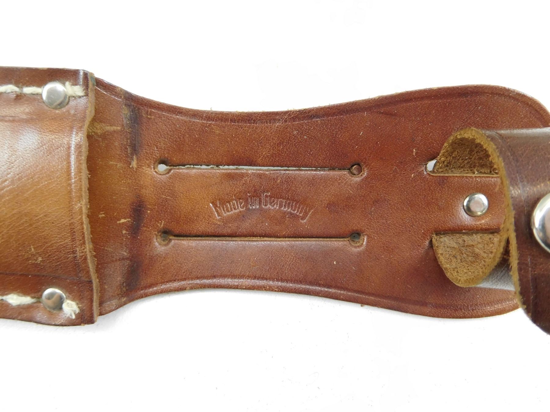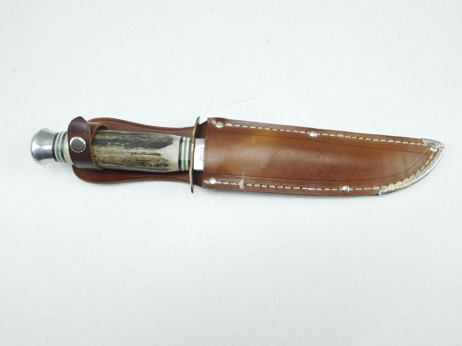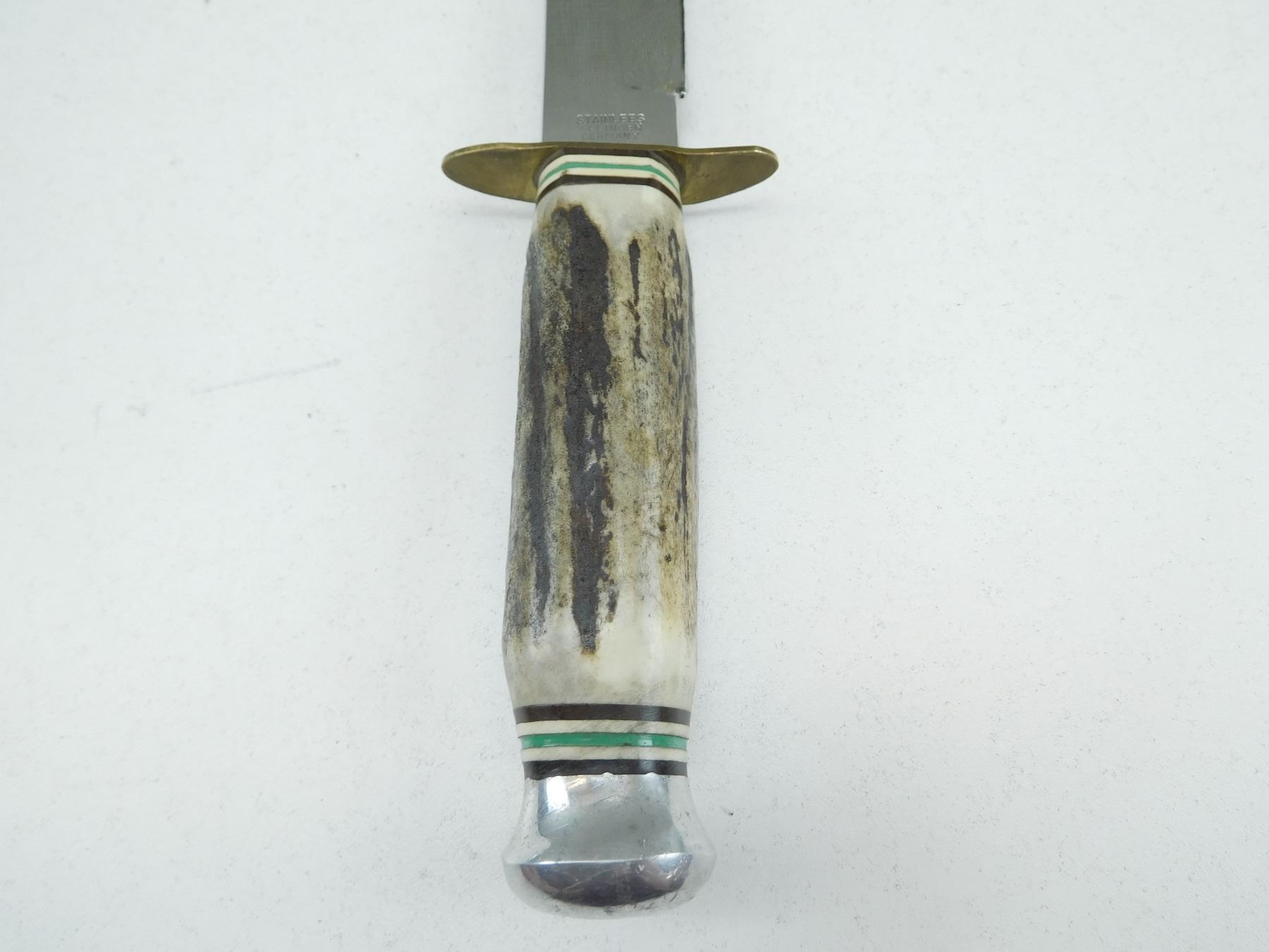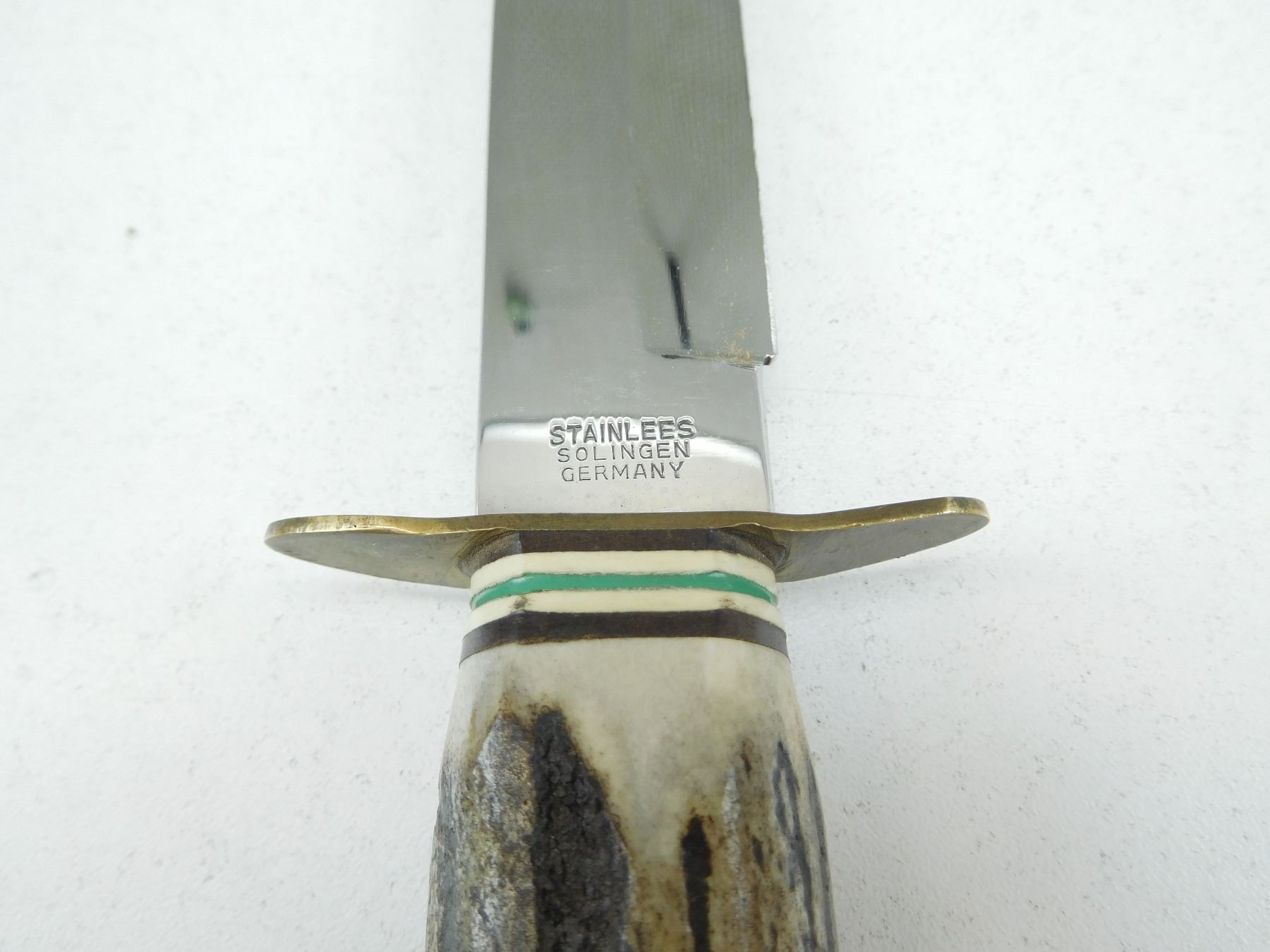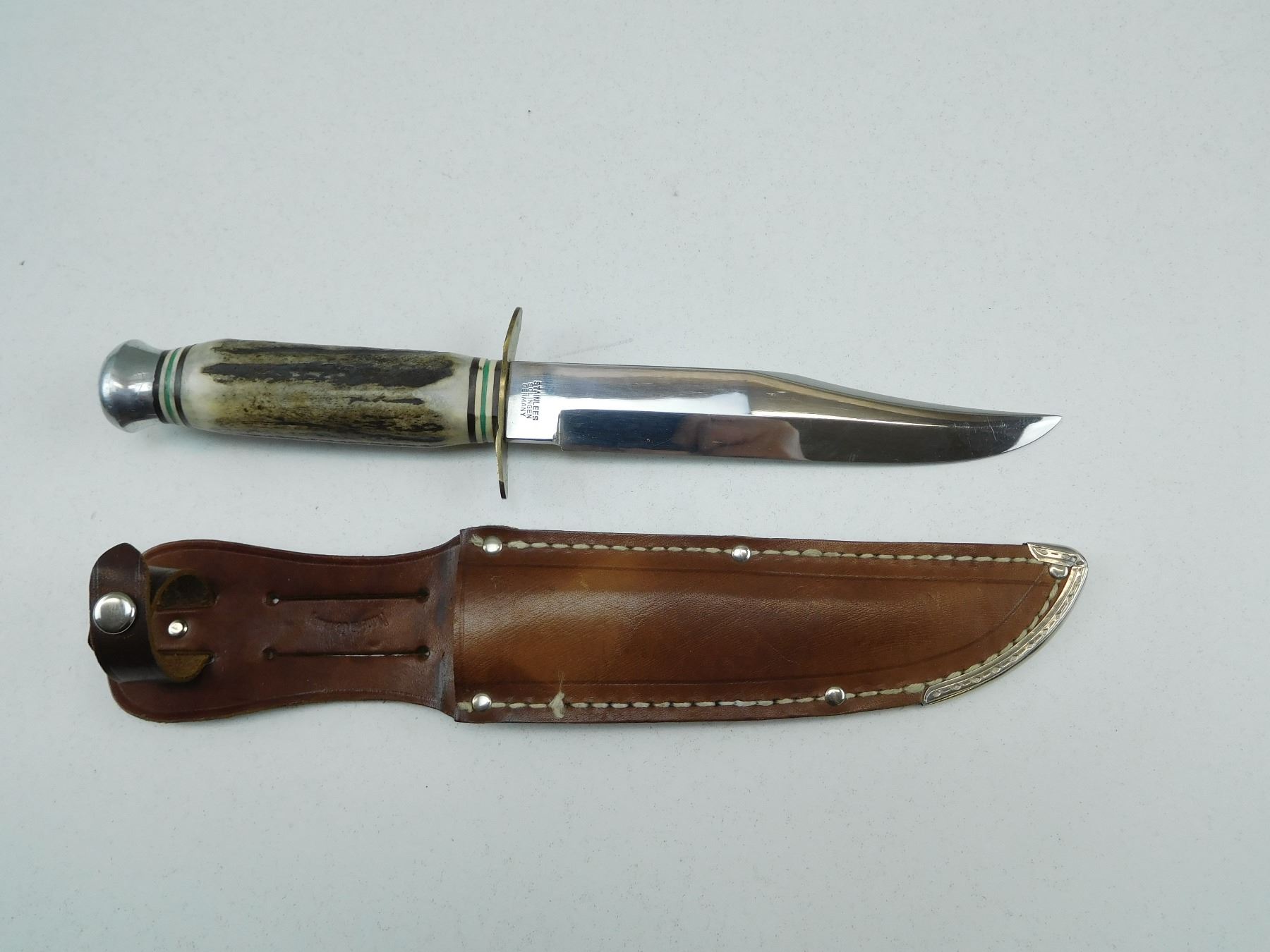 BLADE IS STAMPED STAINLESS SOLINGEN GERMANY, ANTLER HANDLE, WITH MATCHING LEATHER SHEATH