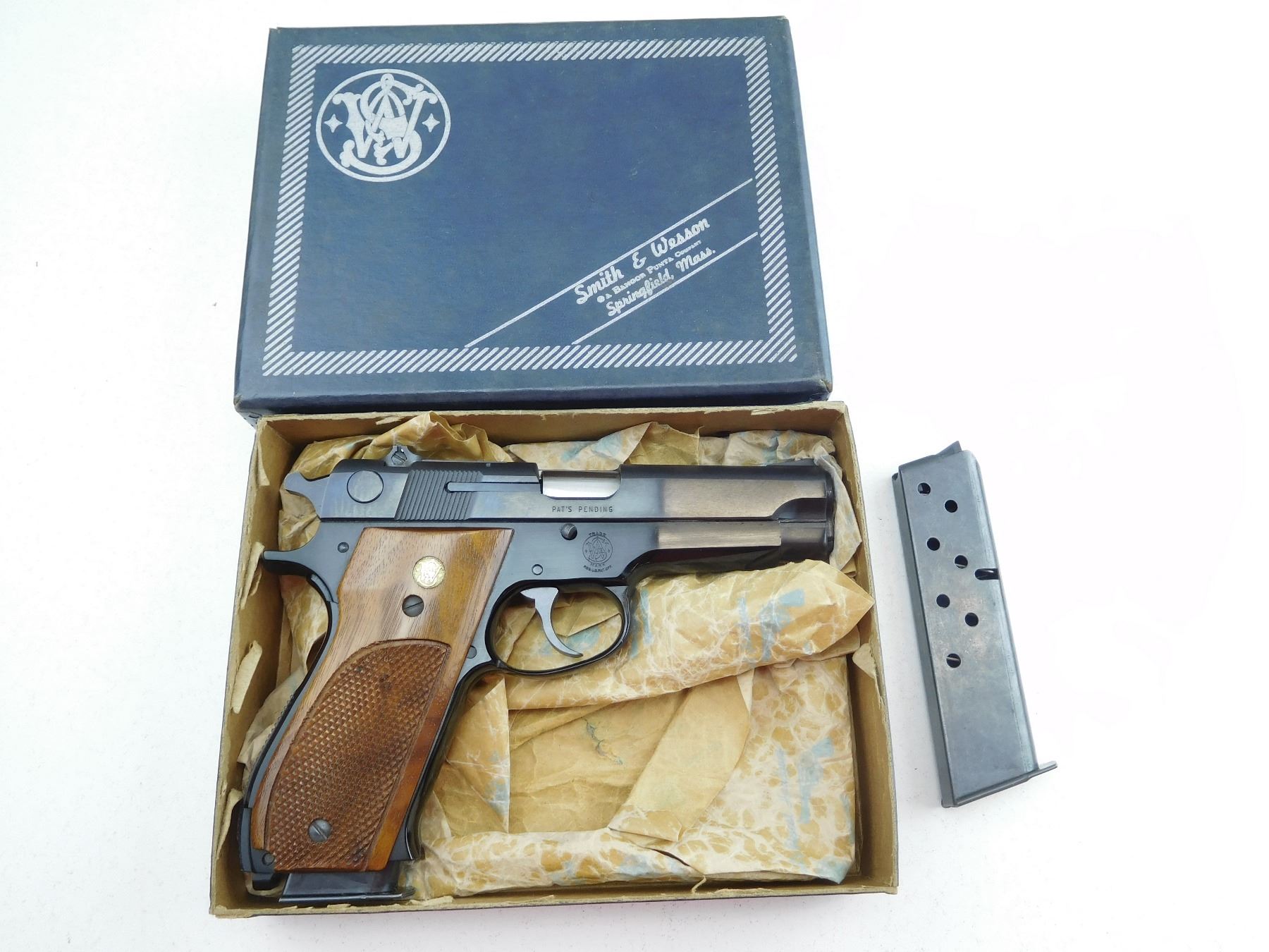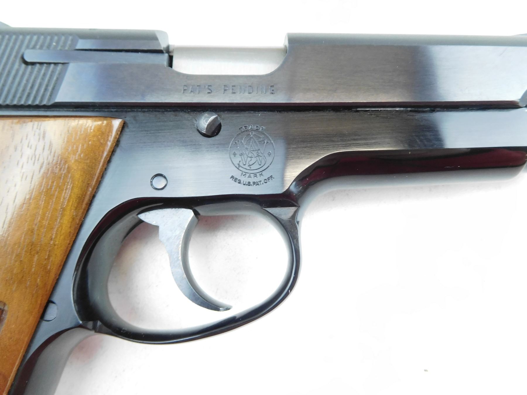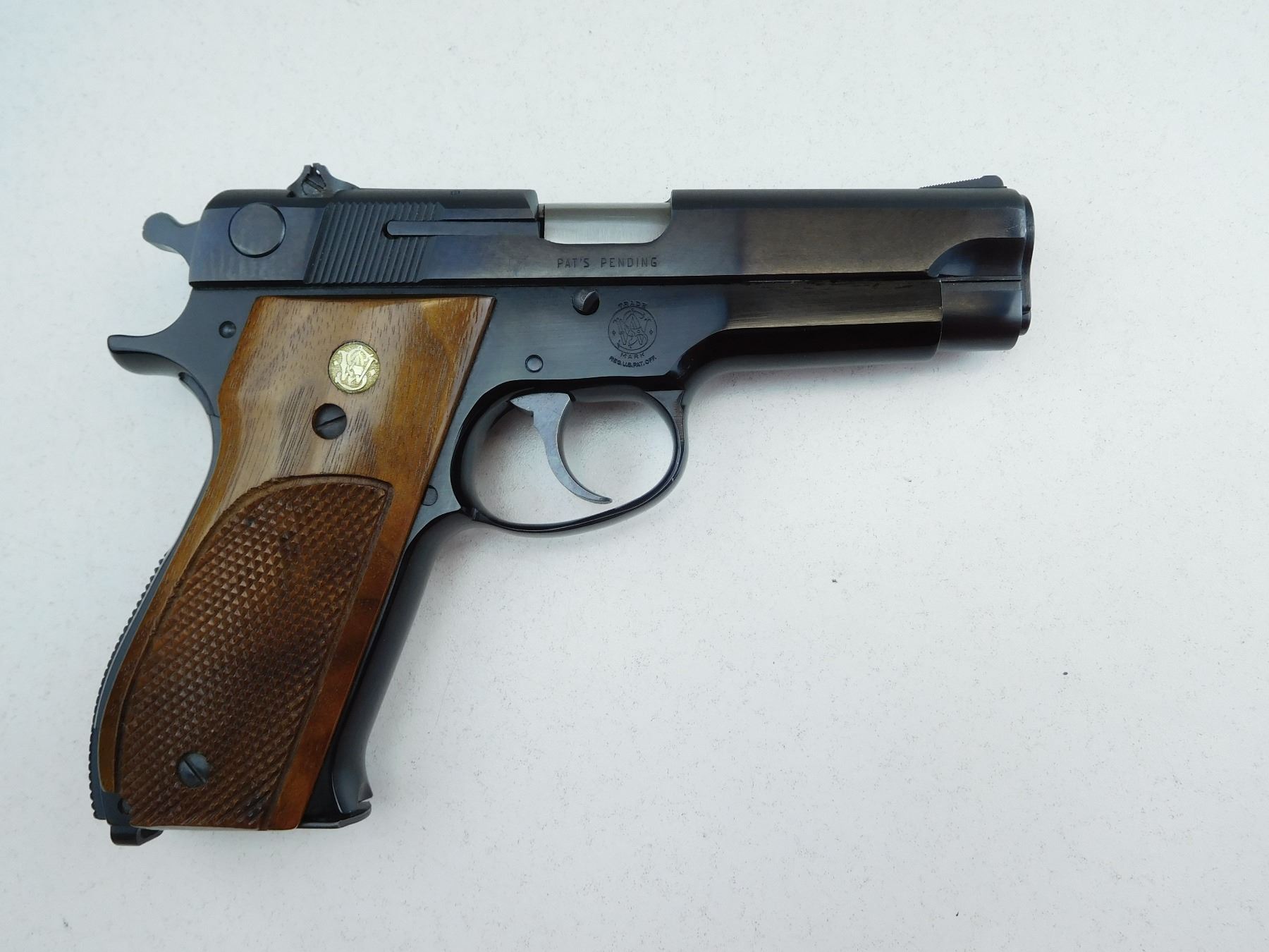 COMES WITH BOX, AND MAGAZINE, RAMP FRONT AND ADJUSTABLE REAR SIGHTS, VERY GOOD BORE, SMITH & WESSON WOOD GRIP PANELS, SHOWS VERY LITTLE HANDLING MARKS , SERIAL # A307779 , ACTION: SEMI AUTOMATIC HANDGUN , BARREL LENGTH: 101MM , CONDITION: 9/10 , STOCK # P1995 , CLASS: CANADIAN PROHIBITED CLASS