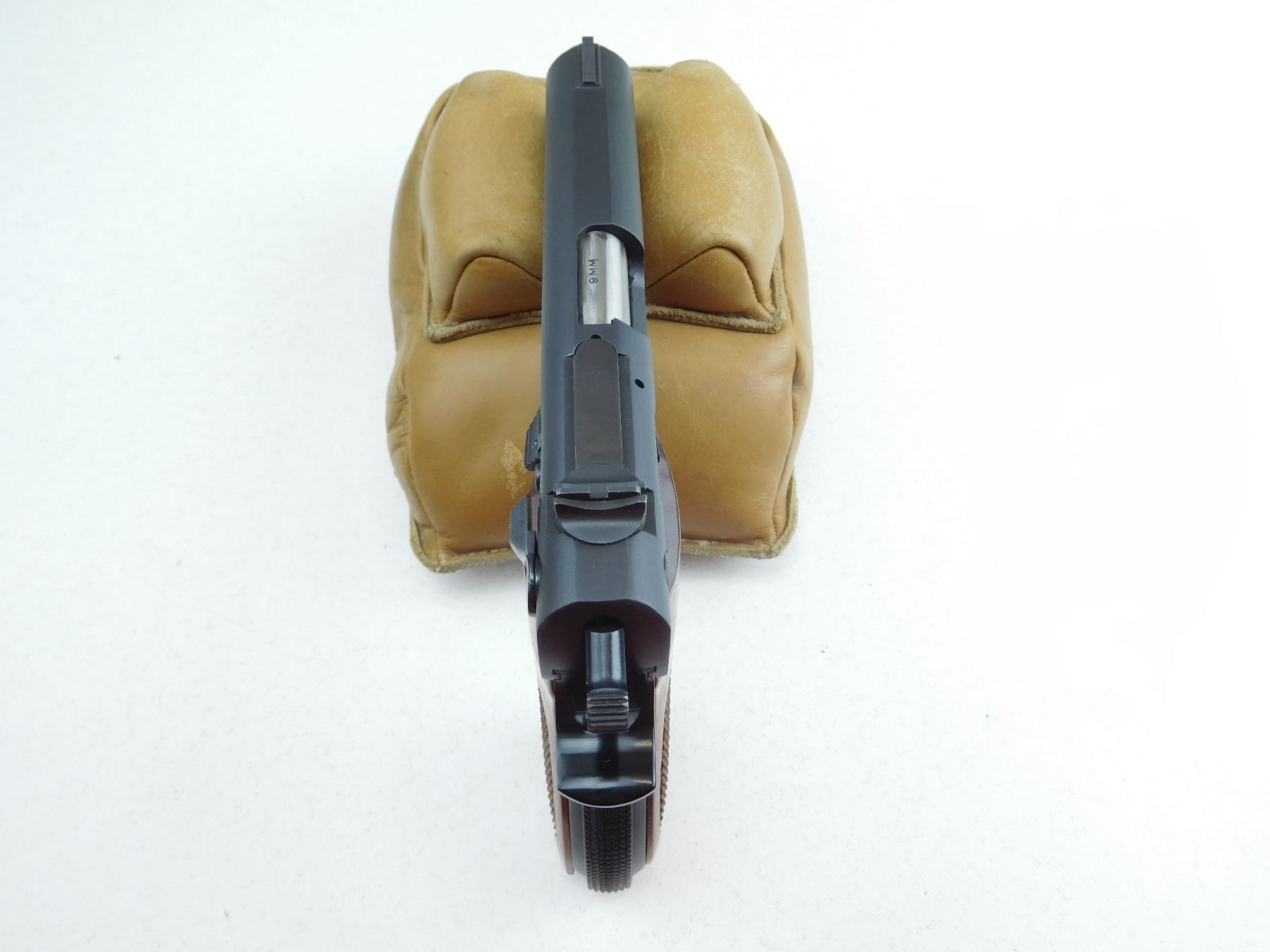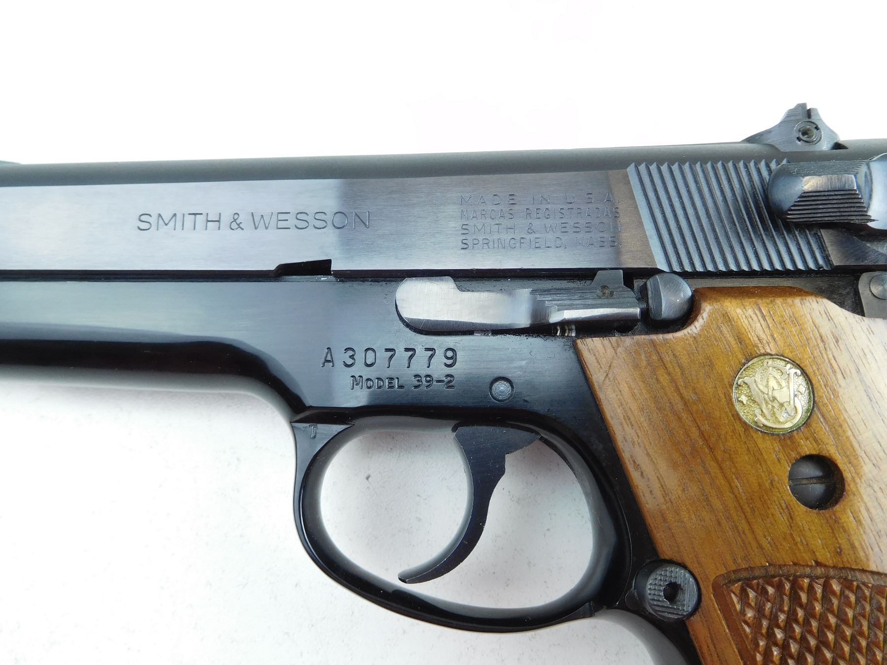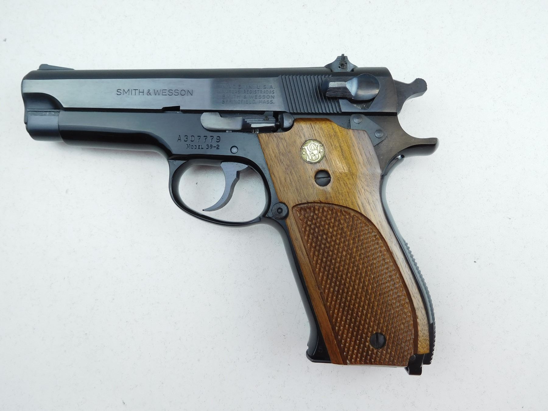 COMES WITH BOX, AND MAGAZINE, RAMP FRONT AND ADJUSTABLE REAR SIGHTS, VERY GOOD BORE, SMITH & WESSON WOOD GRIP PANELS, SHOWS VERY LITTLE HANDLING MARKS , SERIAL # A307779 , ACTION: SEMI AUTOMATIC HANDGUN , BARREL LENGTH: 101MM , CONDITION: 9/10 , STOCK # P1995 , CLASS: CANADIAN PROHIBITED CLASS