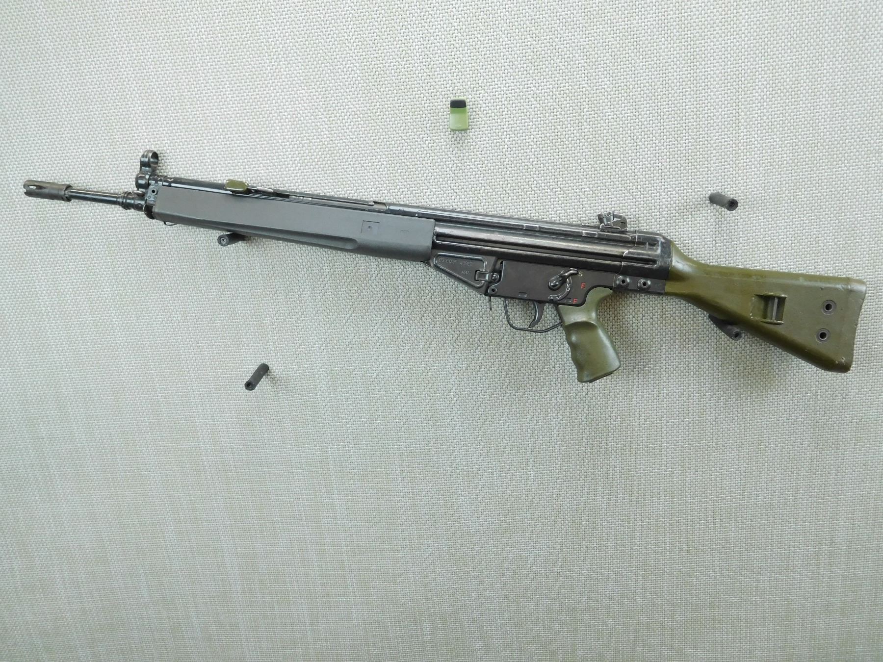DOES NOT COME WITH A MAGAZINE, FRENCH MAS(Manufacture d'armes de Saint-Étienne) CONTRACT FOR THE LEBANESE ARMY (A.L.)REQUIRES 12.3 PROHIBITED STATUS TO PURCHASE, BIRD CAGE FLASH HIDER, HOODED FRONT SIGHT AND FULLY ADJUSTABLE APERTURE REAR SIGHT, GREEN SYNTHETIC FURNITURE, SLING SWIVELS, SHOWS SOME HANDLING MARKS, BORE IS GOOD , SERIAL # 22139 , ACTION: CONVERTED AUTOMATIC RIFLE , BARREL LENGTH: 19" , CONDITION: 6/10 , STOCK # P2024 , CLASS: CANADIAN PROHIBITED CLASS