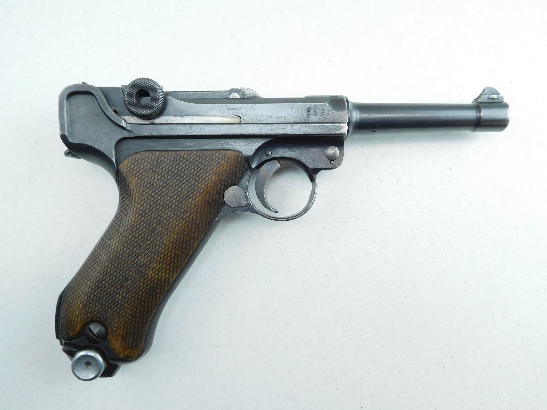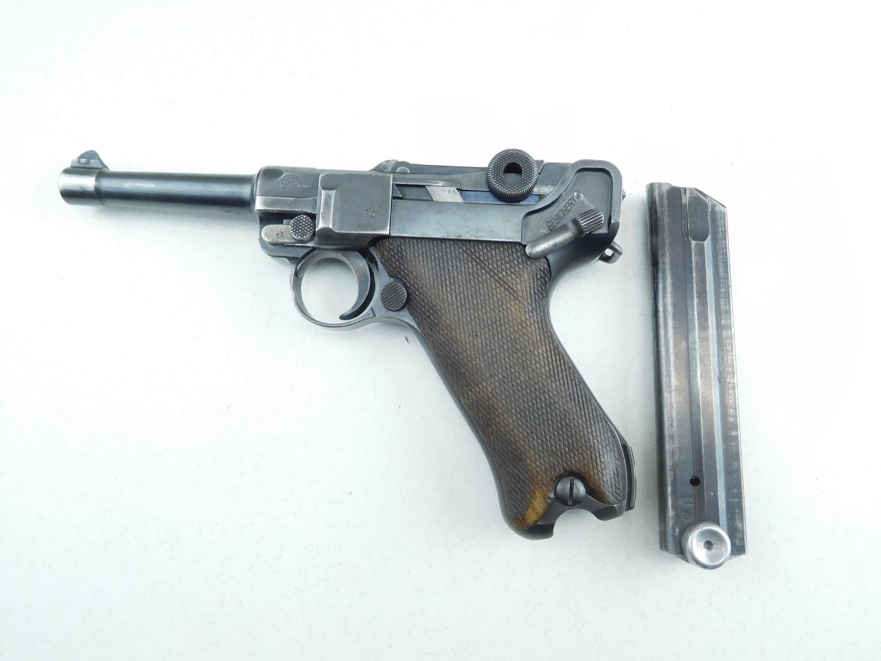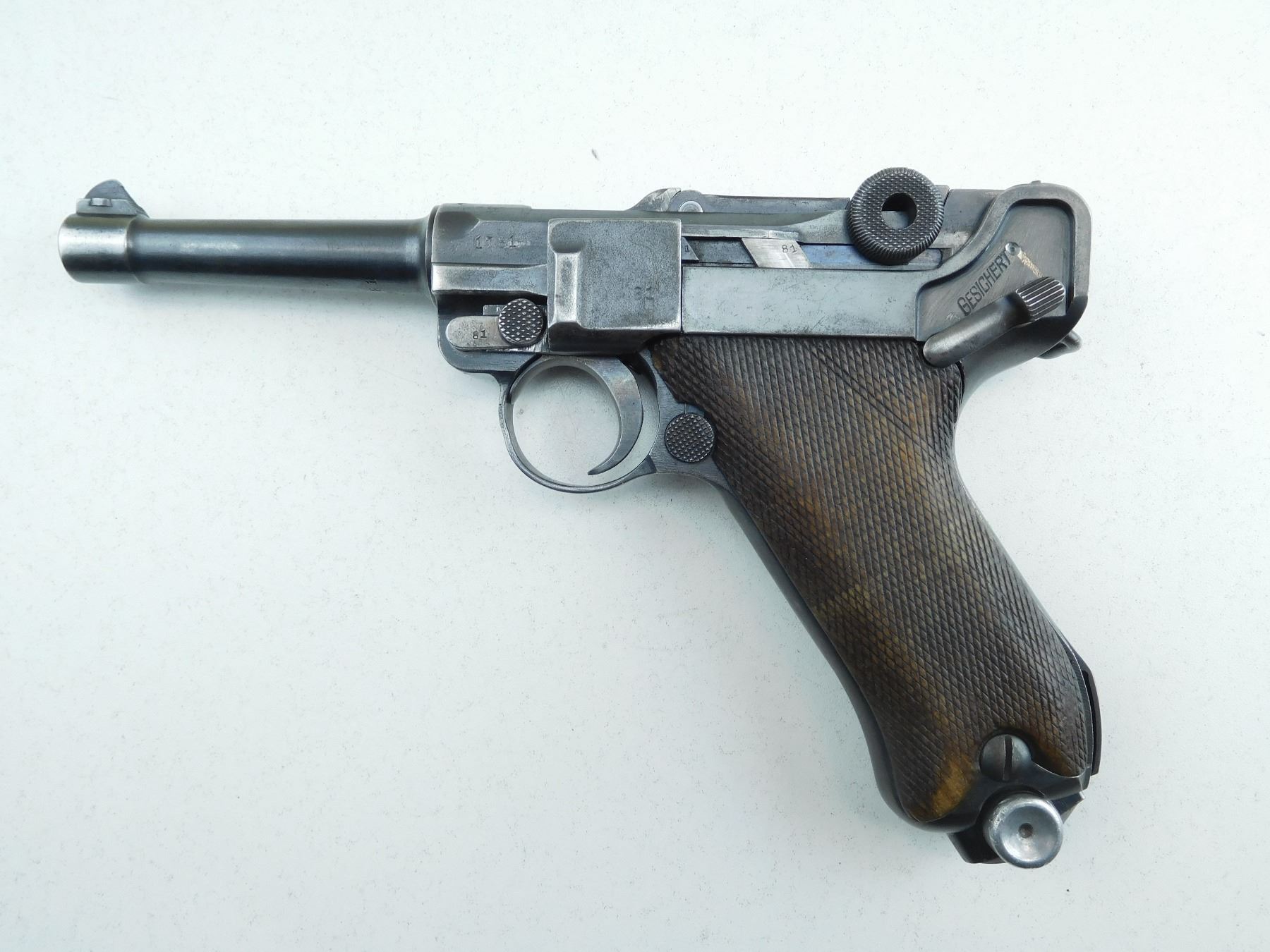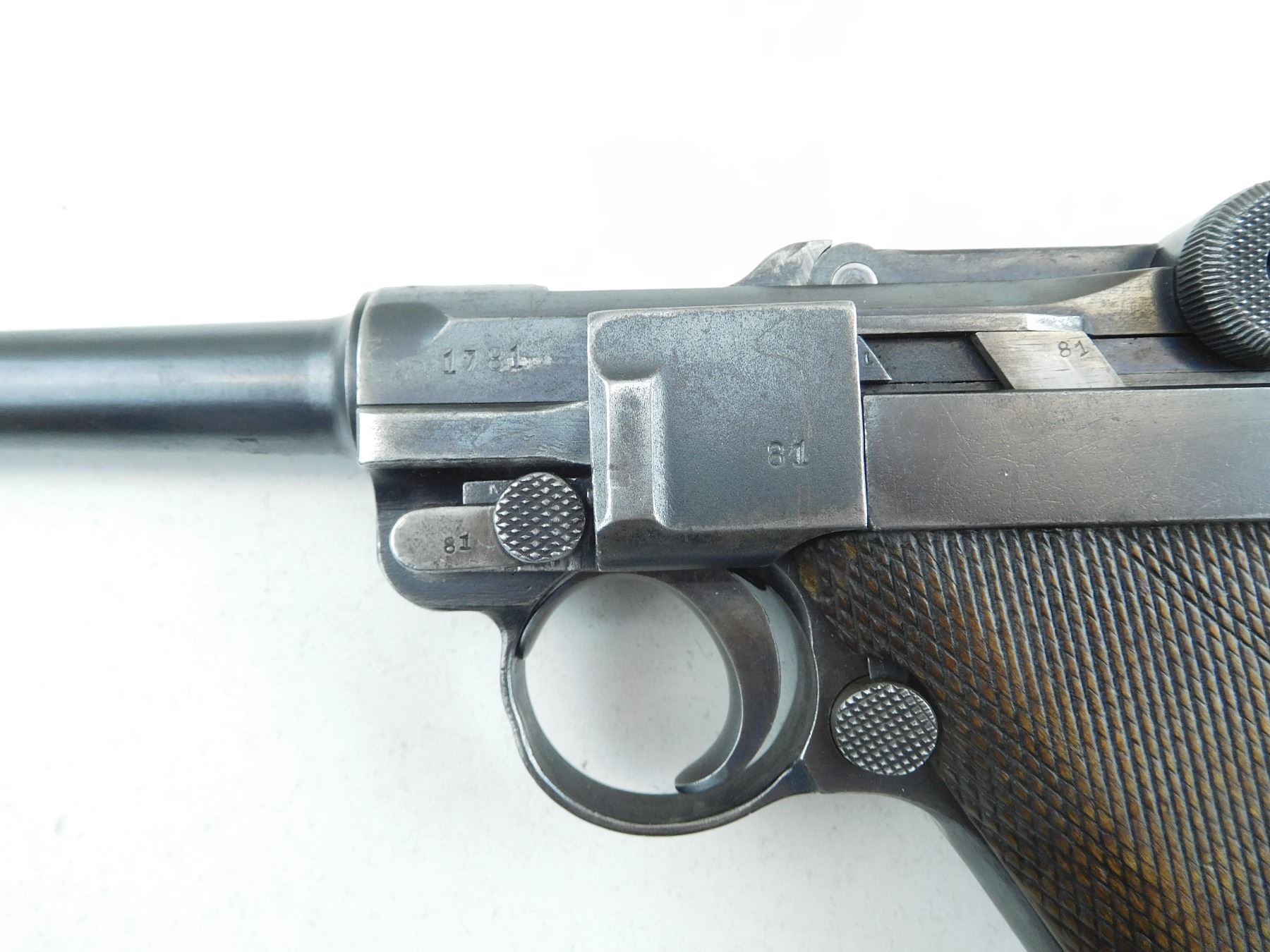 COMES WITH MAGAZINE, 1920 REWORK OF A 1917 DWM LUGER, HAS GERMAN MILITARY ACCEPTANCE MARKS, ALL MATCHING SERIALS EXCEPT FOR THE MAGAZINE, GOOD BORE, ORIGINAL CHECKERED WOOD GRIPS, SHOWS SOME HANDLING MARKS, RAMP FRONT AND RAISED REAR SIGHT , SERIAL # 1781G , ACTION: SEMI AUTOMATIC HANDGUN , BARREL LENGTH: 102MM , CONDITION: 6/10 , STOCK # P2045 , CLASS: CANADIAN PROHIBITED CLASS