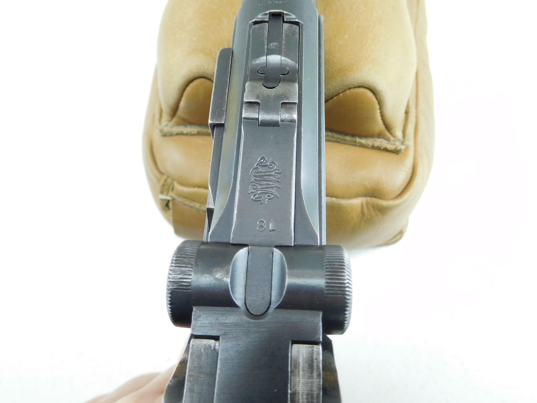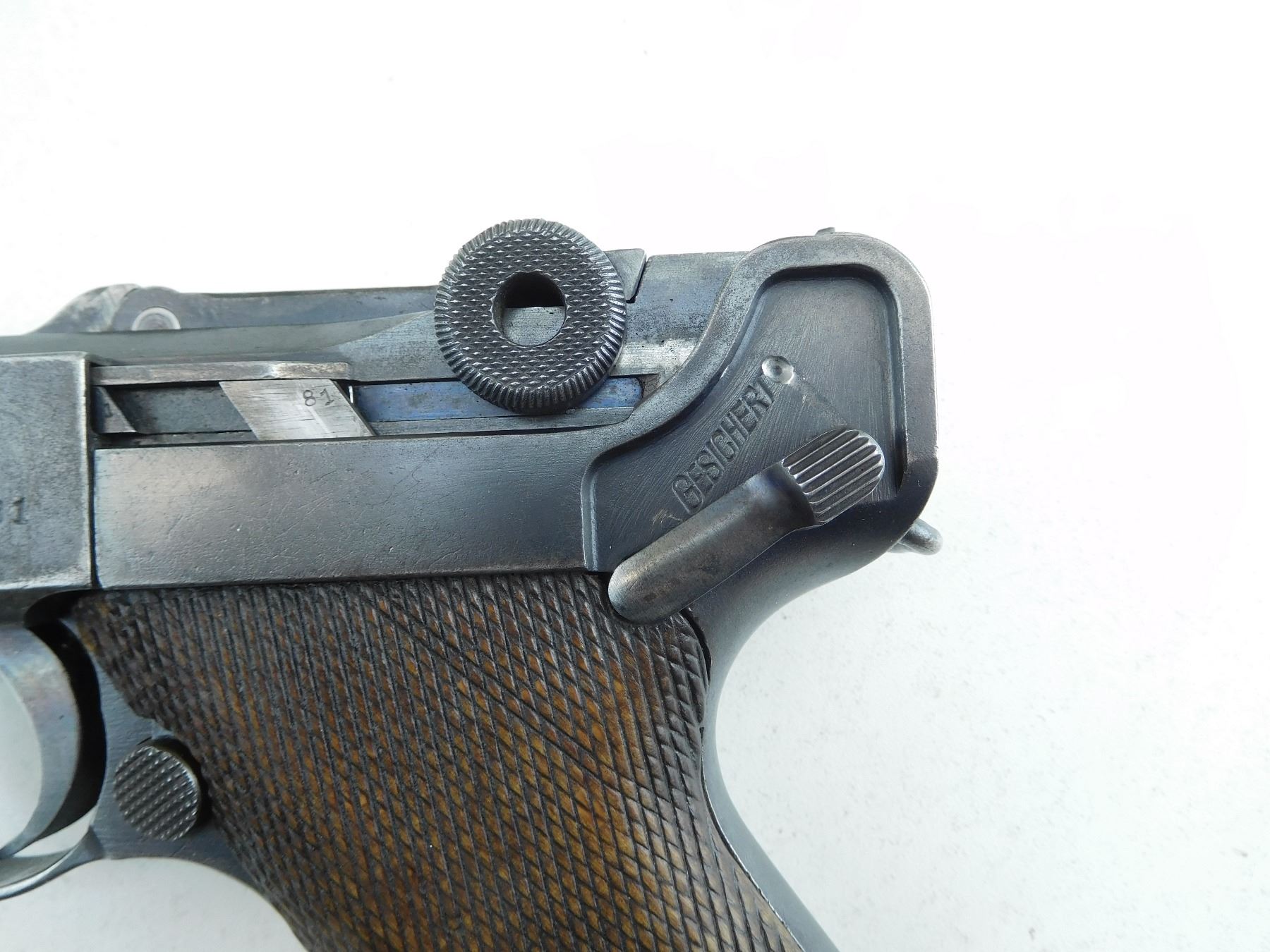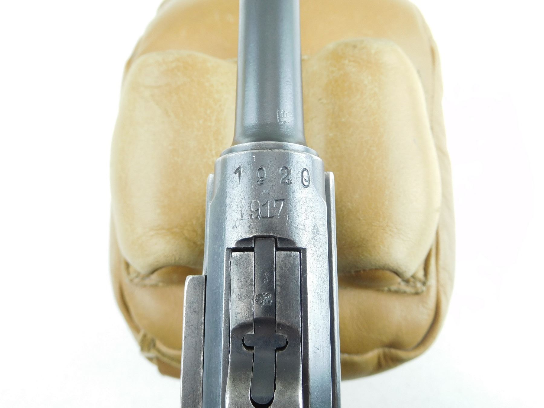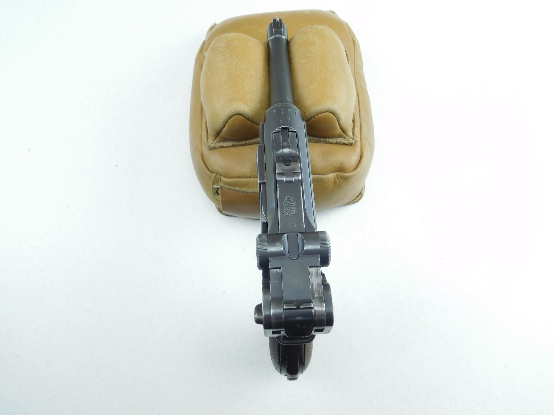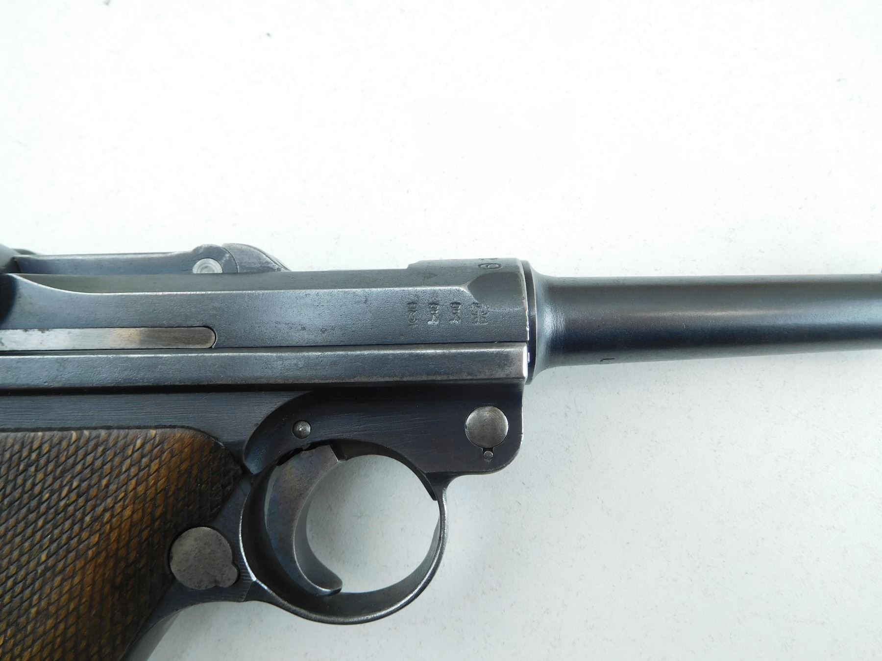 COMES WITH MAGAZINE, 1920 REWORK OF A 1917 DWM LUGER, HAS GERMAN MILITARY ACCEPTANCE MARKS, ALL MATCHING SERIALS EXCEPT FOR THE MAGAZINE, GOOD BORE, ORIGINAL CHECKERED WOOD GRIPS, SHOWS SOME HANDLING MARKS, RAMP FRONT AND RAISED REAR SIGHT , SERIAL # 1781G , ACTION: SEMI AUTOMATIC HANDGUN , BARREL LENGTH: 102MM , CONDITION: 6/10 , STOCK # P2045 , CLASS: CANADIAN PROHIBITED CLASS