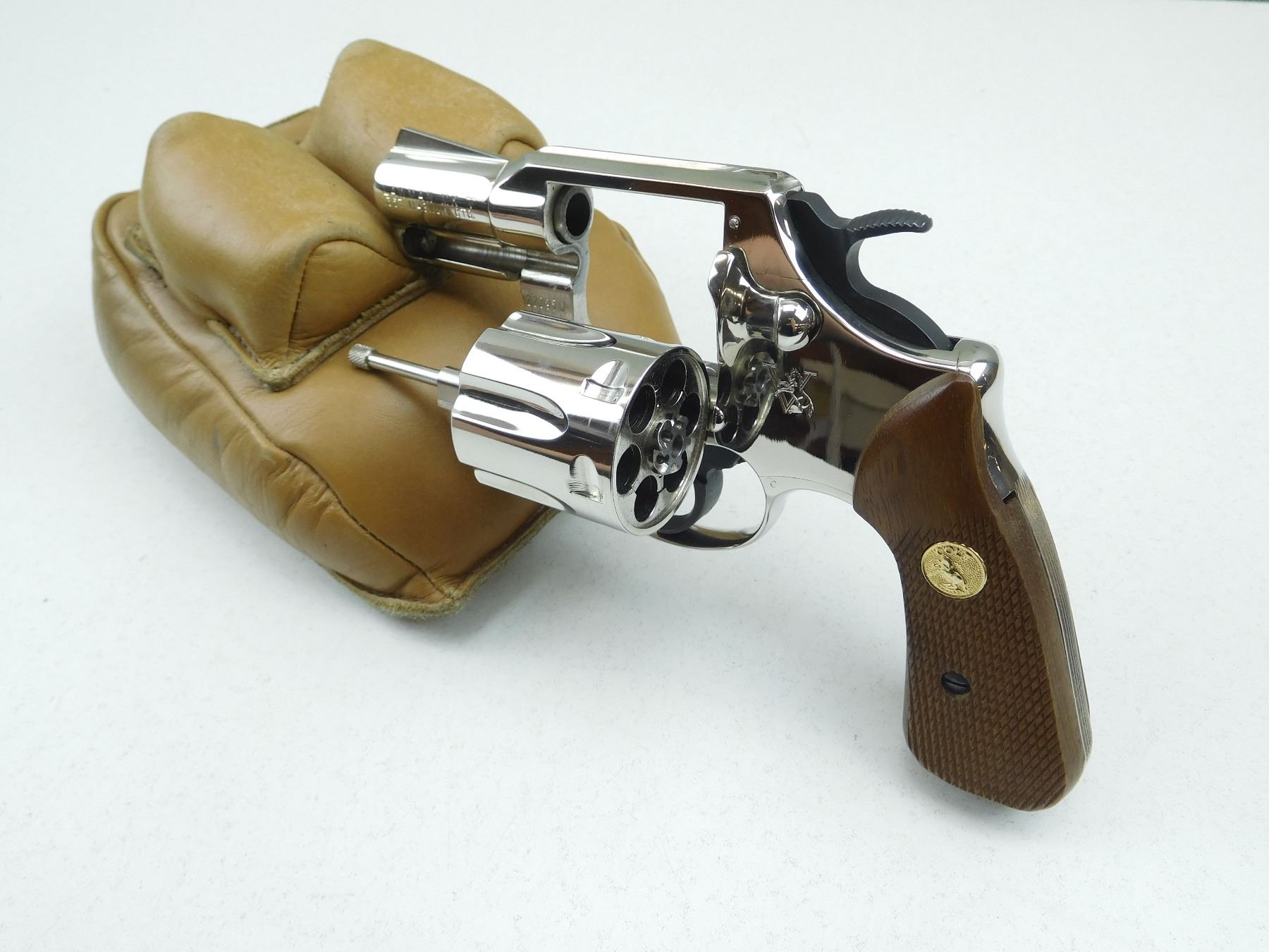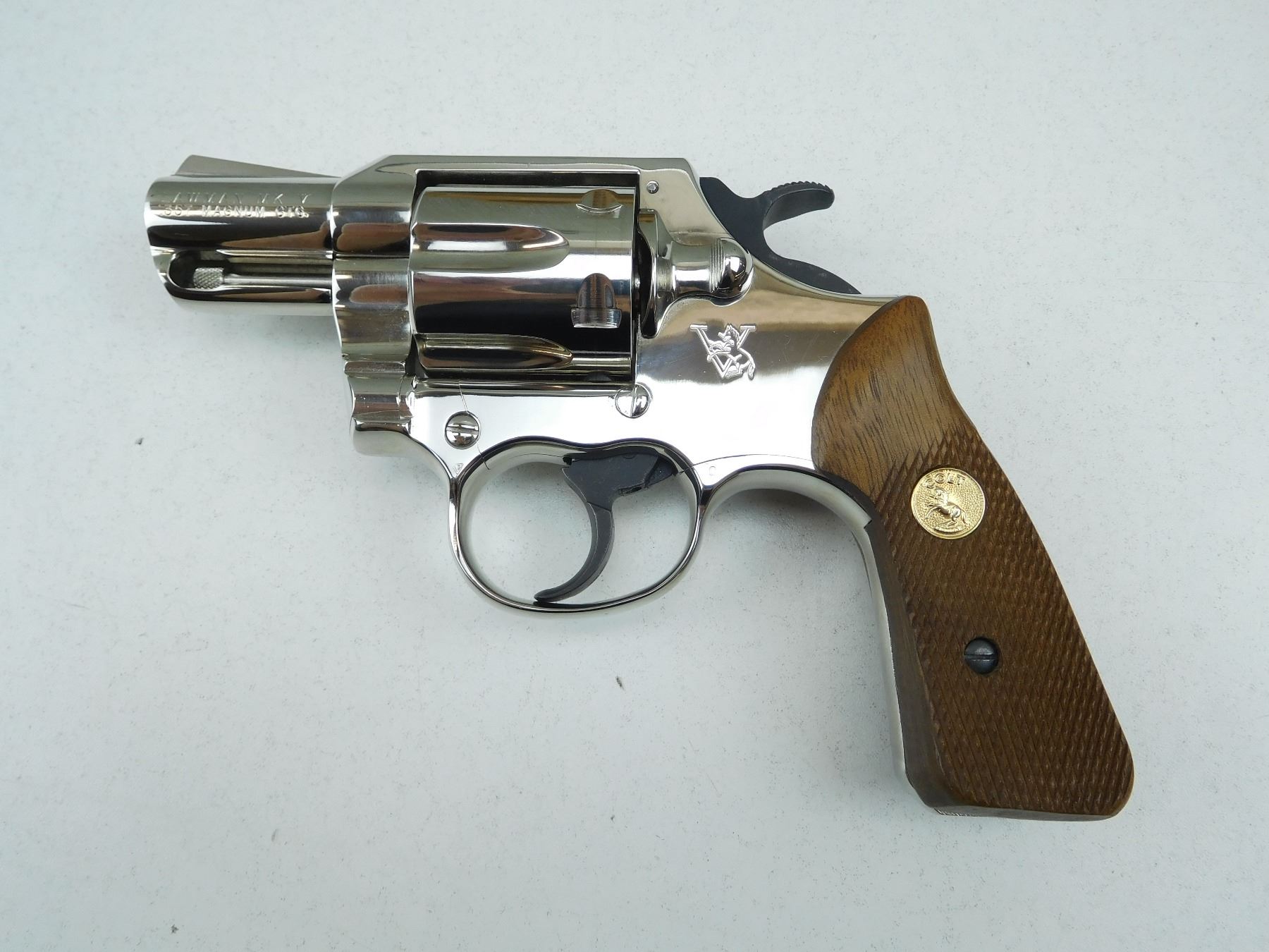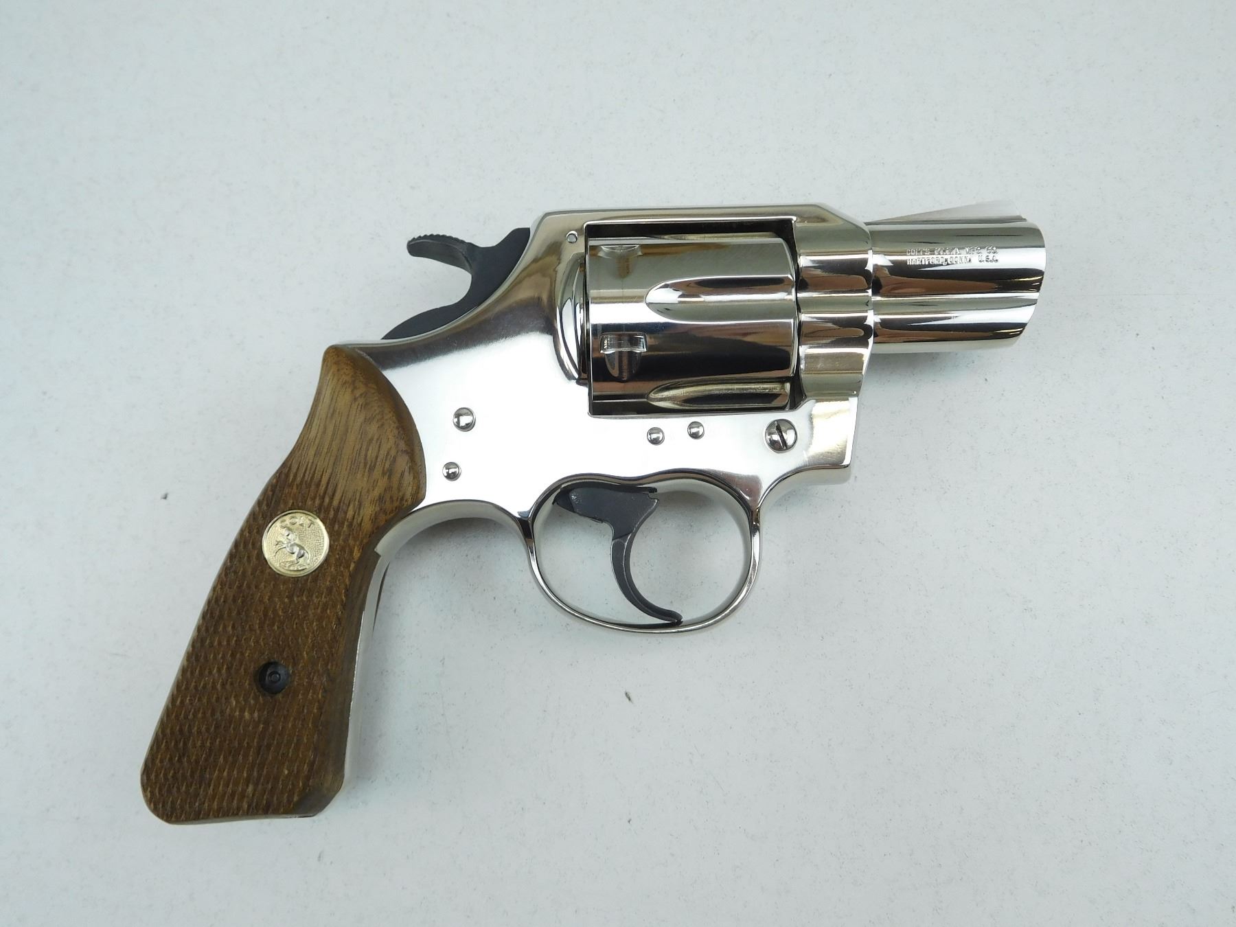DOUBLE ACTION, NICKEL PLATED FINISH, CHECKERED WOODEN GRIPS, ONE OF THE STRONGEST ACTION/FRAME COLT EVER PRODUCED, NEW REVOLVERS DON'T COMPARE, AS NEW CONDITION, SERIAL # 22095V , ACTION: REVOLVER , BARREL LENGTH: 51MM , CONDITION: 9+/10, STOCK # P2134 , CLASS: CANADIAN PROHIBITED CLASS