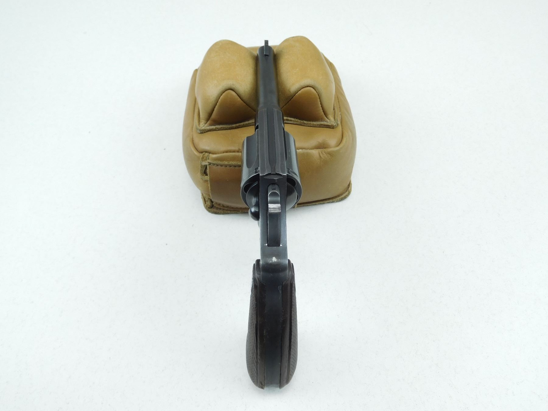 6 SHOT CAPACITY, NOTCH AND BLADE SIGHTS, CHECKERED WOODEN GRIPS, EXCELLENT BORE, WEAR APPROPRIATE WITH AGE , SERIAL # 656008 , ACTION: REVOLVER , BARREL LENGTH: 102MM , CONDITION: 8/10 , STOCK # P2135 , CLASS: CANADIAN PROHIBITED CLASS