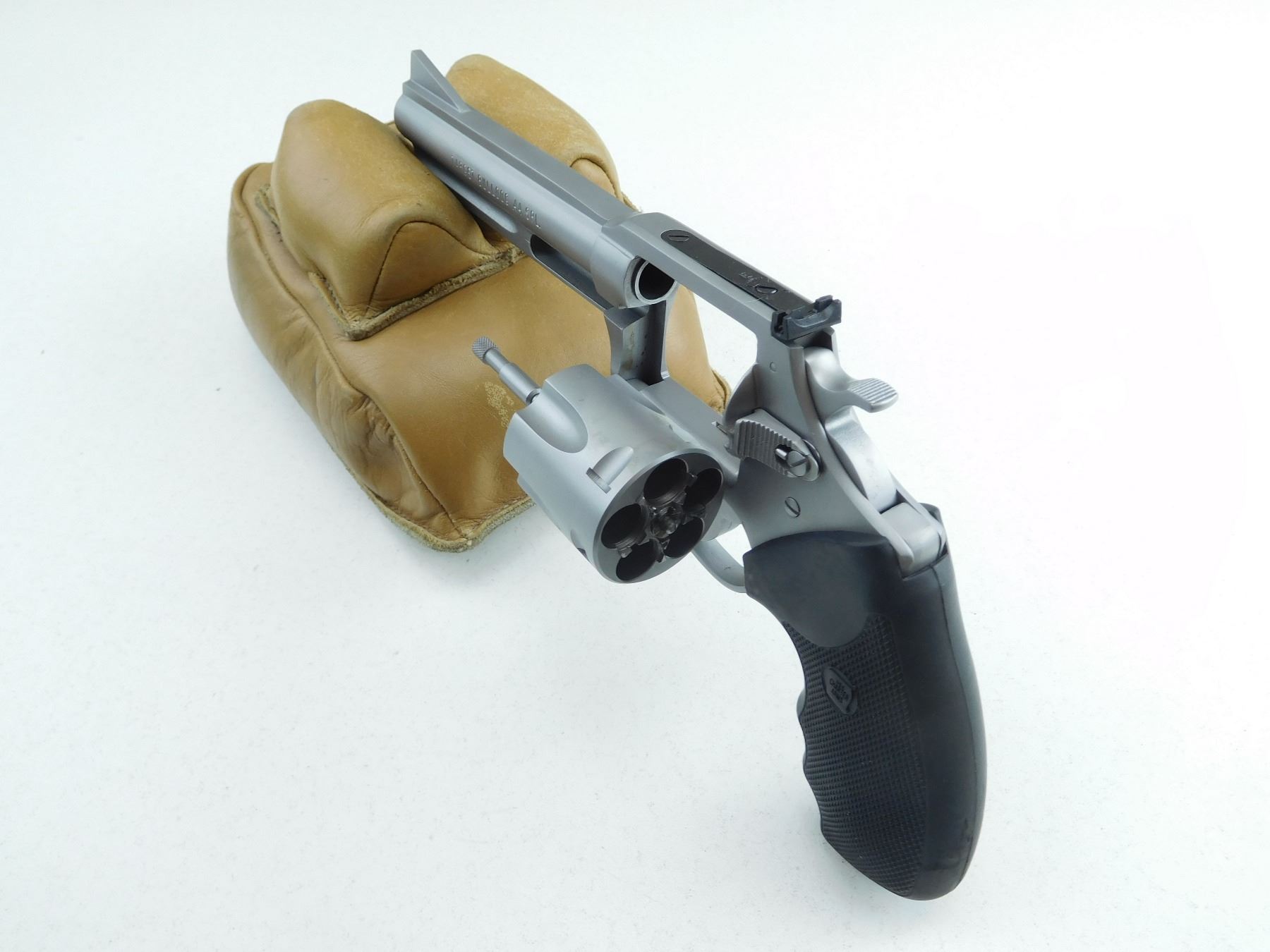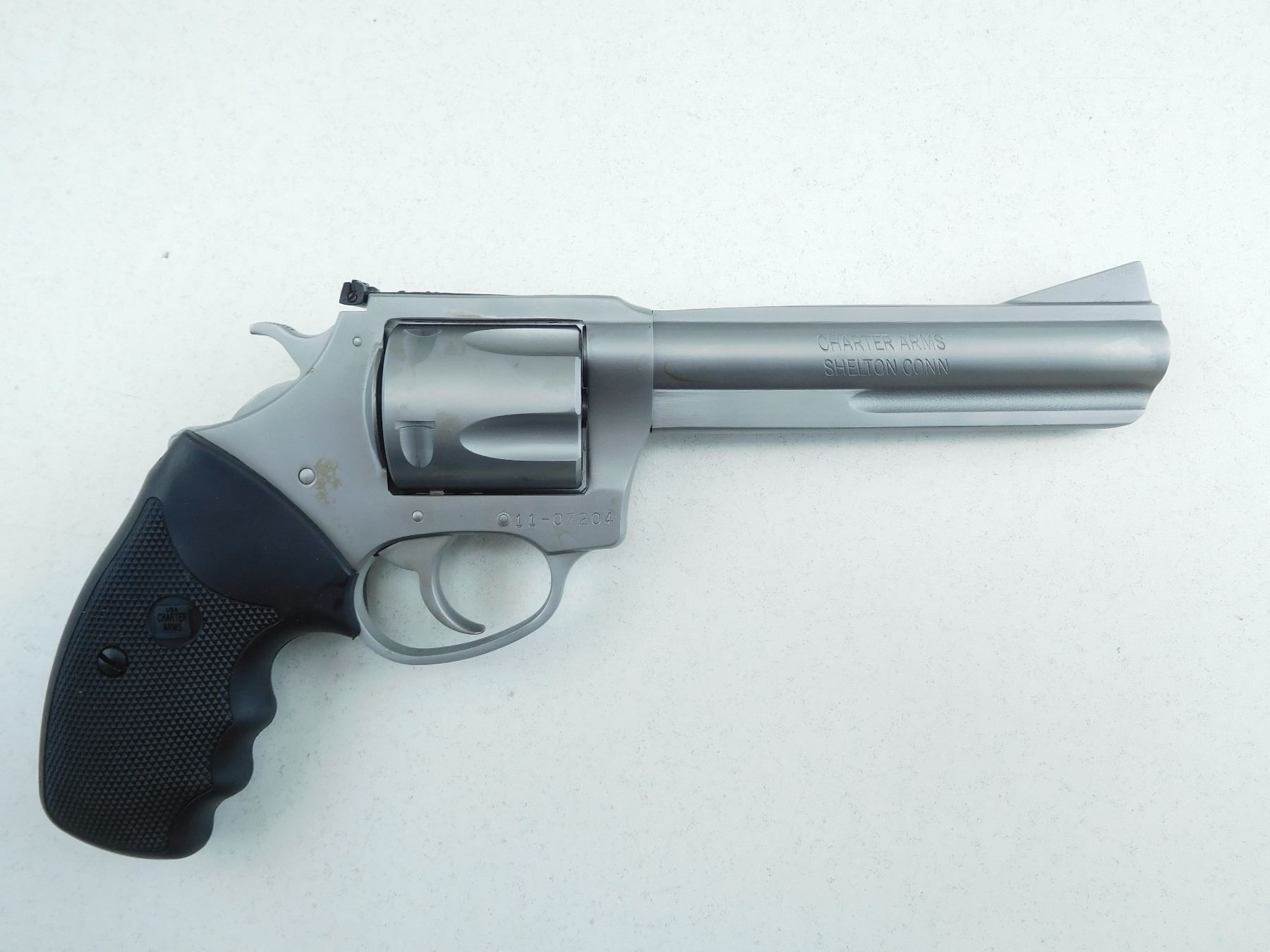 CASE/MANUAL, 5 SHOT CAPACITY, RAMP FRONT AND ADJUSTABLE REAR SIGHT, RUBBER GRIPS, MATTE STAINLESS FINISH, INDEXES AND LOCKS UP TIGHT, BORE IS EXCELLENT , SERIAL # 1107204 , ACTION: REVOLVER , BARREL LENGTH: 127MM , CONDITION: AS NEW , STOCK # R2569 , CLASS: CANADIAN RESTRICTED CLASS