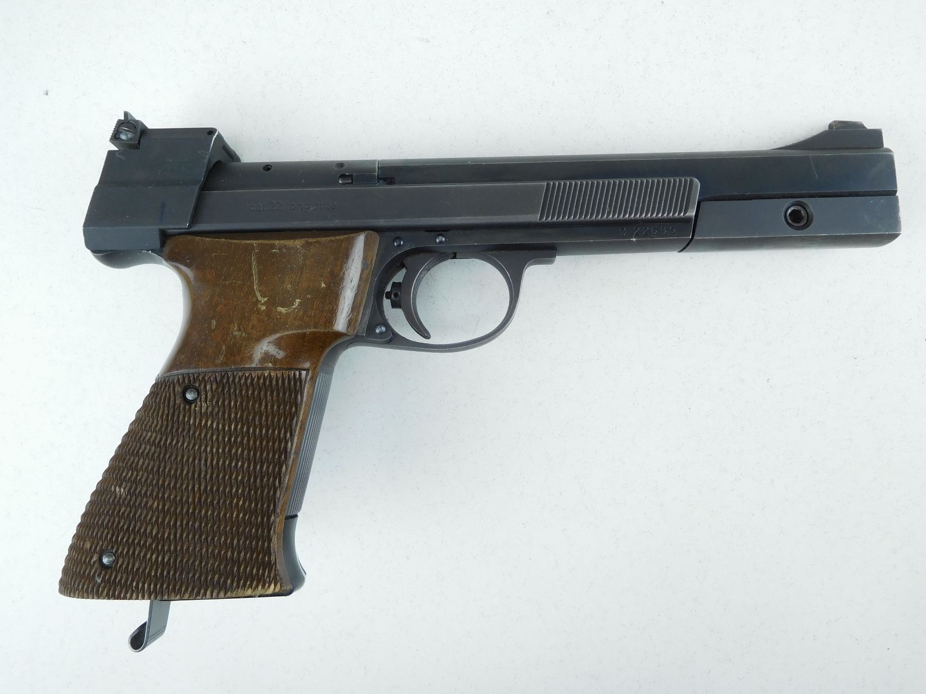COMES WITH MAGAZINE, ADJUSTABLE TARGET SIGHTS, CHECKERED WOODEN GRIPS, BORES IS BRIGHT, ADJUSTABLE TARGET TRIGGER, SHOWS SOME HANDLING MARKS , SERIAL # G22685 , ACTION: SEMI AUTOMATIC HANDGUN , BARREL LENGTH: 150MM , CONDITION: 7/10 , STOCK # R2582 , CLASS: CANADIAN RESTRICTED CLASS