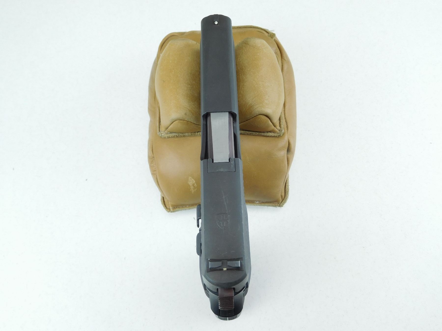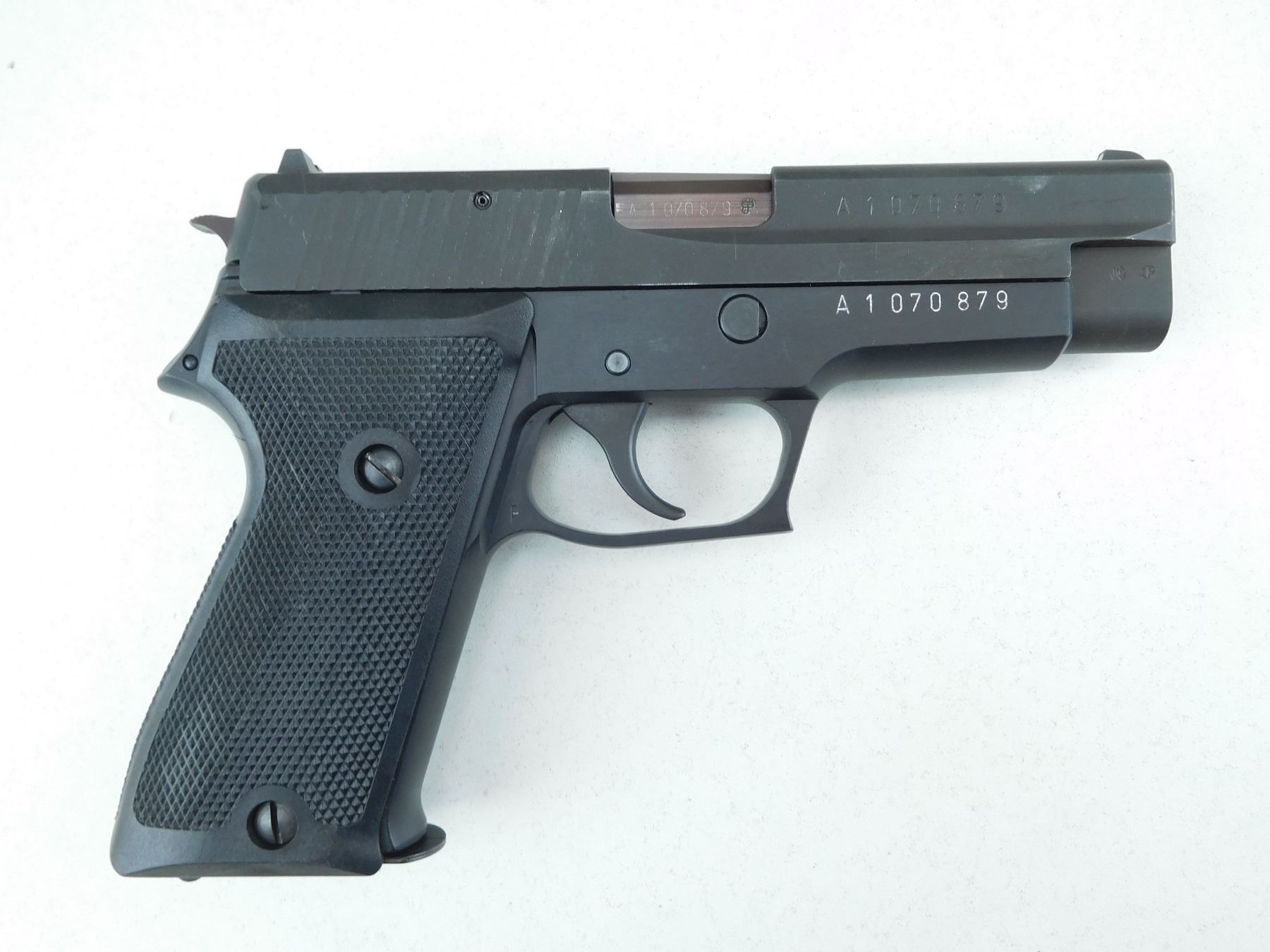 COMES WITH MAGAZINE, WHITE DOT FRONT AND DRIFT ADUSTABLE REAR SIGHTS, FEATURES ORIGINAL SWISS SHIELD AND CROSS LOGO, CHECKERED PLASTIC GRIPS, HEALED MAGAZINE RELEASE, SHOWS VERY LITTLE HANDLING MARKS , SERIAL # A1070879 , ACTION: SEMI AUTOMATIC HANDGUN , BARREL LENGTH: 110MM , CONDITION: 8/10 , STOCK # R2584 , CLASS: CANADIAN RESTRICTED CLASS