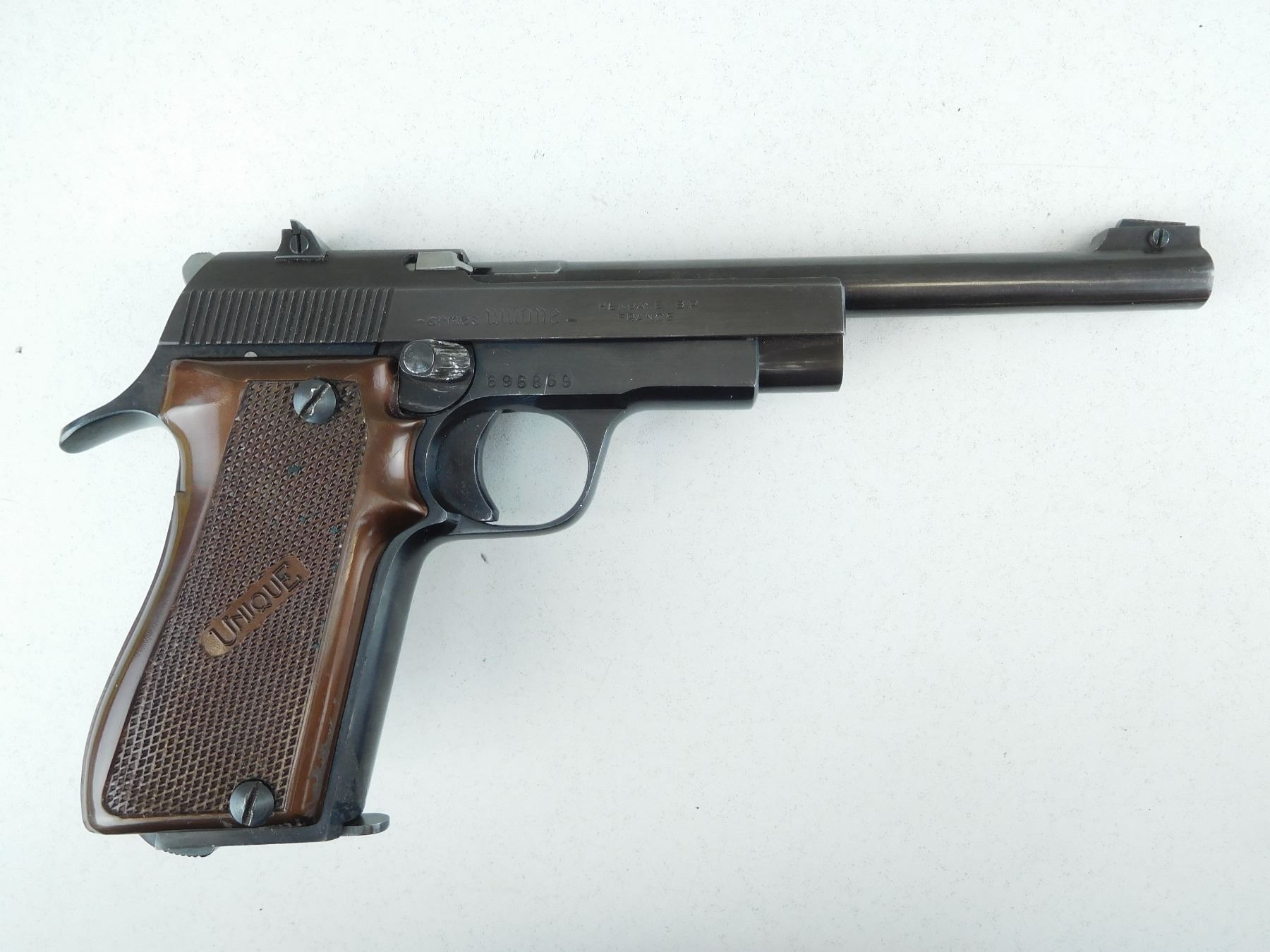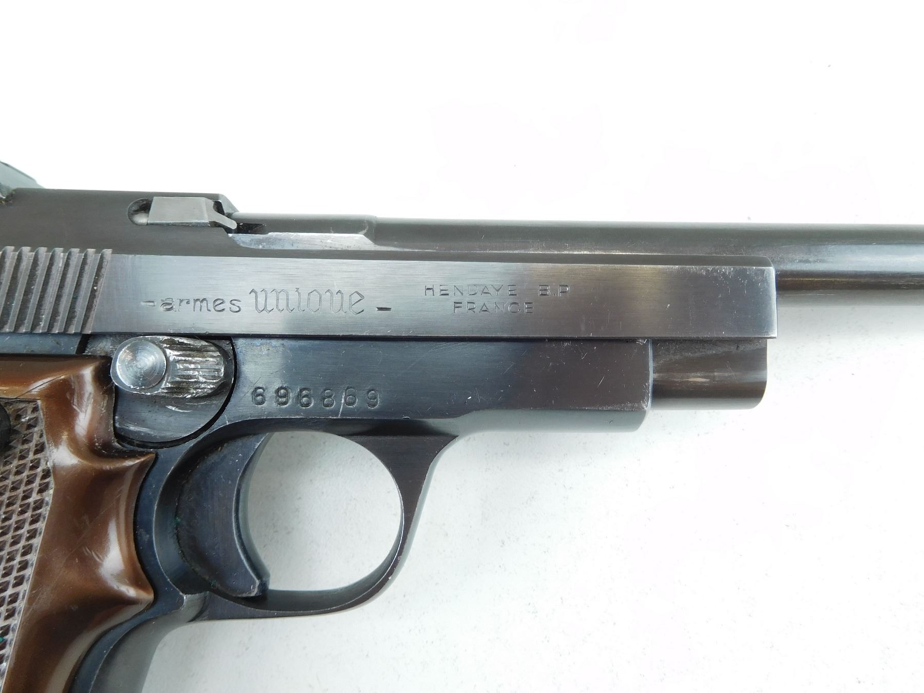 COMES WITH A 10 SHOT MAGAZINE, FIXED NOTCH AND BLADE SIGHT, BRIGHT BORE, CHECKERED PLASTIC GRIPS, BRIGHT BLUED FINISH, SHOWS MINOR HANDLING MARKS , SERIAL # 696869 , ACTION: SEMI AUTOMATIC HANDGUN , BARREL LENGTH: 152MM , CONDITION: 8/10 , STOCK # R2591 , CLASS: CANADIAN RESTRICTED CLASS