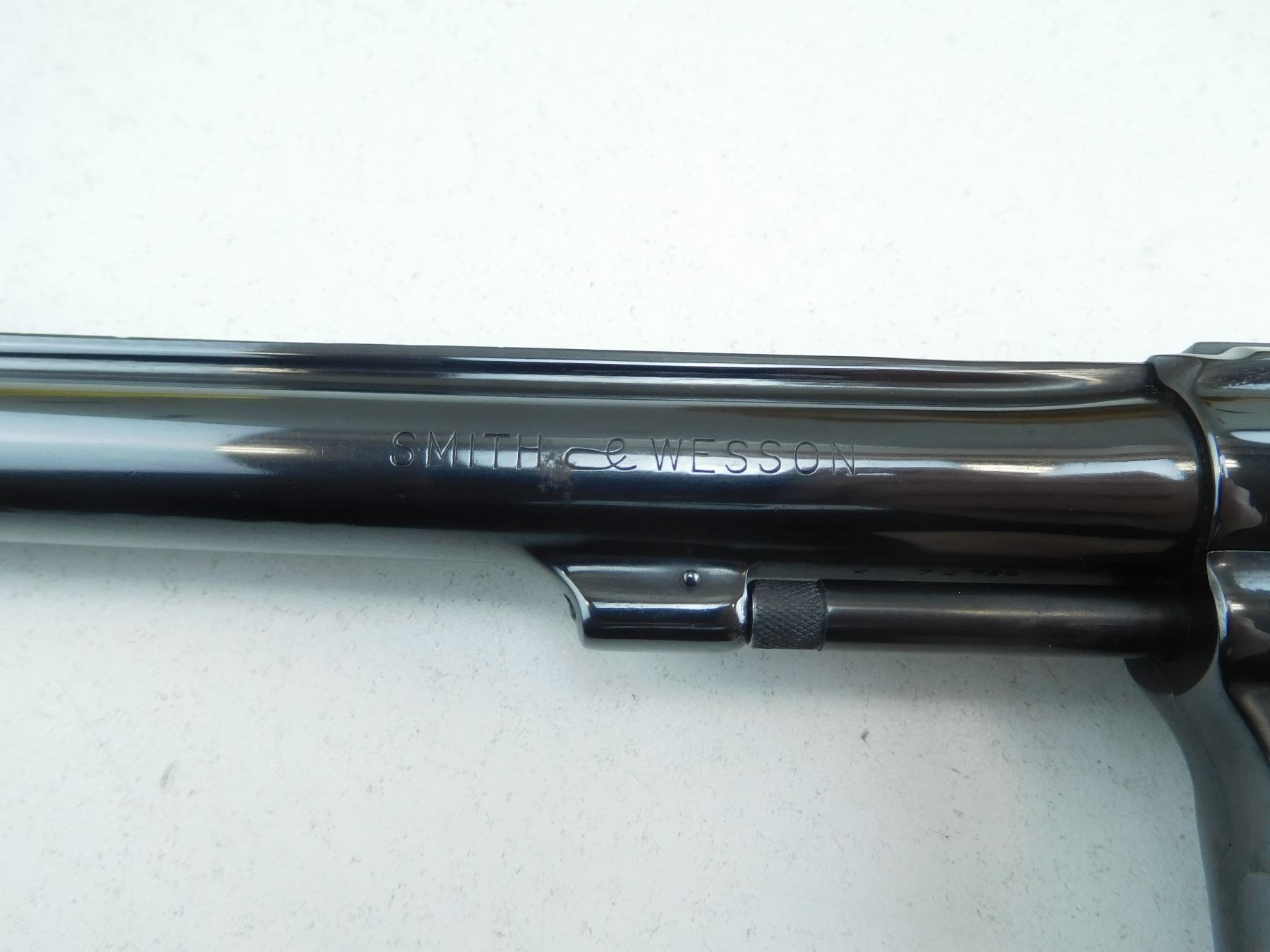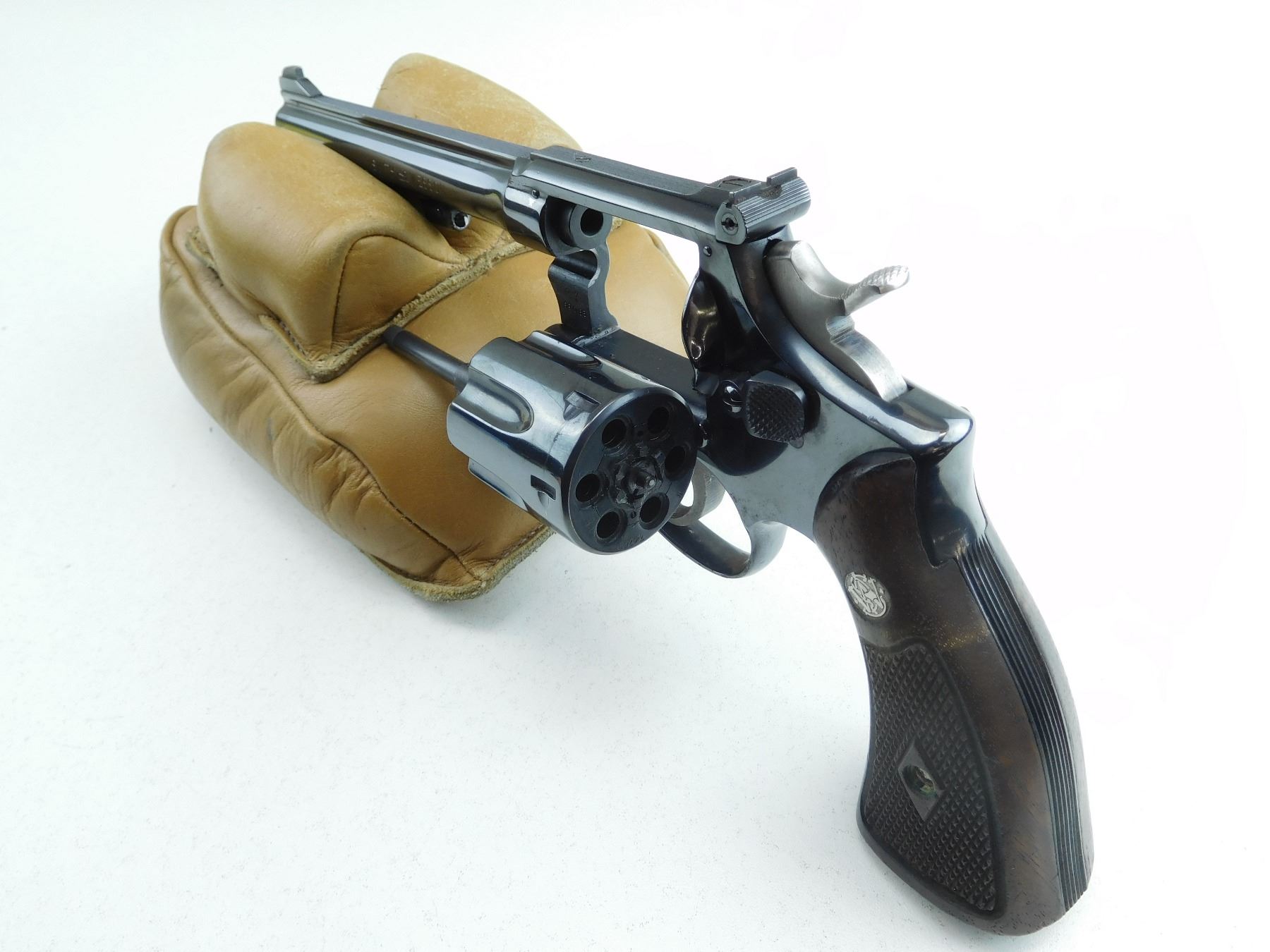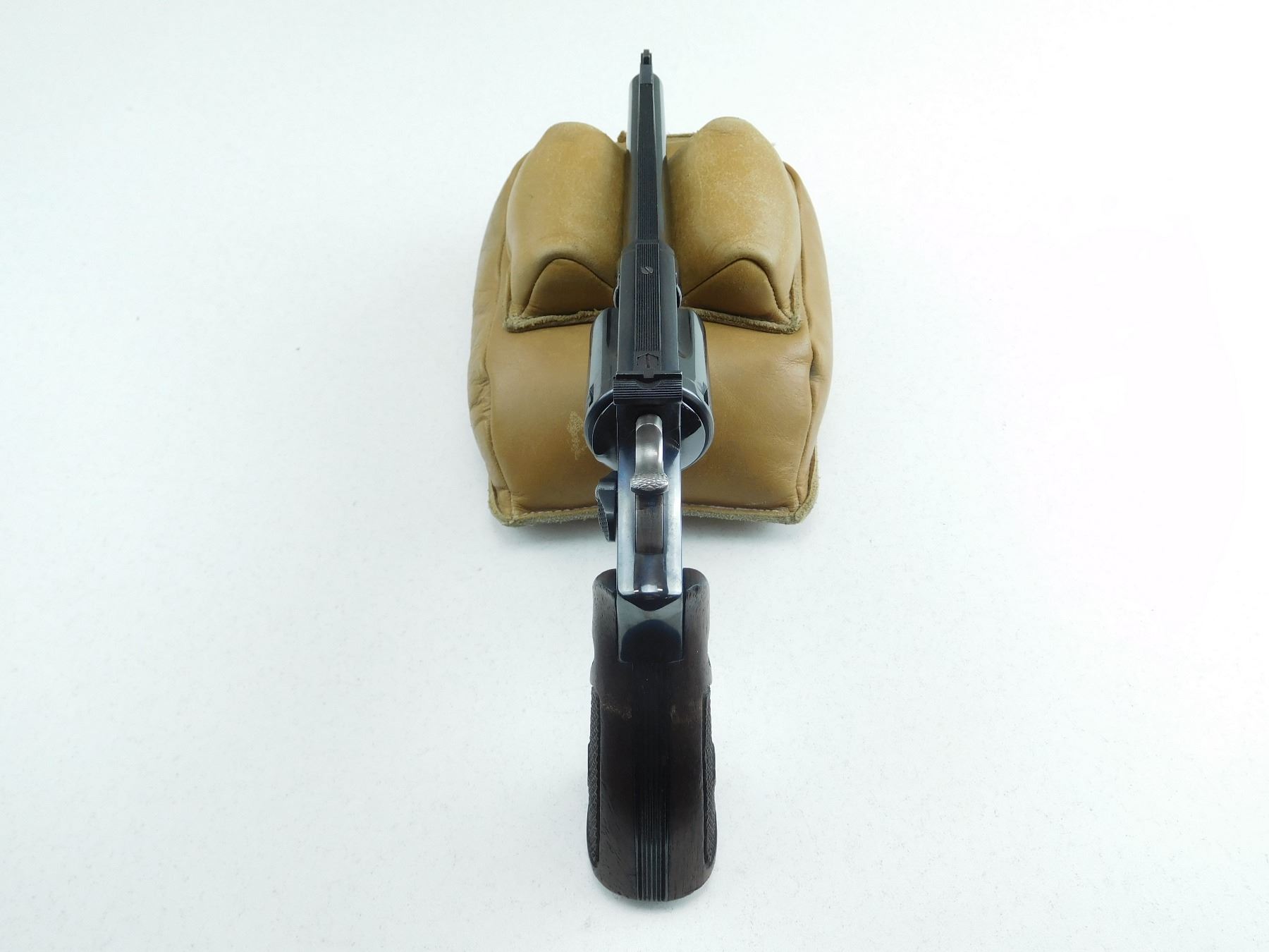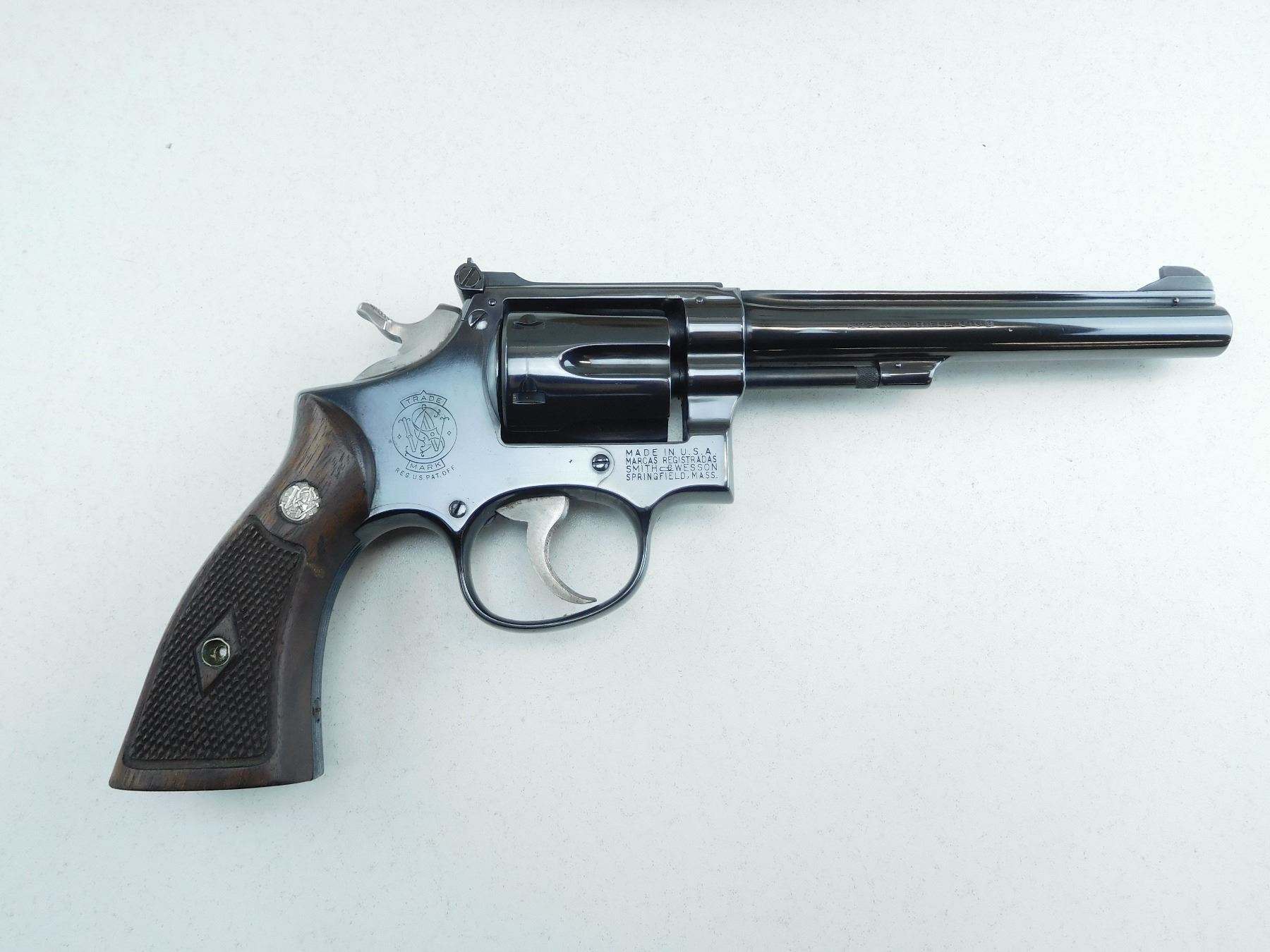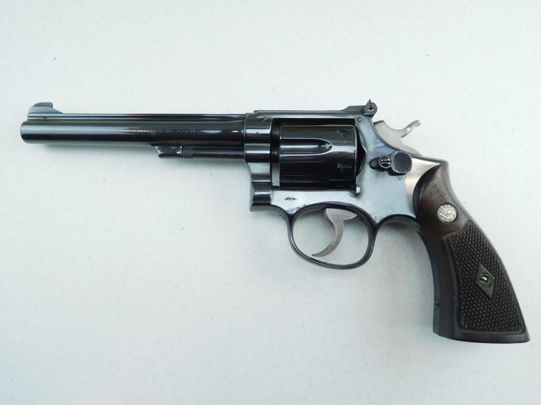 ADJUSTABLE TARGET SIGHTS, CHECKERED WOODEN GRIPS, 6 SHOT CAPACITY, EXCELLENT BORE, TIGHT LOCK UP, ORIGINAL HIGH BLUE FINISH, SHOWS MINOR HANDLING MARKS , SERIAL # K74769 , ACTION: REVOLVER , BARREL LENGTH: 152MM , CONDITION: 8/10 , STOCK # R2603 , CLASS: CANADIAN RESTRICTED CLASS