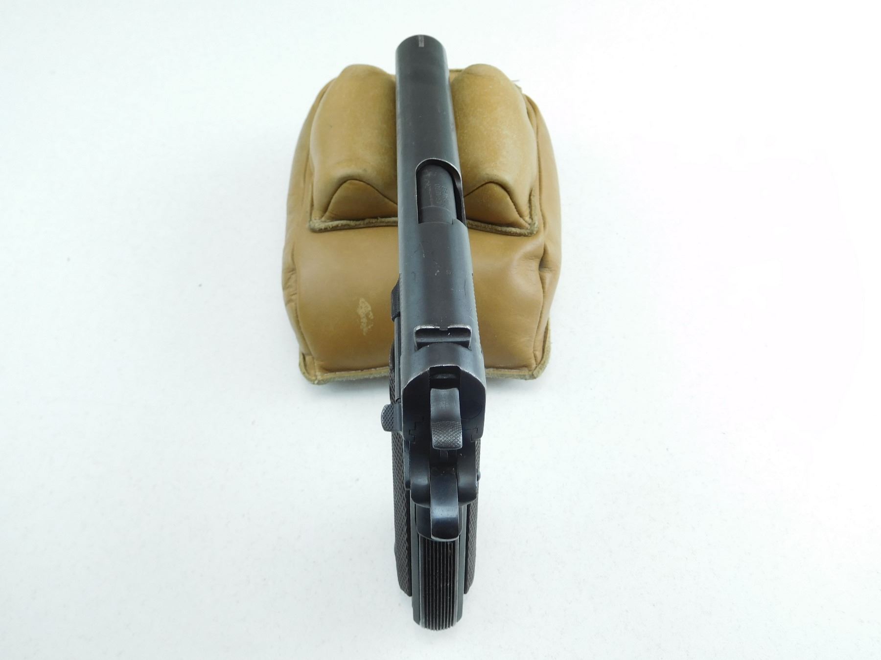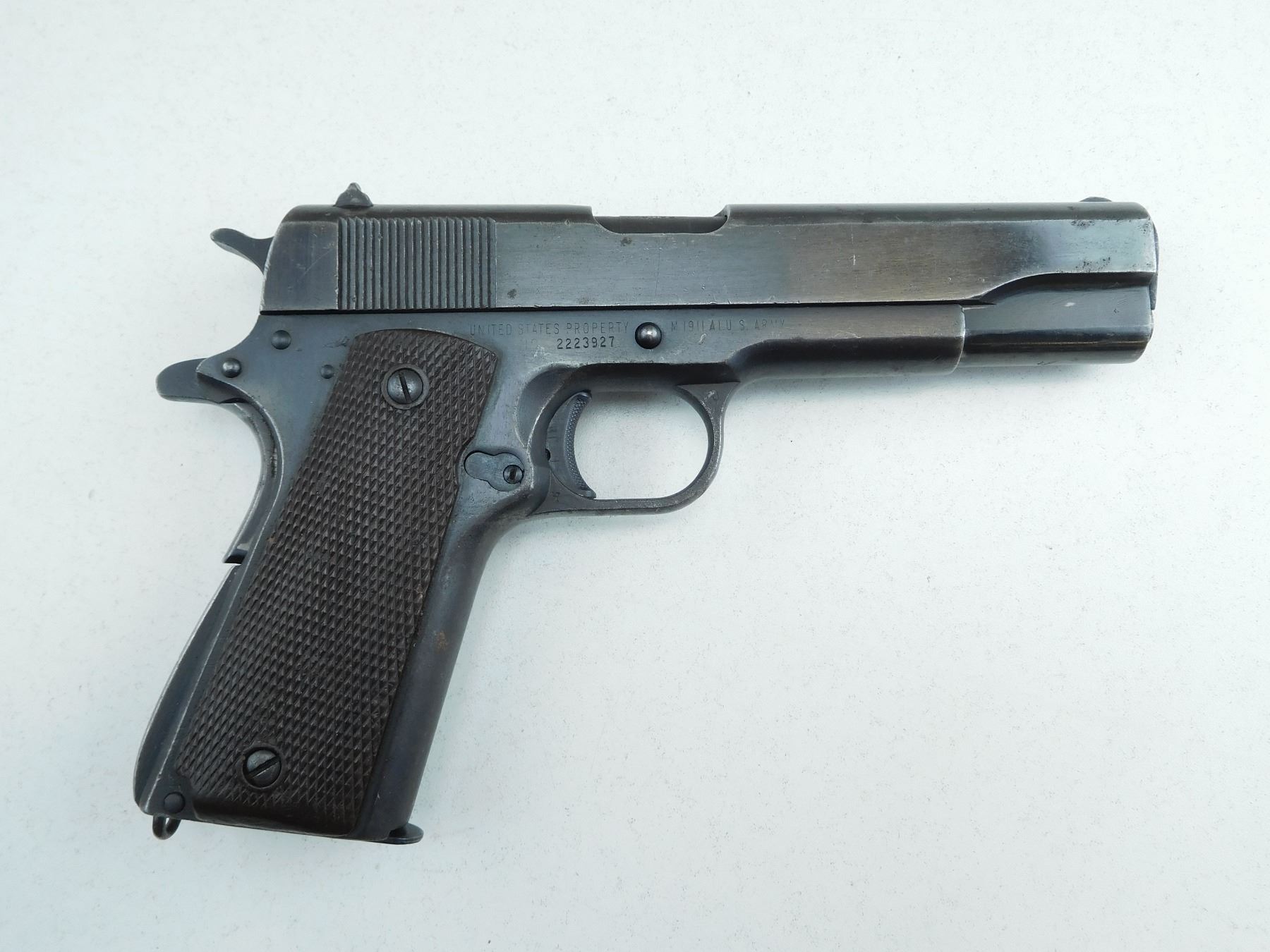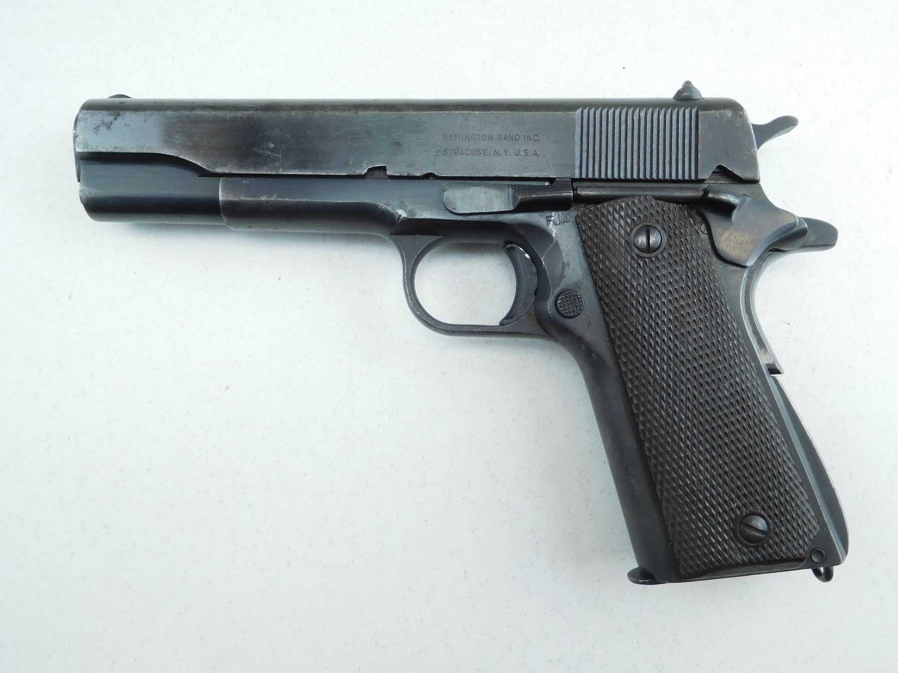 COMES WITH MAGAZINE, BORE IS GOOD WITH VERY MINOR PITTING, GRIP SAFETY, CHECKERED PLASTIC GRIPS, MARKED UNITED STATES PROPERTY, MADE BY REMINGTON RAND INC, NOTCH ANDBLADE SIGHTS, SHOWS AVERAGE HANDLING MARKS , SERIAL # 2223927 , ACTION: SEMI AUTOMATIC HANDGUN , BARREL LENGTH: 127MM , CONDITION: 7/10 , STOCK # R2607 , CLASS: CANADIAN RESTRICTED CLASS