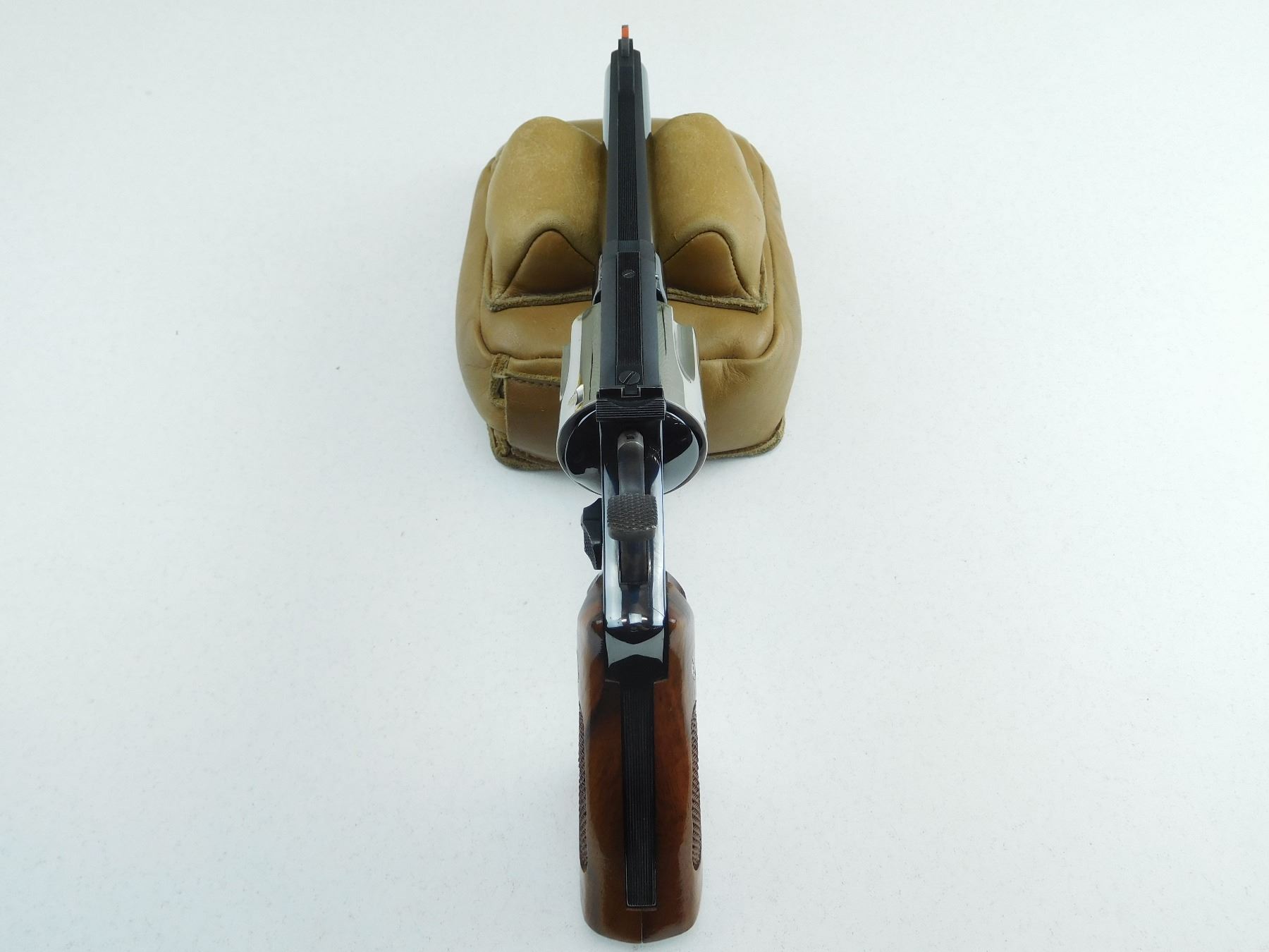 ADJUSTABLE TARGET SIGHTS, CHECKERED WOODEN GRIPS, CHROME PLATED CYLINDER, LOCK UP IS TIGHT, 6 SHOT CAPACITY, EXCELLENT BORE, BRIGHT BLUE FINISH, SHOWS VERY MINOR HANDLING MARKS , SERIAL # N19414 , ACTION: REVOLVER , BARREL LENGTH: 165MM , CONDITION: 9/10 , STOCK # R2609 , CLASS: CANADIAN RESTRICTED CLASS