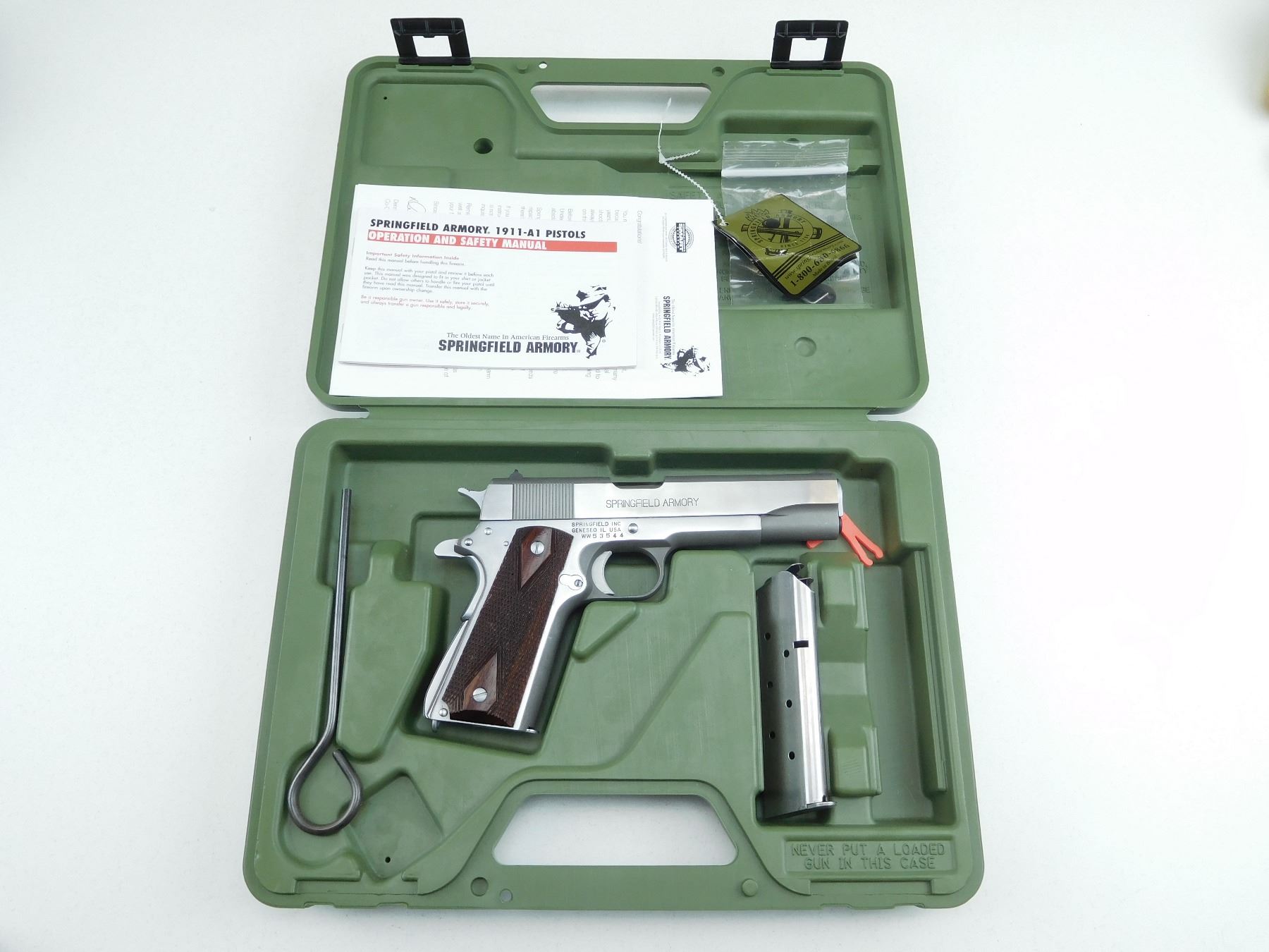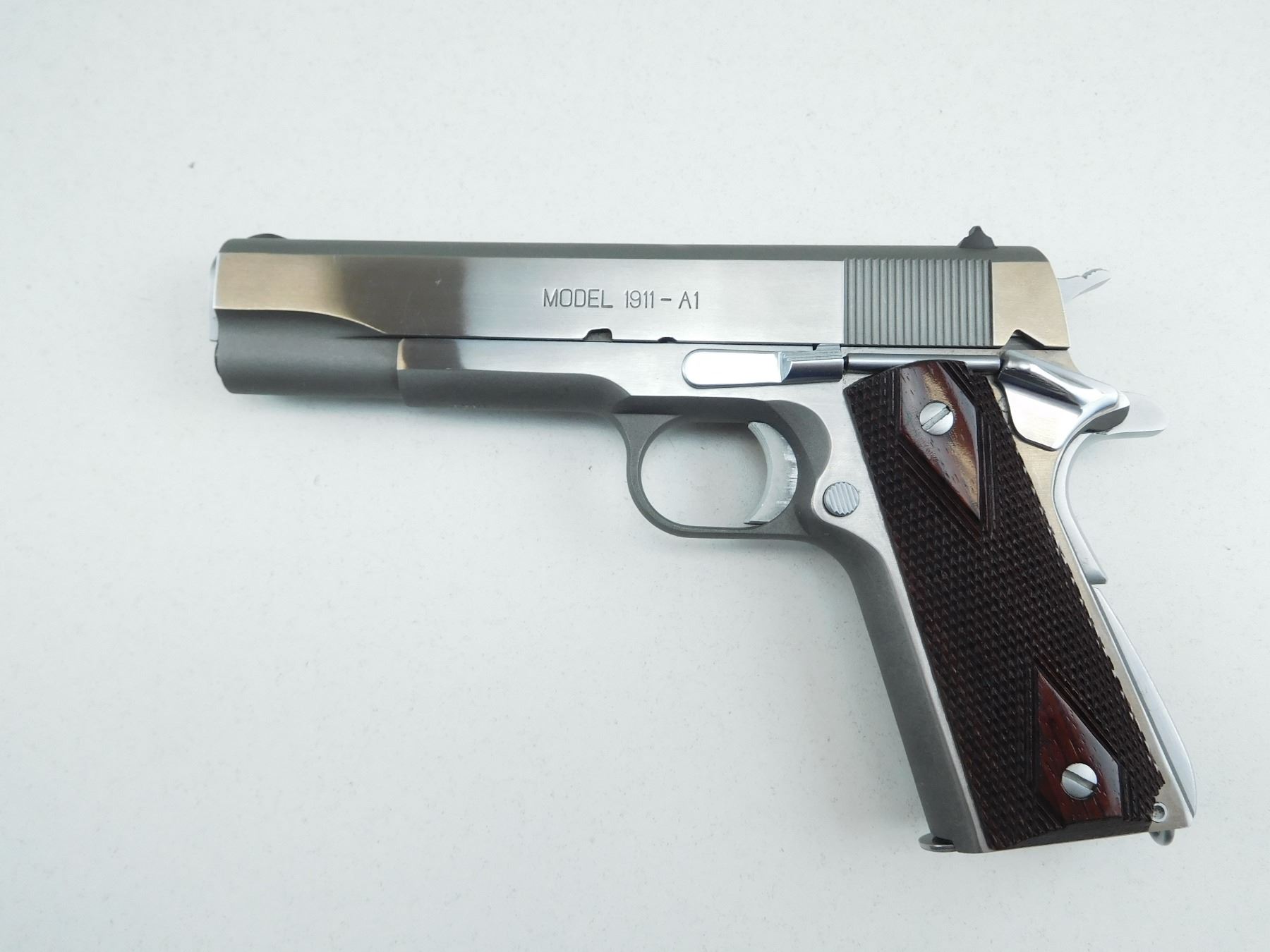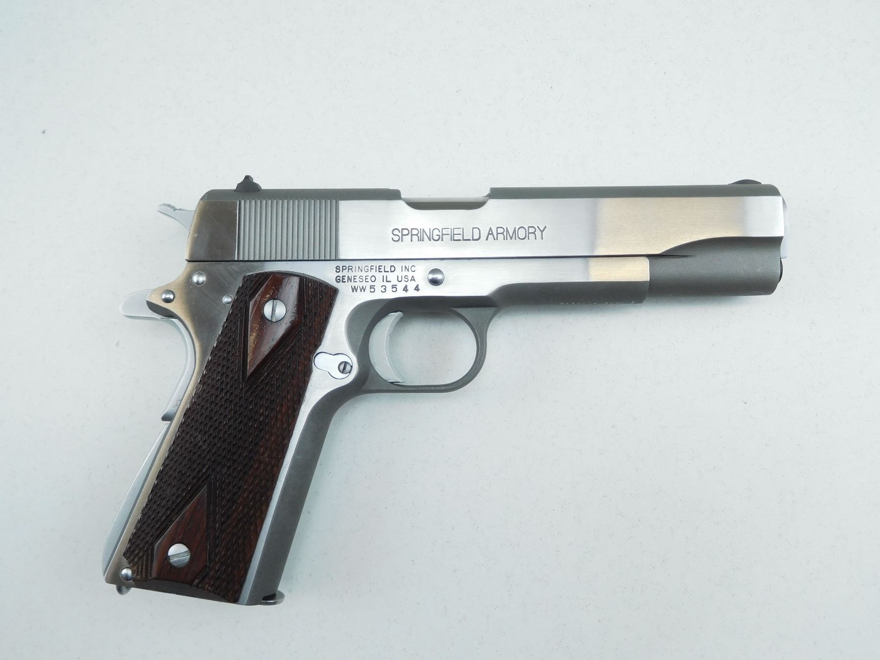 COMES WITH CASE 2 MAGAZINES AND MANUAL, SHOWS VERY LITTLE HANDLING MARKS EXCELLENT BORE, STAINLESS STEEL FINISH, FIXED FROTN AND REAR SIGHTS, CHECKERED ROSEWOOD GRIPS , SERIAL # WW53544 , ACTION: SEMI AUTOMATIC HANDGUN , BARREL LENGTH: 141MM , CONDITION: 9/10 , STOCK # R2617 , CLASS: CANADIAN RESTRICTED CLASS