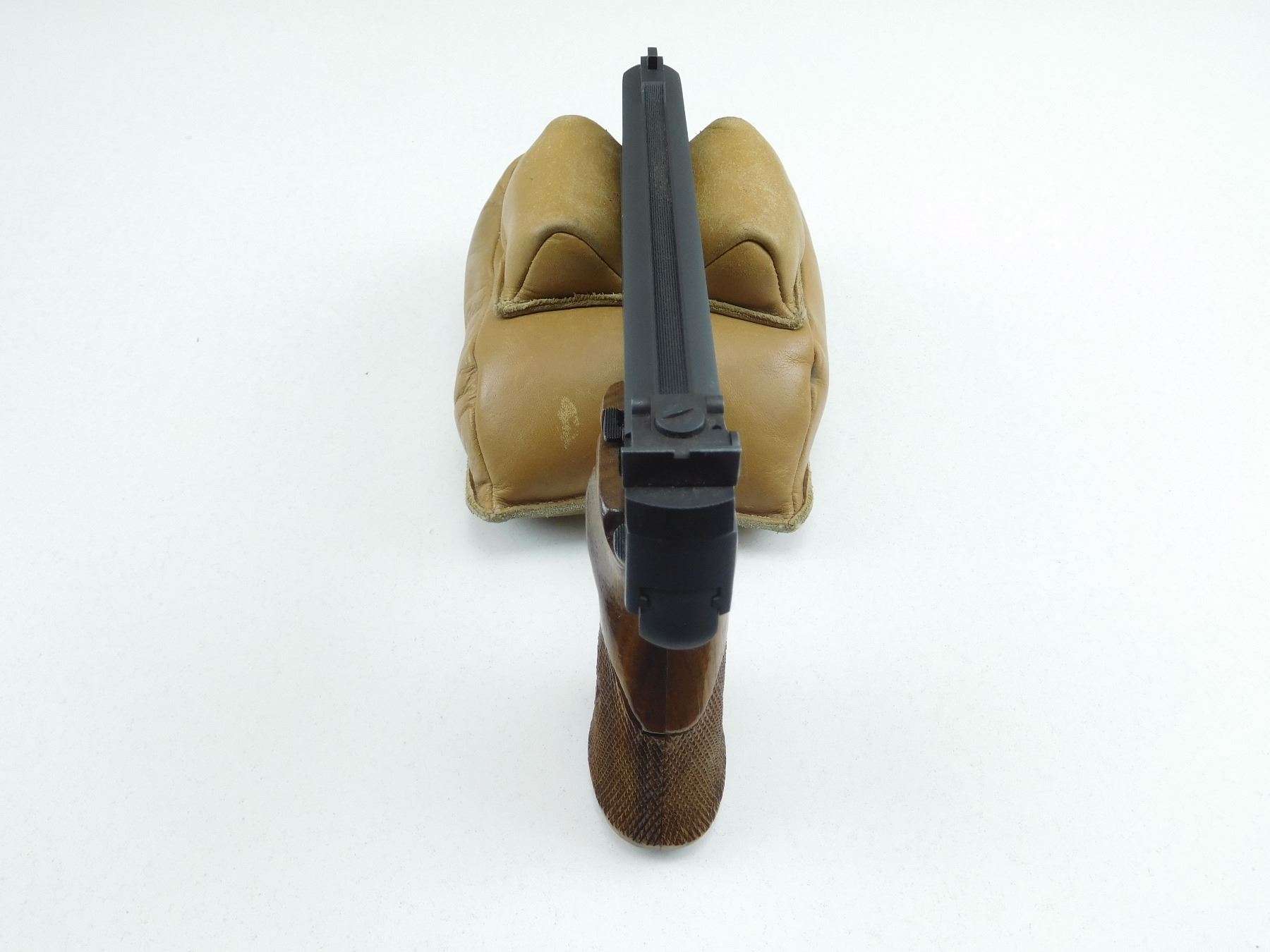 COMES WITH MAGAZINE, BLADE FRONT AND FULLY ADJUSTABLE REAR SIGHT, CHECKERED WOOD GRIPS, SHOWS VERY LITTLE HANDLING MARKS, EXCELLENT BORE , SERIAL # A574877 , ACTION: SEMI AUTOMATIC HANDGUN , BARREL LENGTH: 141MM , CONDITION: 9/10 , STOCK # R2618 , CLASS: CANADIAN RESTRICTED CLASS