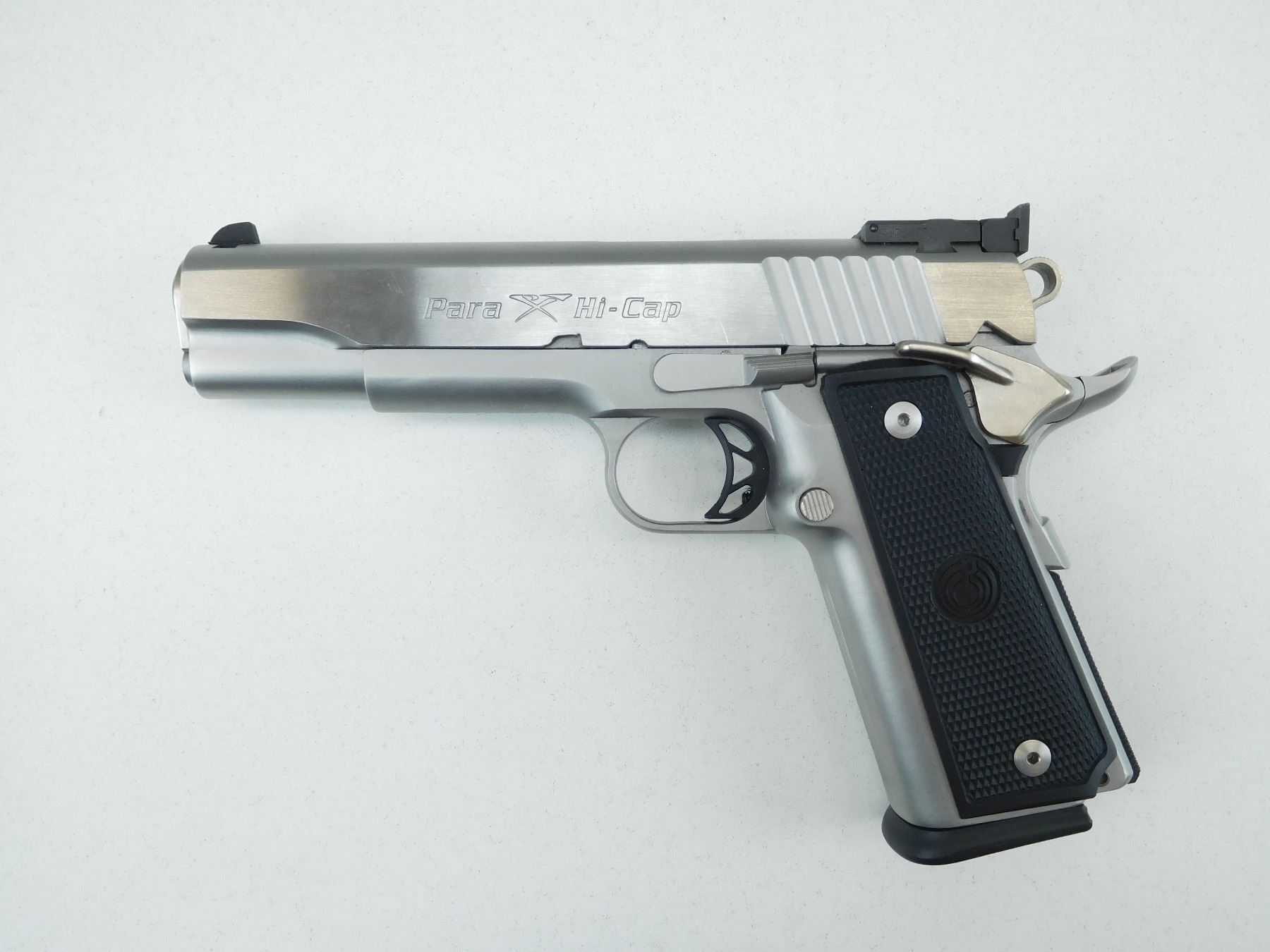 COMES WITH MAGAZINE, BORE IS EXCELLENT, BLADE FRONT AND ADJUSTABLE REAR SIGHTS, COMBAT TRIGGER AND HAMMER, BEVELLED MAGAZINE WELL, CHECKERED PLASTIC GRIPS, STAINLESS FINISH, SHOWS VERY LITTLE HANDLING MARKS , SERIAL # P150978 , ACTION: SEMI AUTOMATIC HANDGUN , BARREL LENGTH: 141MM , CONDITION: 9/10 , STOCK # R2624 , CLASS: CANADIAN RESTRICTED CLASS