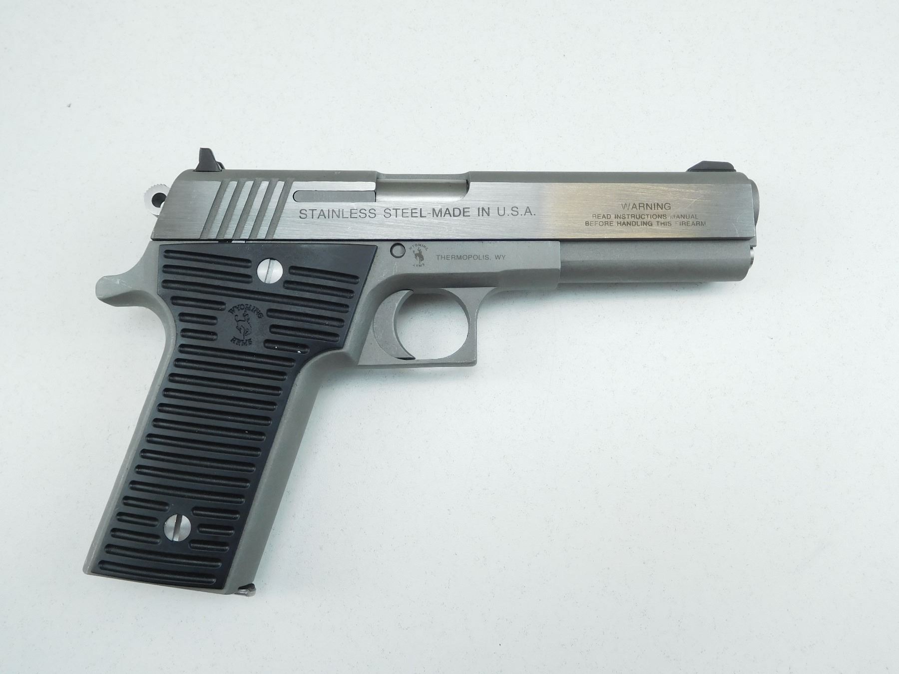 COMES WITH MAGAZINE, MATTE STAINLESS FINISH, FLOURSCENT RAMP FRONT AND ADJUSTABLE REAR SIGHT, BORE IS VERY GOOD, RUBBER GRIPS WITH HORIZONTAL GRIP SERRATIONS, SHOWS VERY LITTLE HANDLING MARKS , SERIAL # A02476 , ACTION: SEMI AUTOMATIC HANDGUN , BARREL LENGTH: 121MM , CONDITION: 9/10 , STOCK # R2632 , CLASS: CANADIAN RESTRICTED CLASS