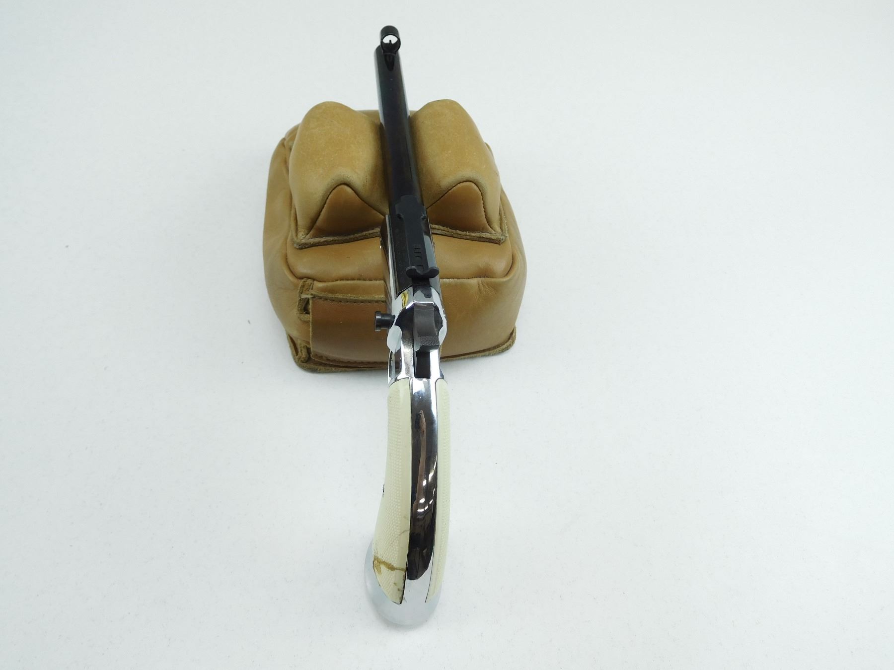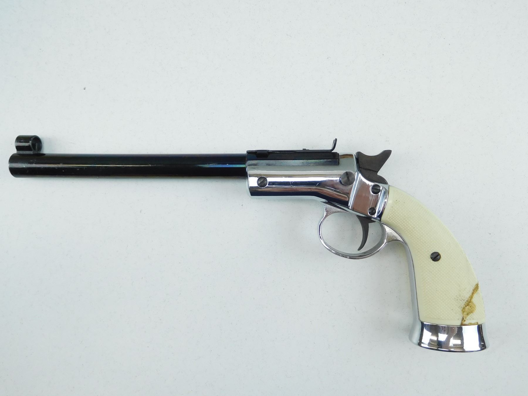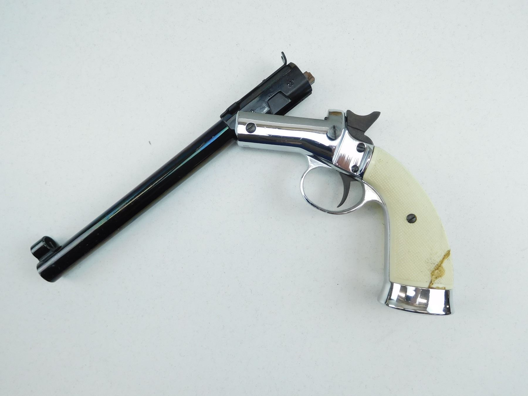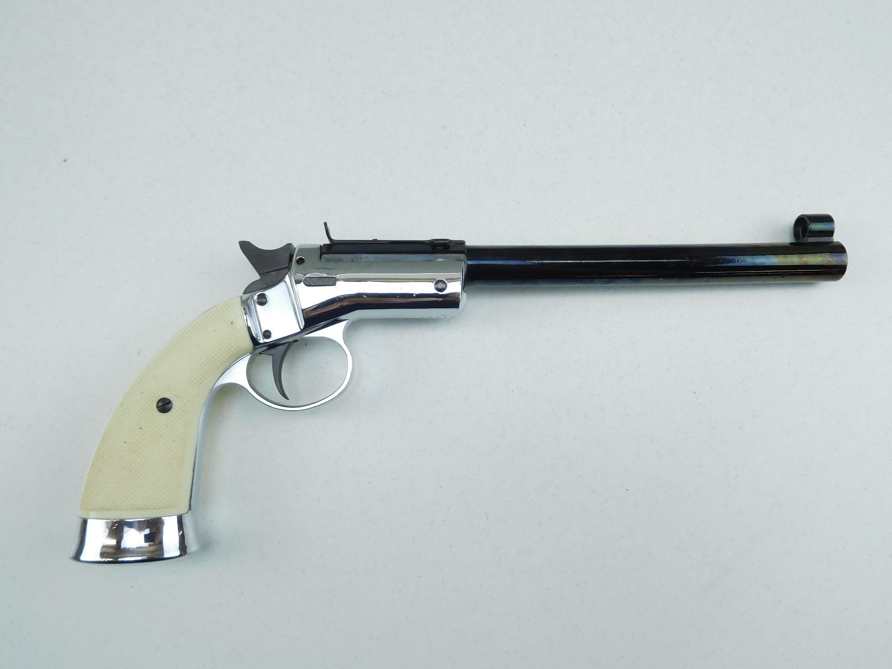 BORE IS DARK, HOODED FRONT SIGHT AND ADJUSTBALE REAR SIGHTS, CHROME FINISHED RECEIVER WITH REPAIRED WHITE PLASTIC GRIPS, SHOWS SOME HANDLING MARKS , SERIAL # 01802 , ACTION: SINGLE SHOT PISTOL , BARREL LENGTH: 203MM , CONDITION: 4/10 , STOCK # R2638 , CLASS: CANADIAN RESTRICTED CLASS