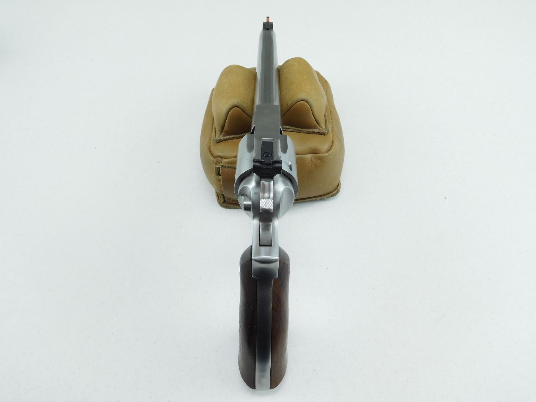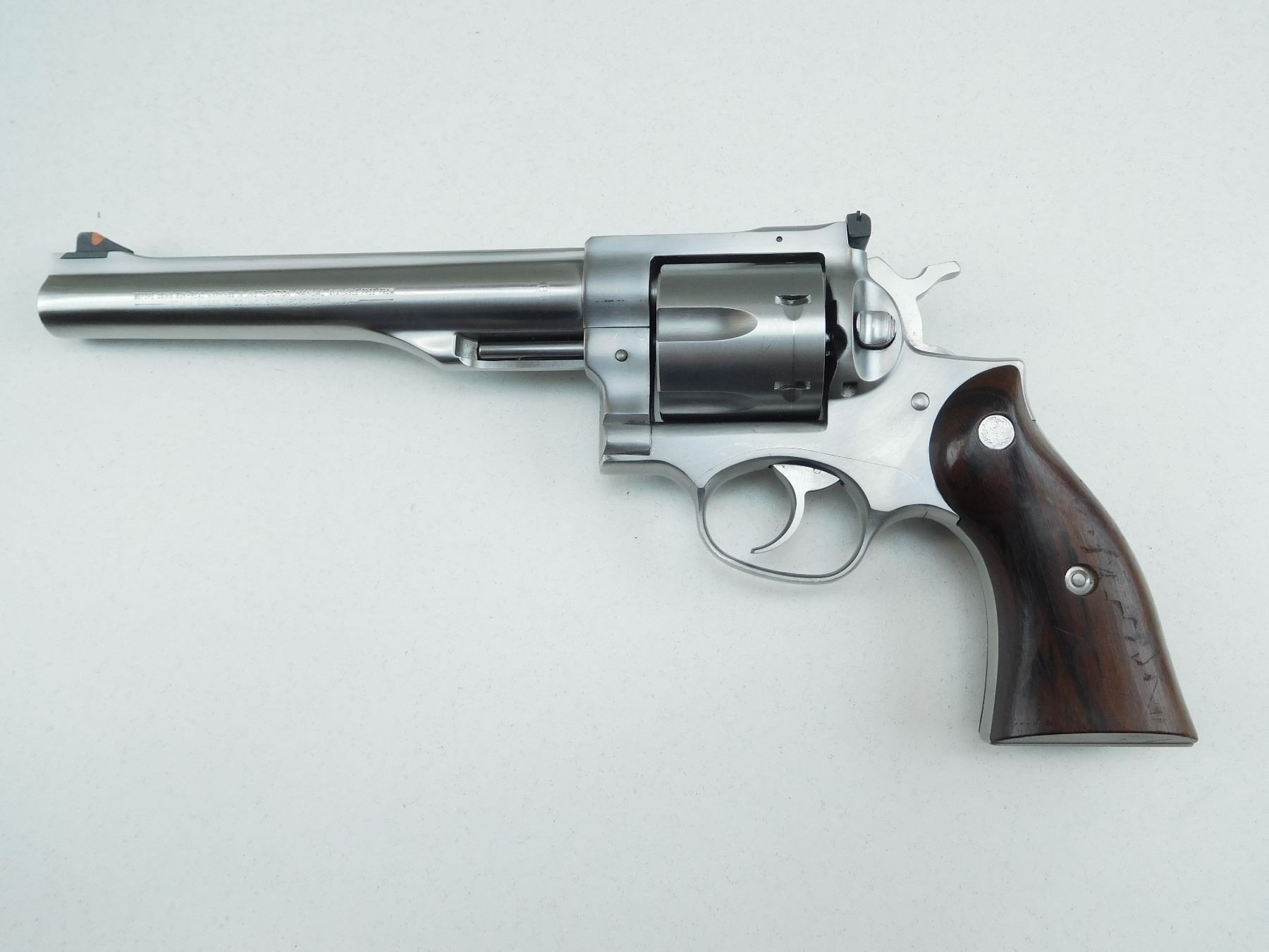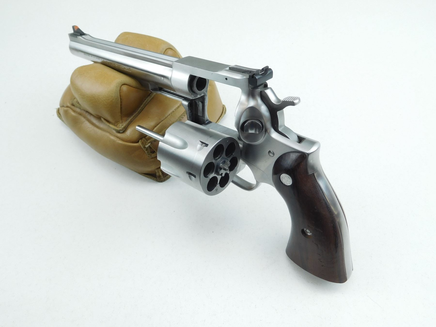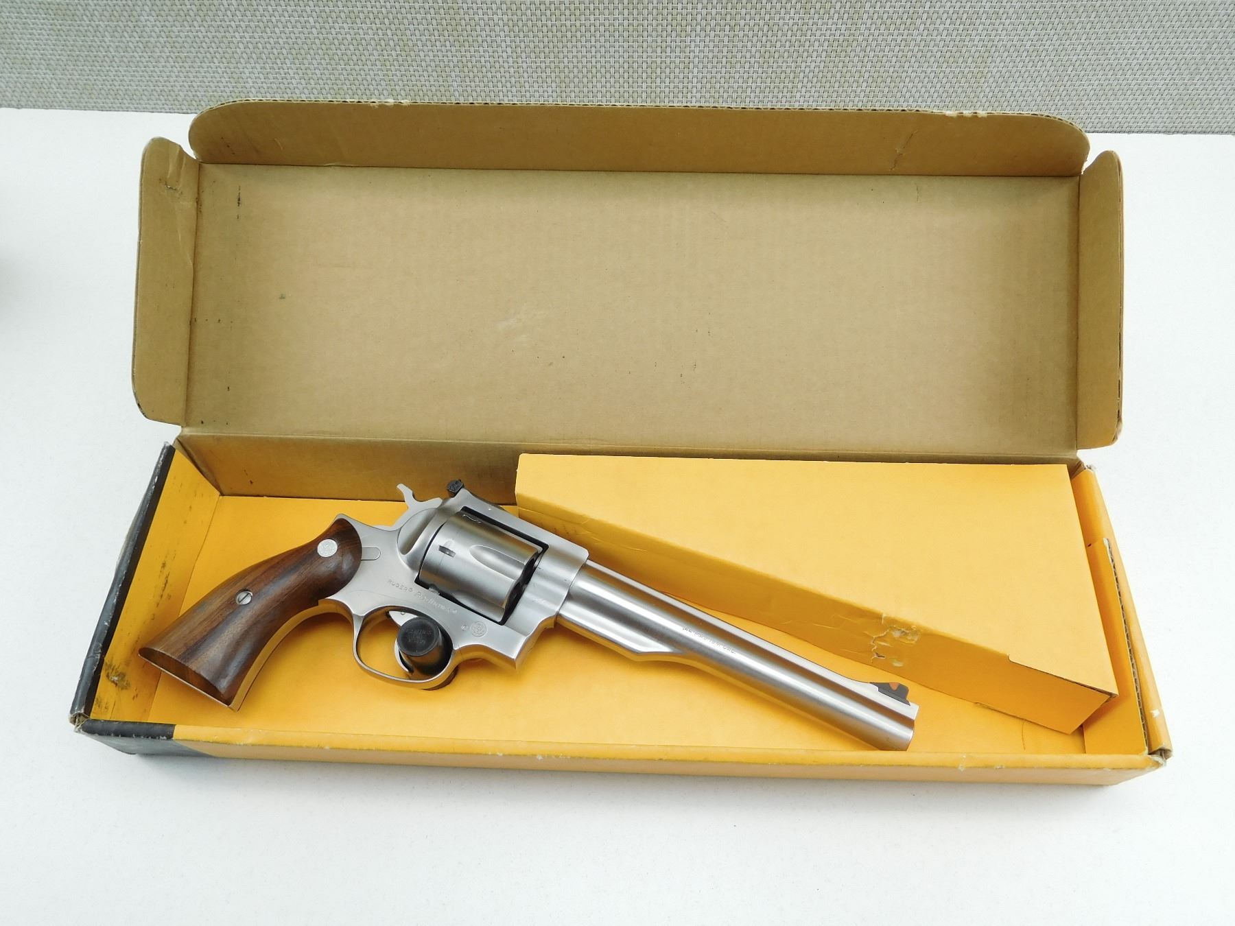 COMES WITH A BOX, 6 SHOT CAPACITY, BORE IS GOOD, RAMP FRONT SIGHT WITH ORANGE INSERT AND ADJUSTABLE REAR SIGHT, WOODEN GRIPS, STAINLESS CONSTRUCTION, SHOWS VERY LITTLE HANDLING MARKS , SERIAL # 50024180 , ACTION: REVOLVER , BARREL LENGTH: 191MM , CONDITION: 9/10 , STOCK # R2641 , CLASS: CANADIAN RESTRICTED CLASS