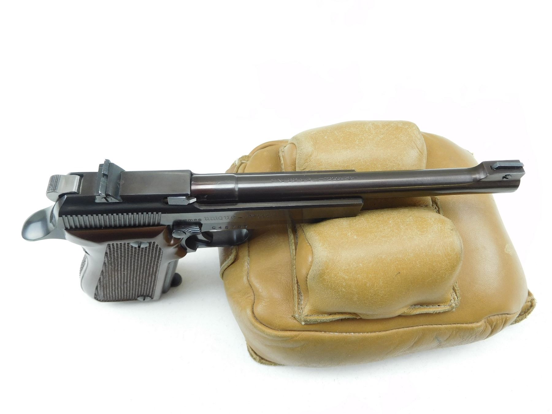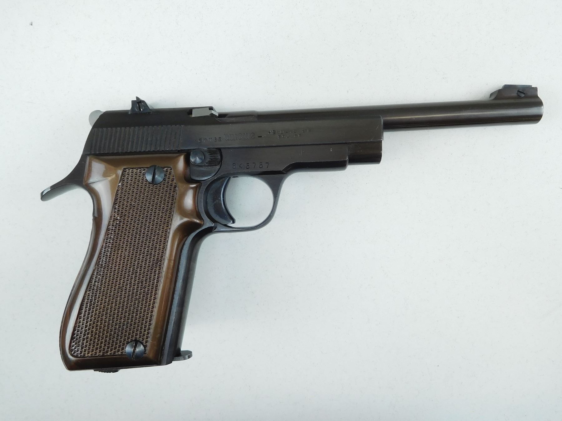 COMES WITH MAGAZINE, BORE IS VERY GOOD, CHECKERED PLASTIC GRIPS, BLADE FRONT AND DRIFT ADJUSTABLE REAR SIGHTS, SHOWS VERY LITTLE HANDLING MARKS , SERIAL # 645757 , ACTION: SEMI AUTOMATIC HANDGUN , BARREL LENGTH: 151MM , CONDITION: 8/10 , STOCK # R2643 , CLASS: CANADIAN RESTRICTED CLASS