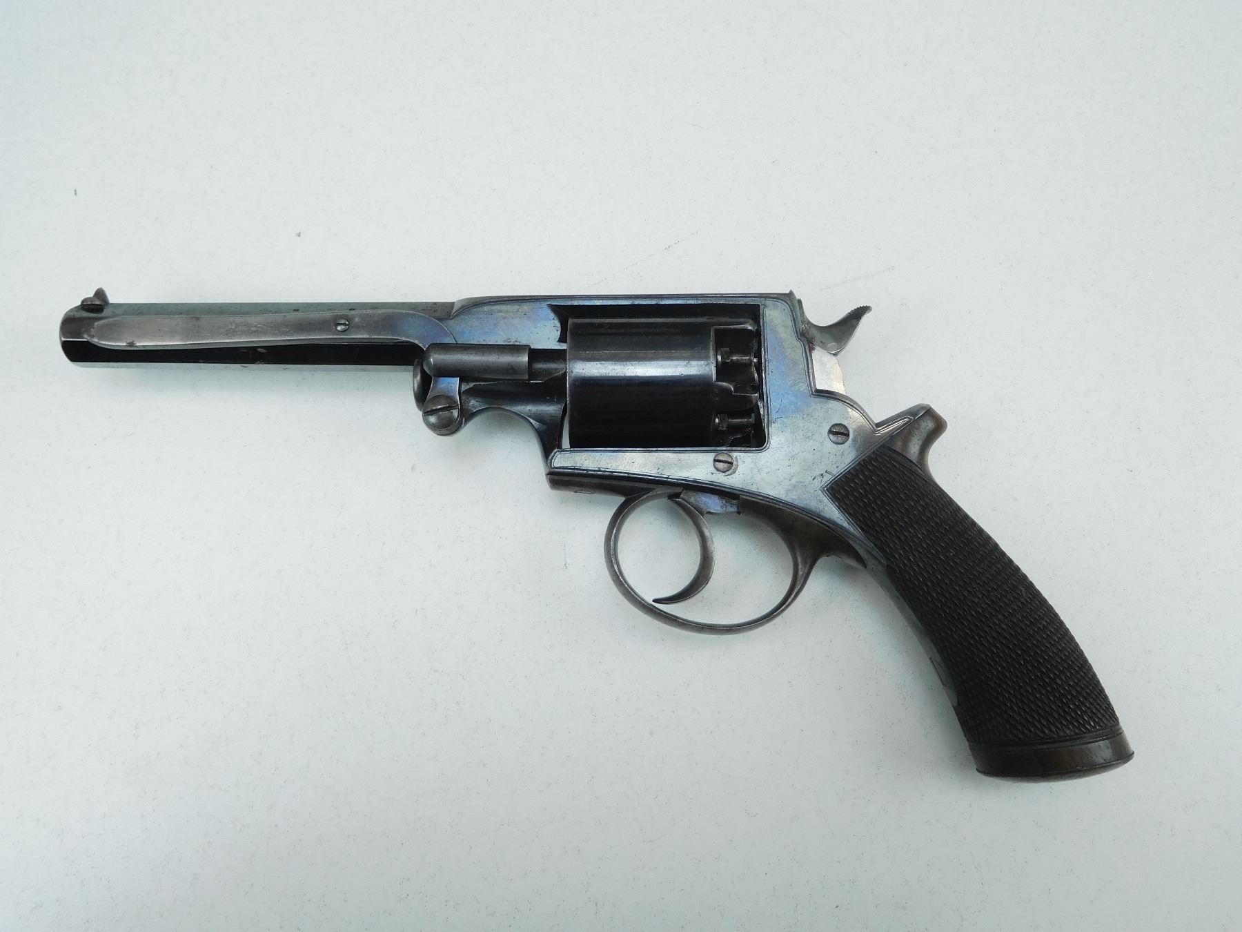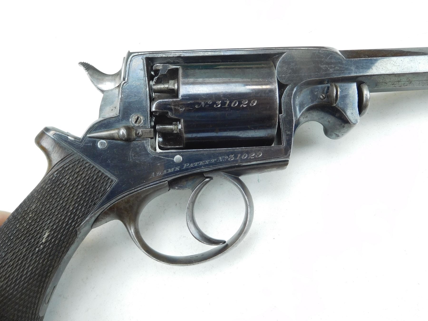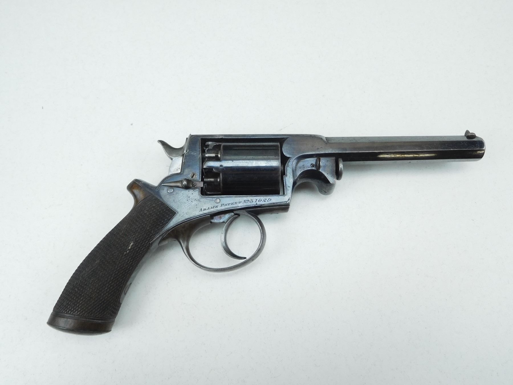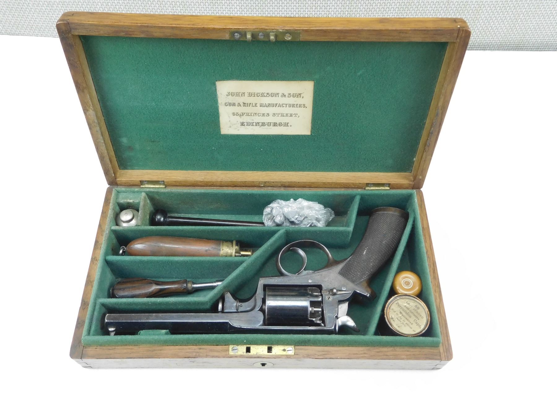 WITH WOODEN CASE, OIL BOTTLE, CLEANING ROD, SHOT FLASK, NIPPLE WRENCH, PROJECTILES, PERCUSSION CAPS AND PAPERWORK, ORIGINALLY OWNED BY CAPTAIN A HOGG LAKE CAPTAIN( IS ENGRAVED ON THE TRIGGER GUARD) OF THE HATHAWAY TUG, FIRST BOAT TO TOW BARGES OF TIMBER, 5 SHOT CAPACITY, BLADE FRONT AND RAISED NOTCH REAR SIGHT, OVATE BARREL, RETAINS MUCH OF THE RICH BLUE FINISH, CHECKERED WOODEN GRIPS WITH STEEL CAP, LOADING LEVER SHOWS SOME WEAR, SOME HANDLING MARKS THROUGHT, , SERIAL # 31029 , ACTION: REVOLVER , BARREL LENGTH: 145MM , CONDITION: ANTIQUE 7/10 , STOCK # , CLASS: CANADIAN ANTIQUE CLASS