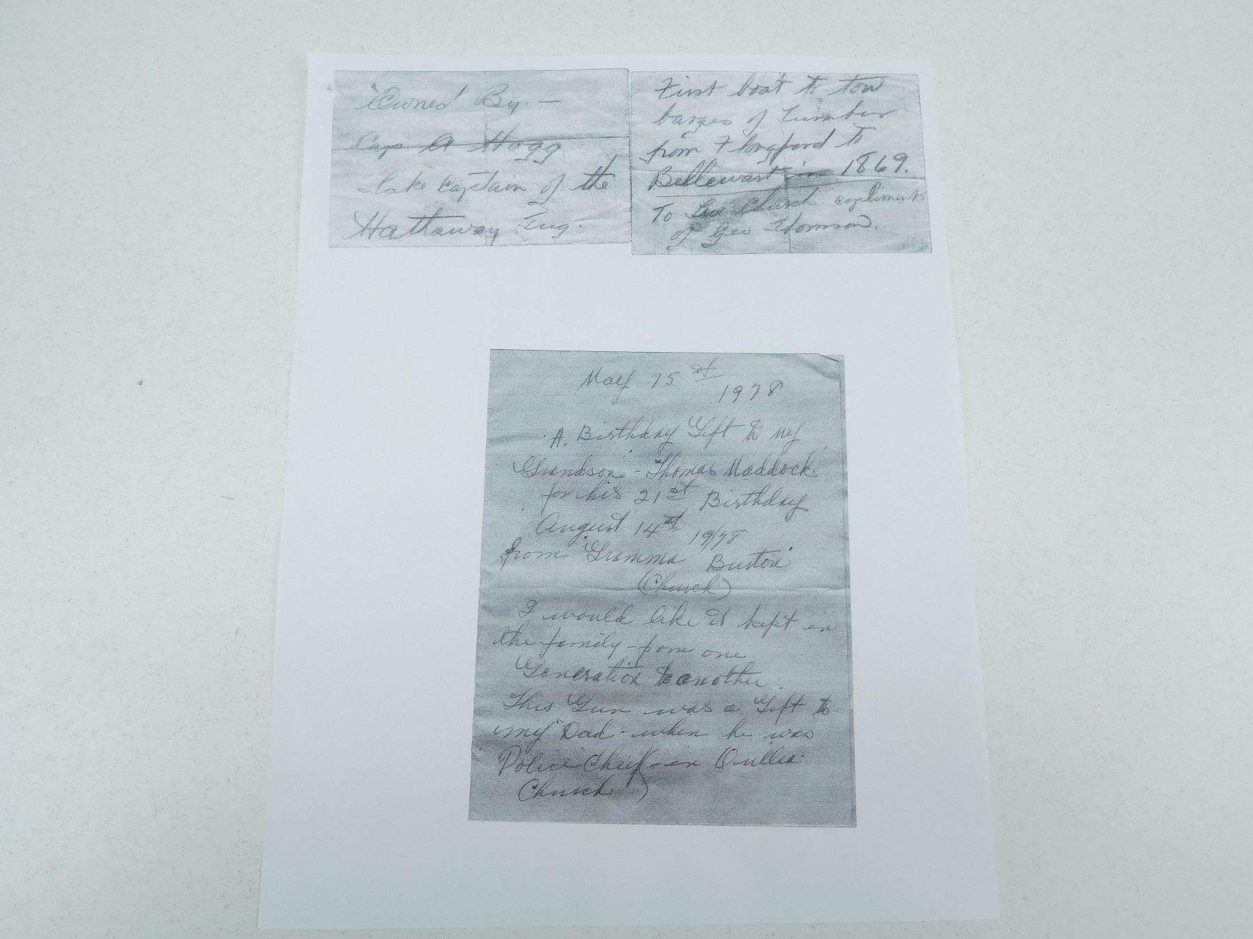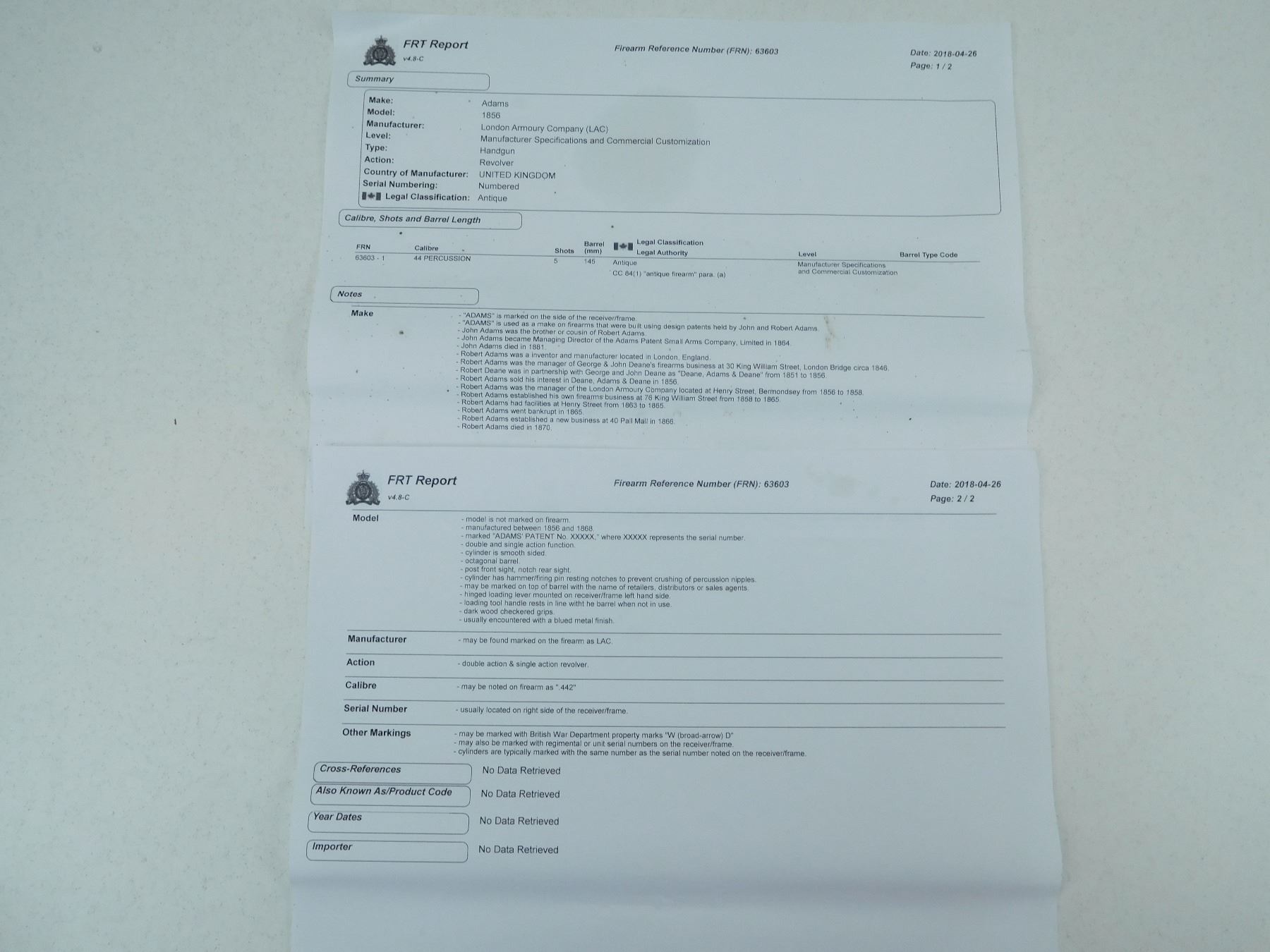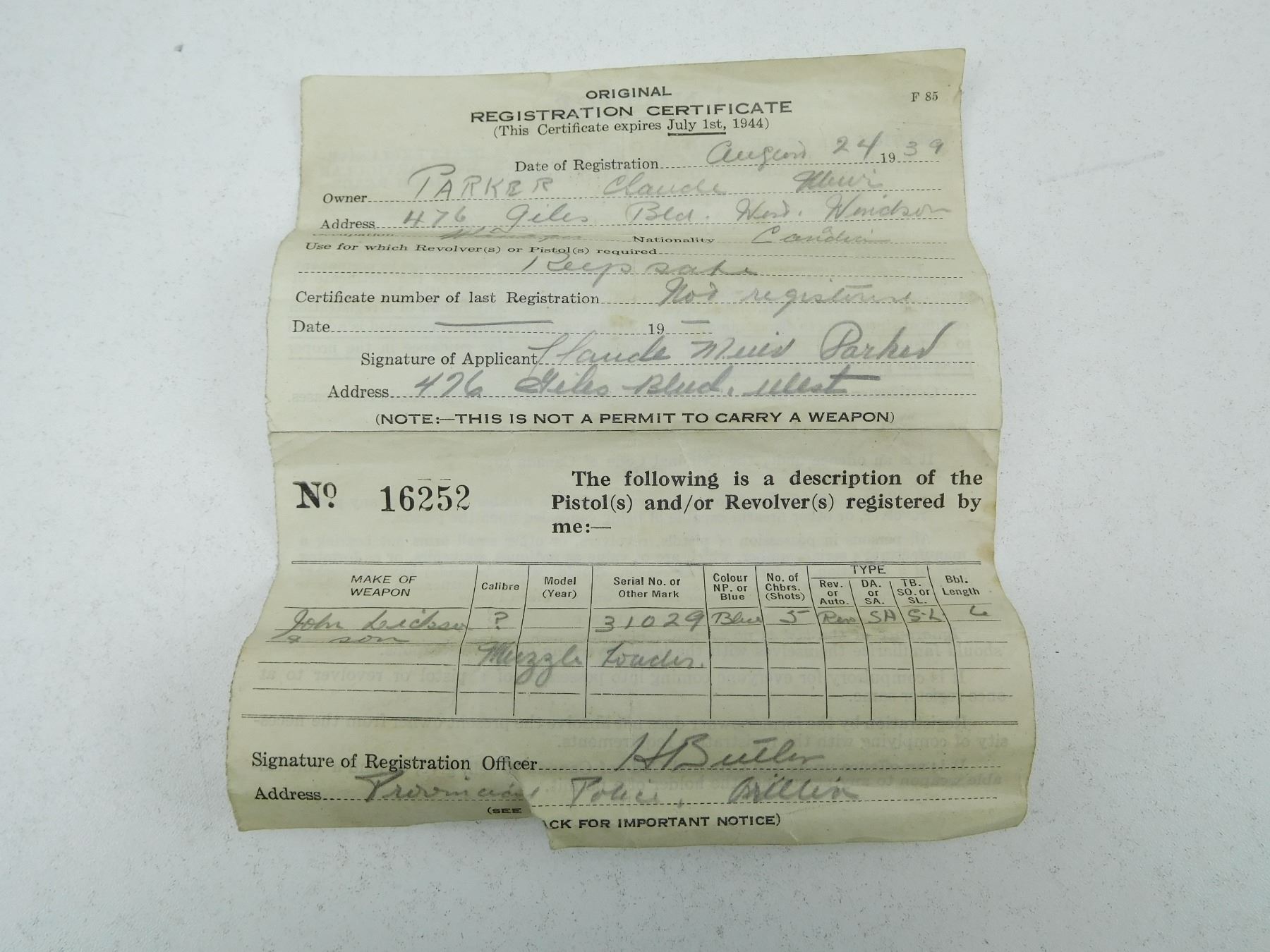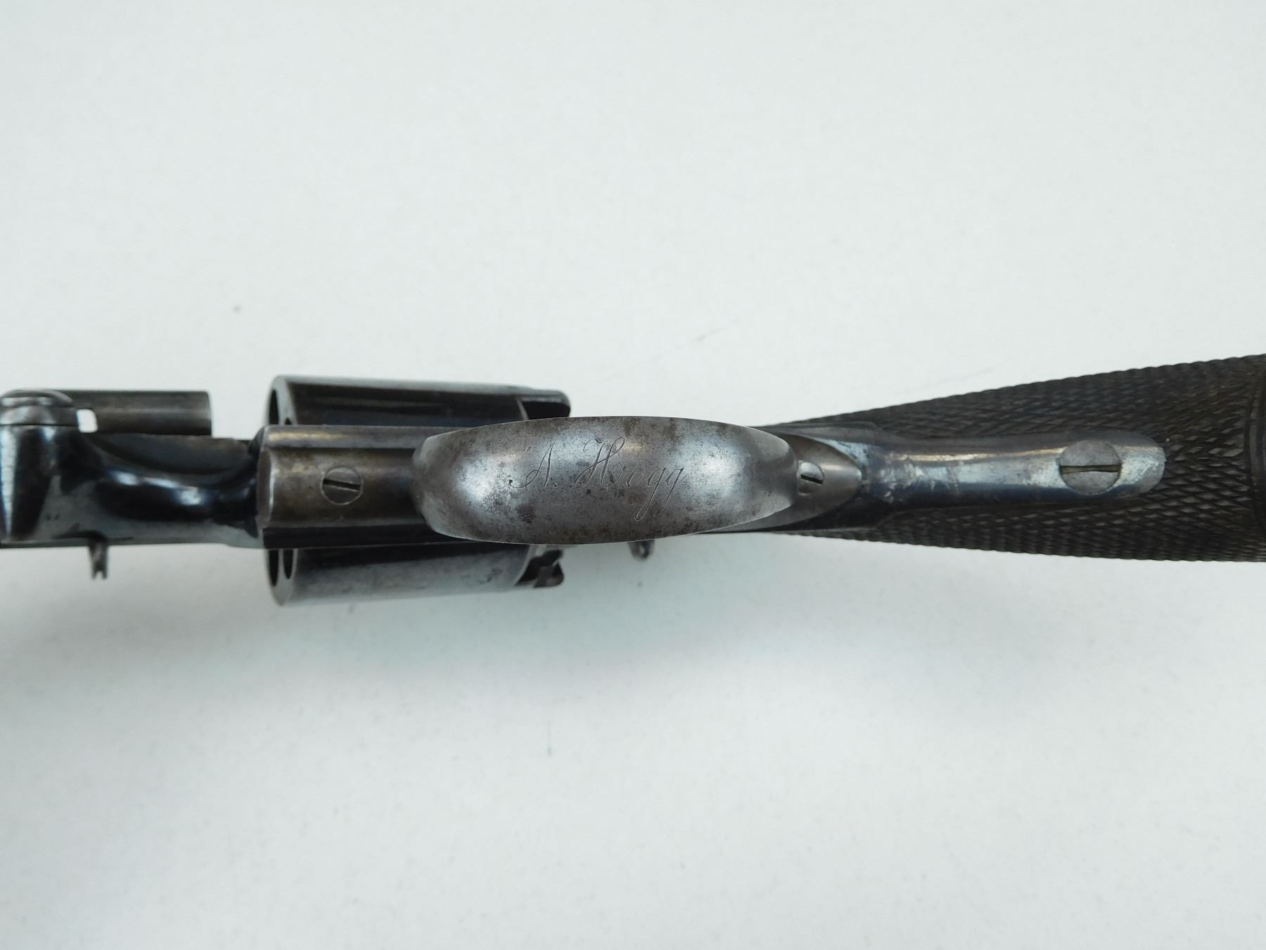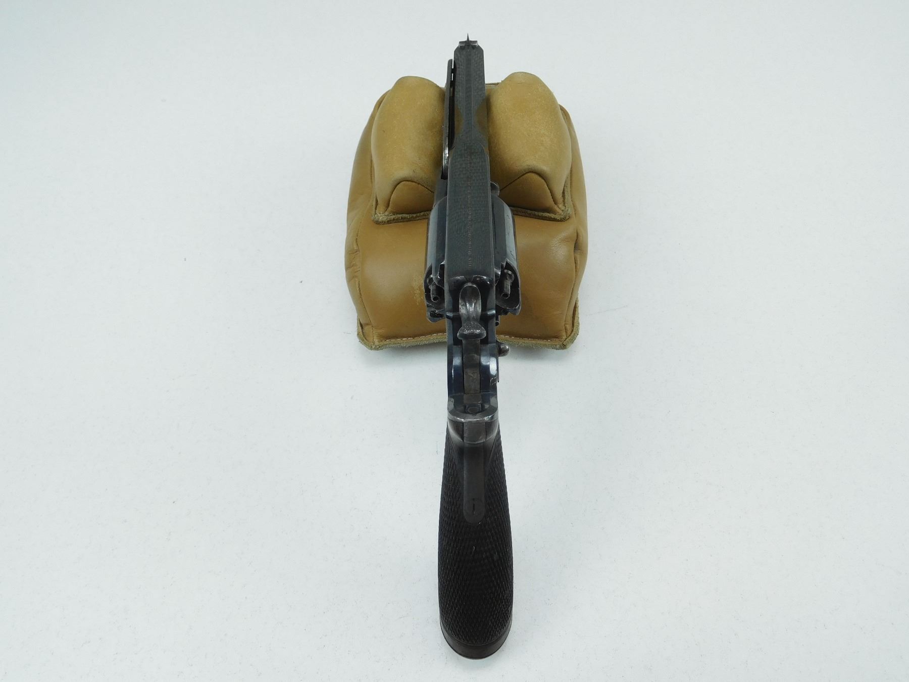 WITH WOODEN CASE, OIL BOTTLE, CLEANING ROD, SHOT FLASK, NIPPLE WRENCH, PROJECTILES, PERCUSSION CAPS AND PAPERWORK, ORIGINALLY OWNED BY CAPTAIN A HOGG LAKE CAPTAIN( IS ENGRAVED ON THE TRIGGER GUARD) OF THE HATHAWAY TUG, FIRST BOAT TO TOW BARGES OF TIMBER, 5 SHOT CAPACITY, BLADE FRONT AND RAISED NOTCH REAR SIGHT, OVATE BARREL, RETAINS MUCH OF THE RICH BLUE FINISH, CHECKERED WOODEN GRIPS WITH STEEL CAP, LOADING LEVER SHOWS SOME WEAR, SOME HANDLING MARKS THROUGHT, , SERIAL # 31029 , ACTION: REVOLVER , BARREL LENGTH: 145MM , CONDITION: ANTIQUE 7/10 , STOCK # , CLASS: CANADIAN ANTIQUE CLASS