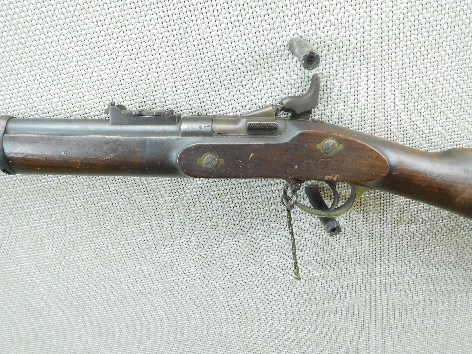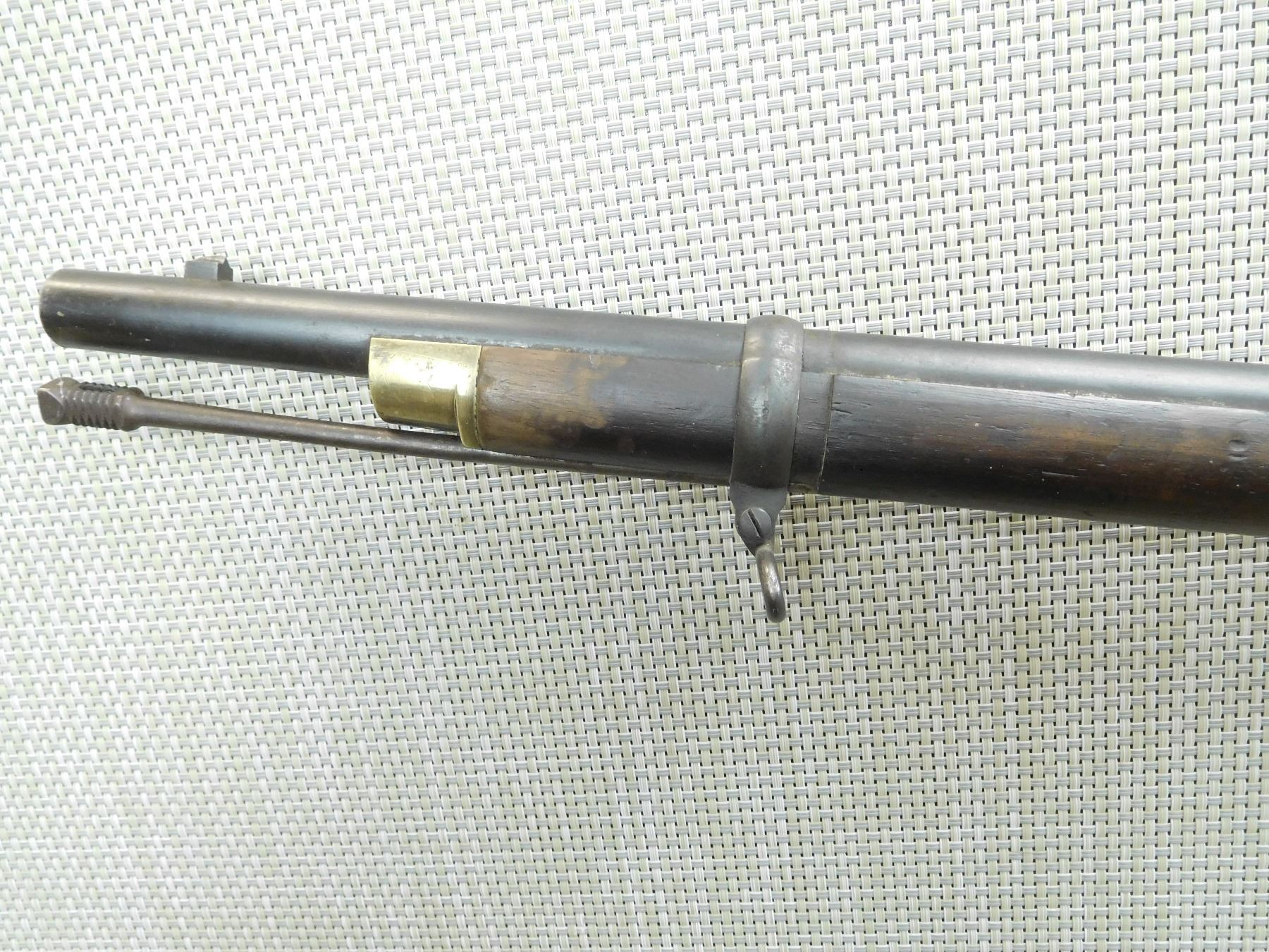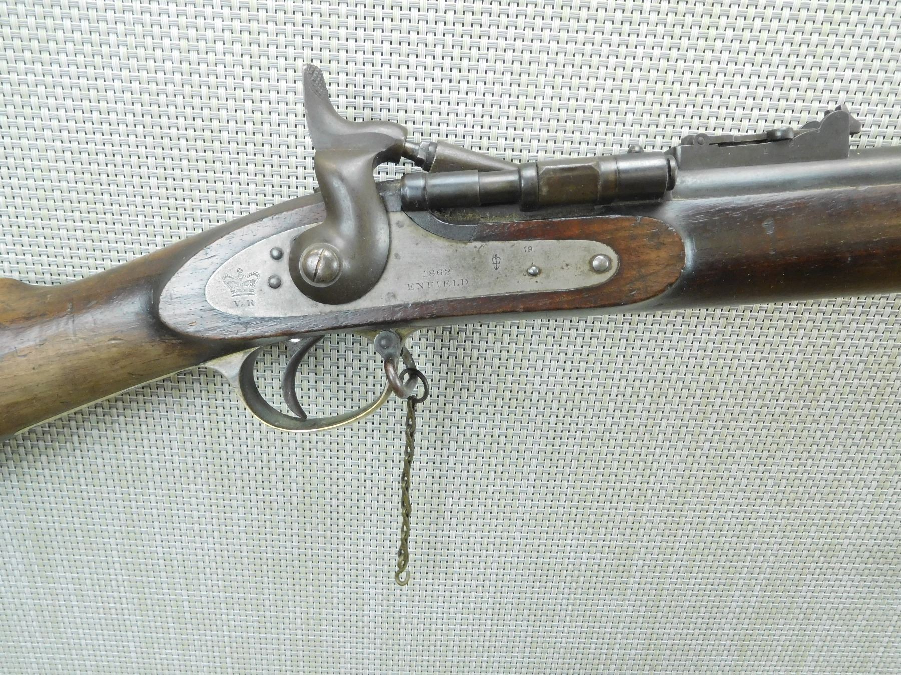 MADE IN 1862, BLADE FRONT AND ADJUSTABLE REAR SIGHTS, RETAINS FULL MILITARY CONFIGURATION, NUMEROUS MILITARY MARKS, DARK BORE, SLING SWIVEL STUDS, RETAINS ORIGINAL NIPPLE PROTECTOR CHAIN BUT MISSING THE NIPPLE PROTECTOR, BRASS FURNITUIRE, ORIGINAL RAM ROD, SHOWS SOME HANDLING MARKS , SERIAL # 6532 , ACTION: SINGLE SHOT RIFLE , BARREL LENGTH: 39" , CONDITION: ANTIQUE 6/10 , STOCK # , CLASS: CANADIAN ANTIQUE CLASS