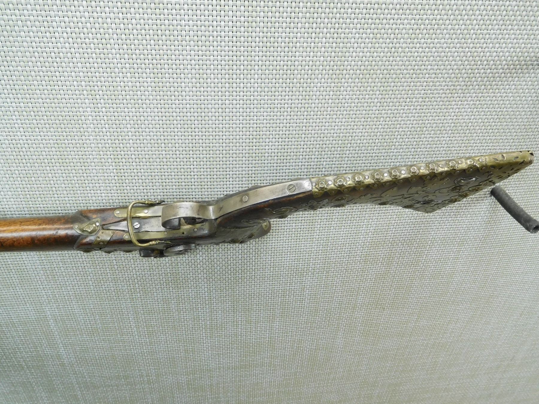 SHOWS EXTENSIVE HANDLING MARKS, HAMMER DOES NOT LINE UP WITH NIPPLE, HEAVY BRASS INLAYED STOCK, SLING SWIVEL LOOP AT THE REAR, BEAD FRONT AND RAISED REAR SIGHT, RAM ROD, BORE IS DARK , SERIAL # N/A , ACTION: SINGLE SHOT , BARREL LENGTH: 32" , CONDITION: ANTIQUE 4/10 , STOCK # , CLASS: CANADIAN ANTIQUE CLASS