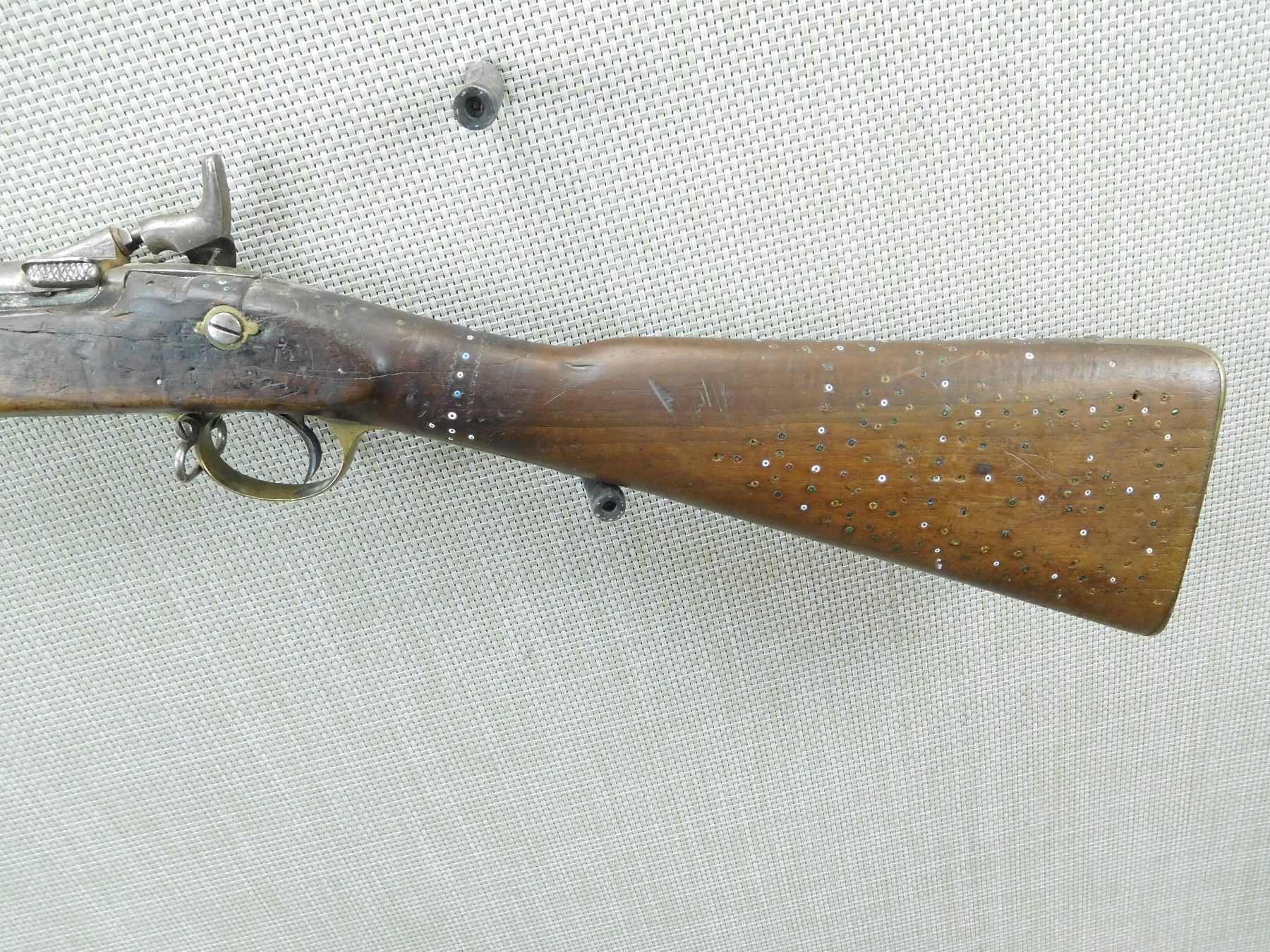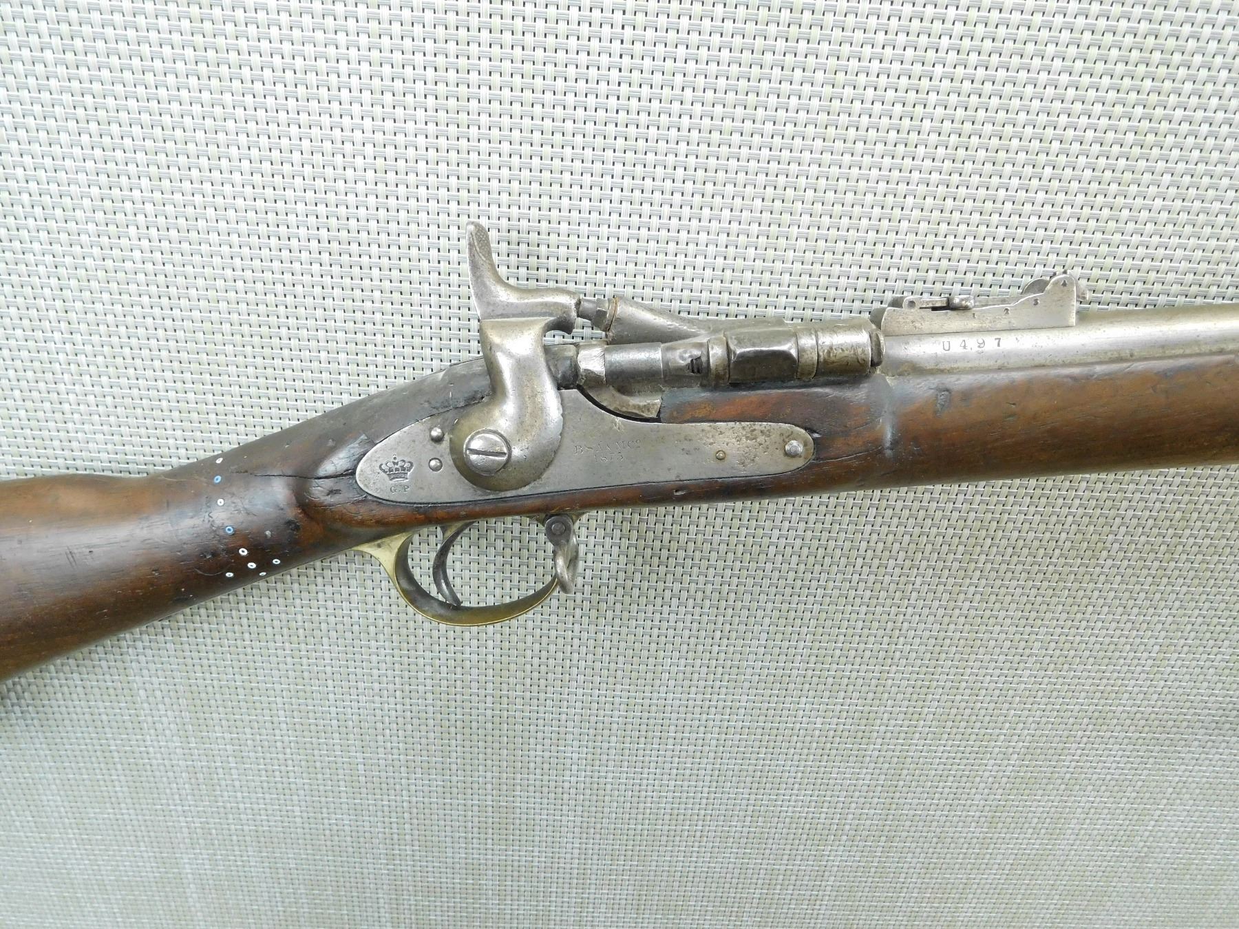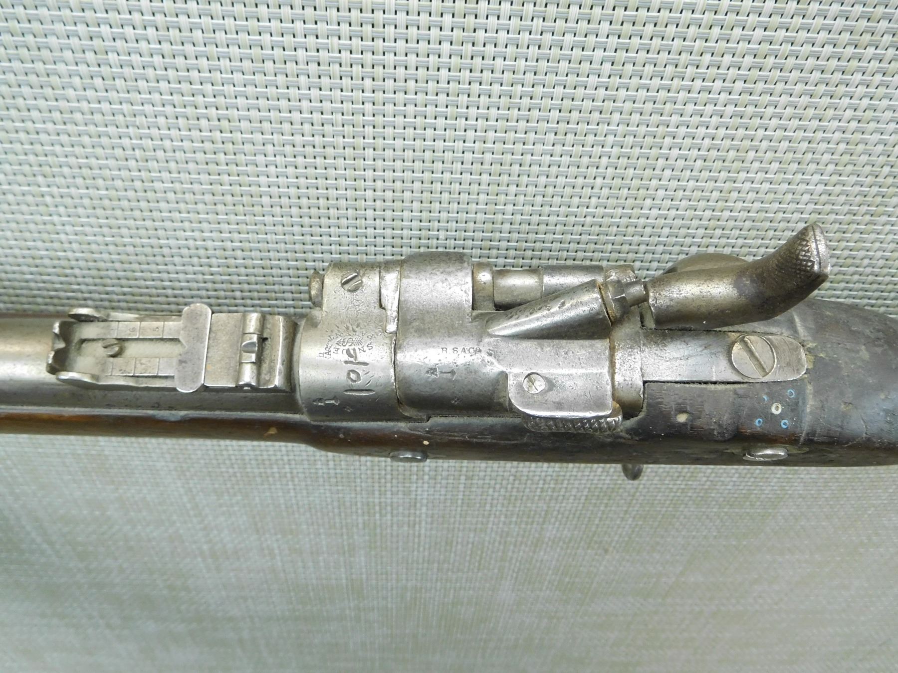 LOCK IS DATED 1875, MANUFACTURED BY BSA, REPLACED RAM ROD, BLADE FRONT AND ADJUSTABLE REAR SIGHT, BUTT STOCK HAS BEEN REPAIRED AND IS CHIPPED AND CRACKED, NUMEROUS BEADS INLAYED IN THE BUTT STOCK,SLING SWIVELS, SHOWS EXTENSIVE HANDLING MARKS, BORE IS DARK , SERIAL # U497 , ACTION: SINGLE SHOT RIFLE , BARREL LENGTH: 31" , CONDITION: ANTIQUE 4/10 , STOCK # , CLASS: CANADIAN ANTIQUE CLASS