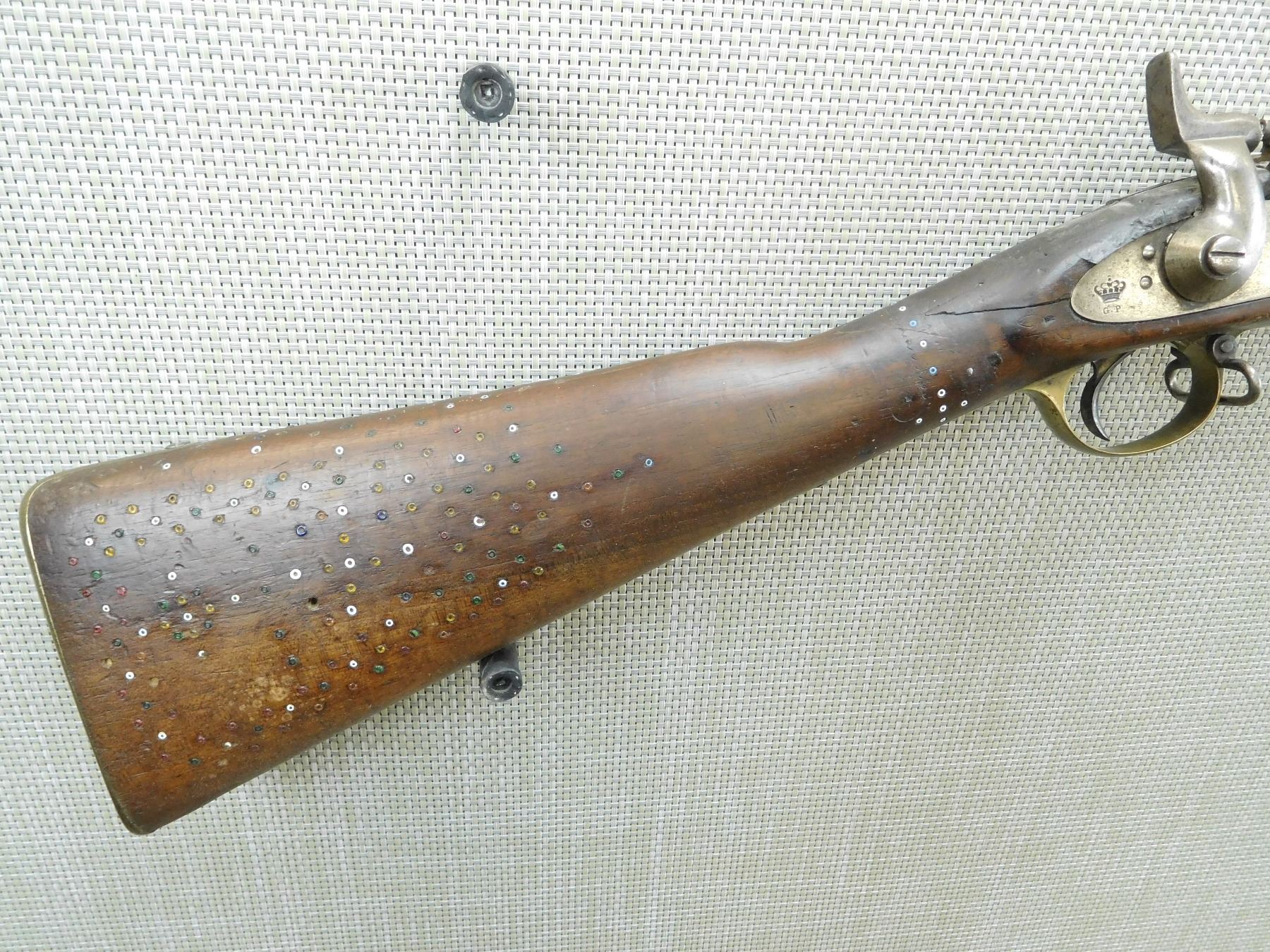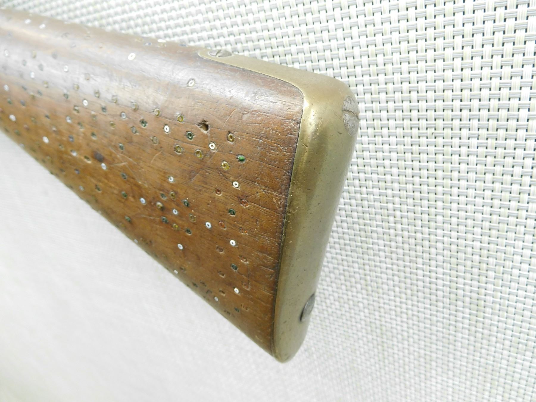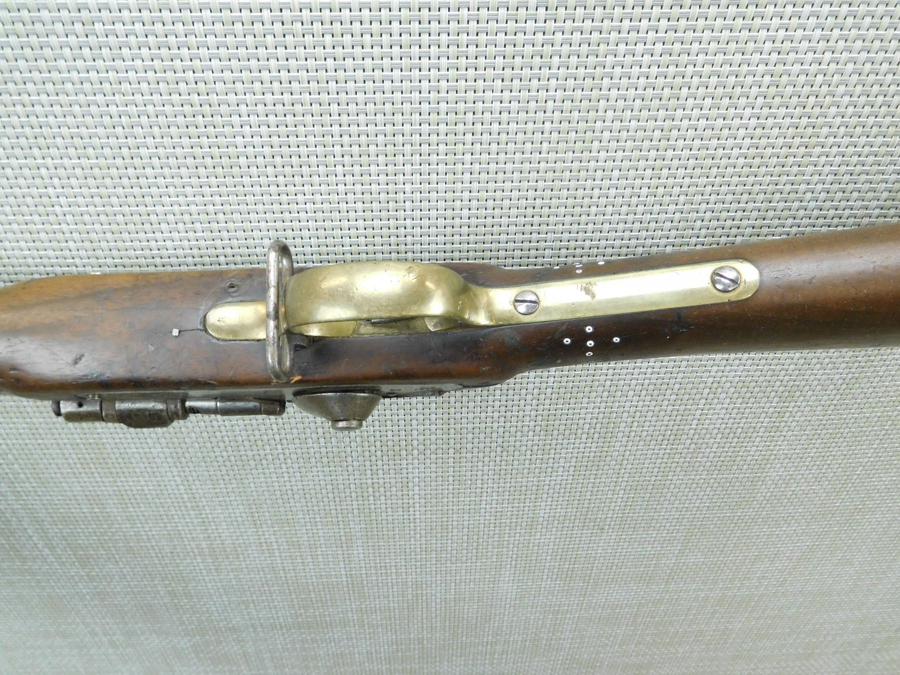 LOCK IS DATED 1875, MANUFACTURED BY BSA, REPLACED RAM ROD, BLADE FRONT AND ADJUSTABLE REAR SIGHT, BUTT STOCK HAS BEEN REPAIRED AND IS CHIPPED AND CRACKED, NUMEROUS BEADS INLAYED IN THE BUTT STOCK,SLING SWIVELS, SHOWS EXTENSIVE HANDLING MARKS, BORE IS DARK , SERIAL # U497 , ACTION: SINGLE SHOT RIFLE , BARREL LENGTH: 31" , CONDITION: ANTIQUE 4/10 , STOCK # , CLASS: CANADIAN ANTIQUE CLASS