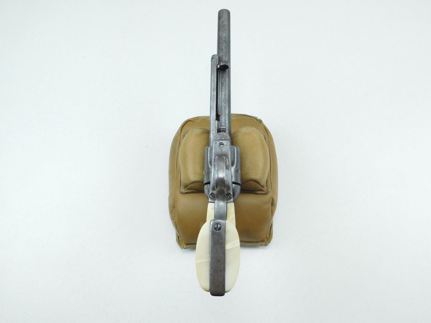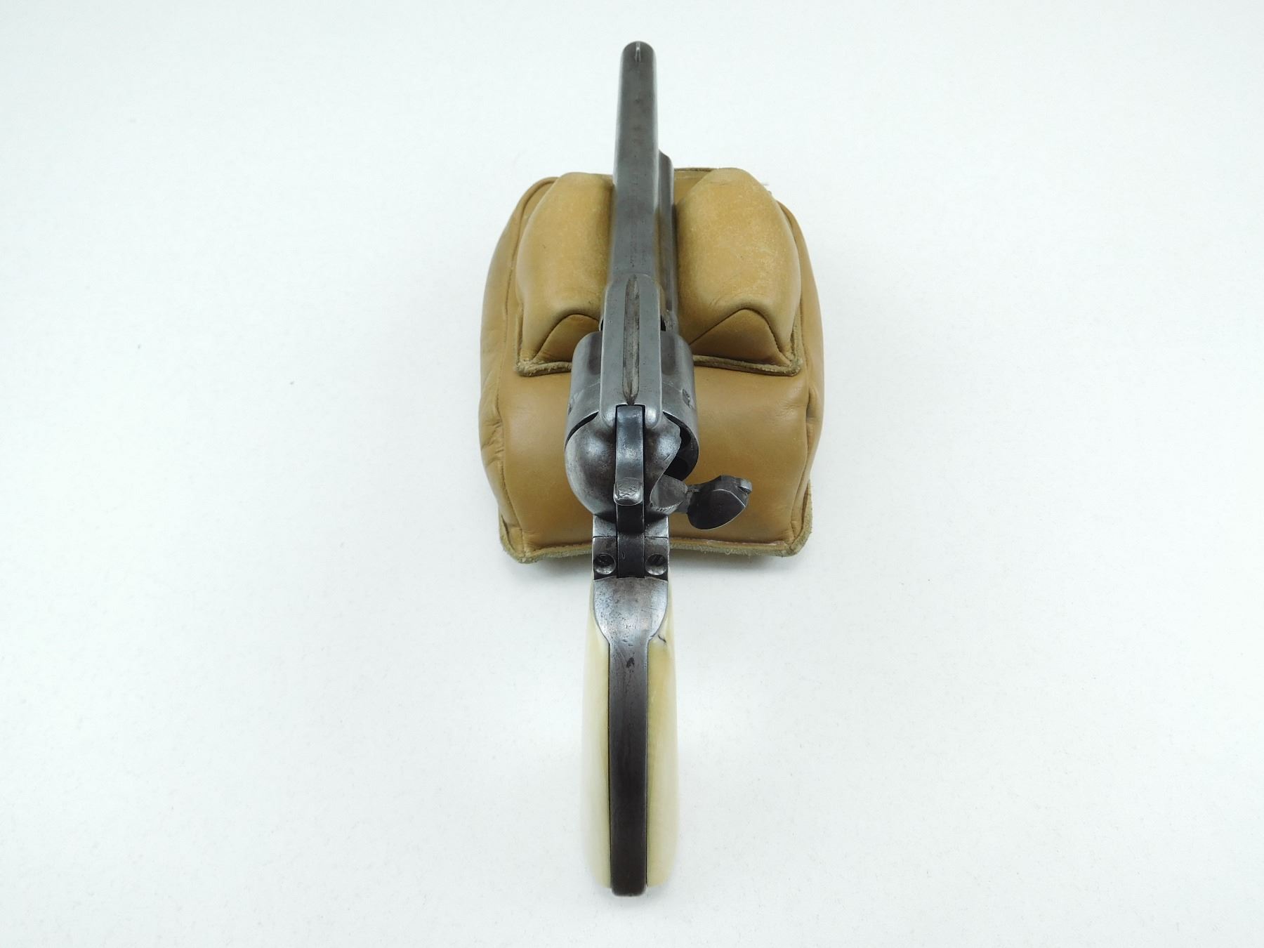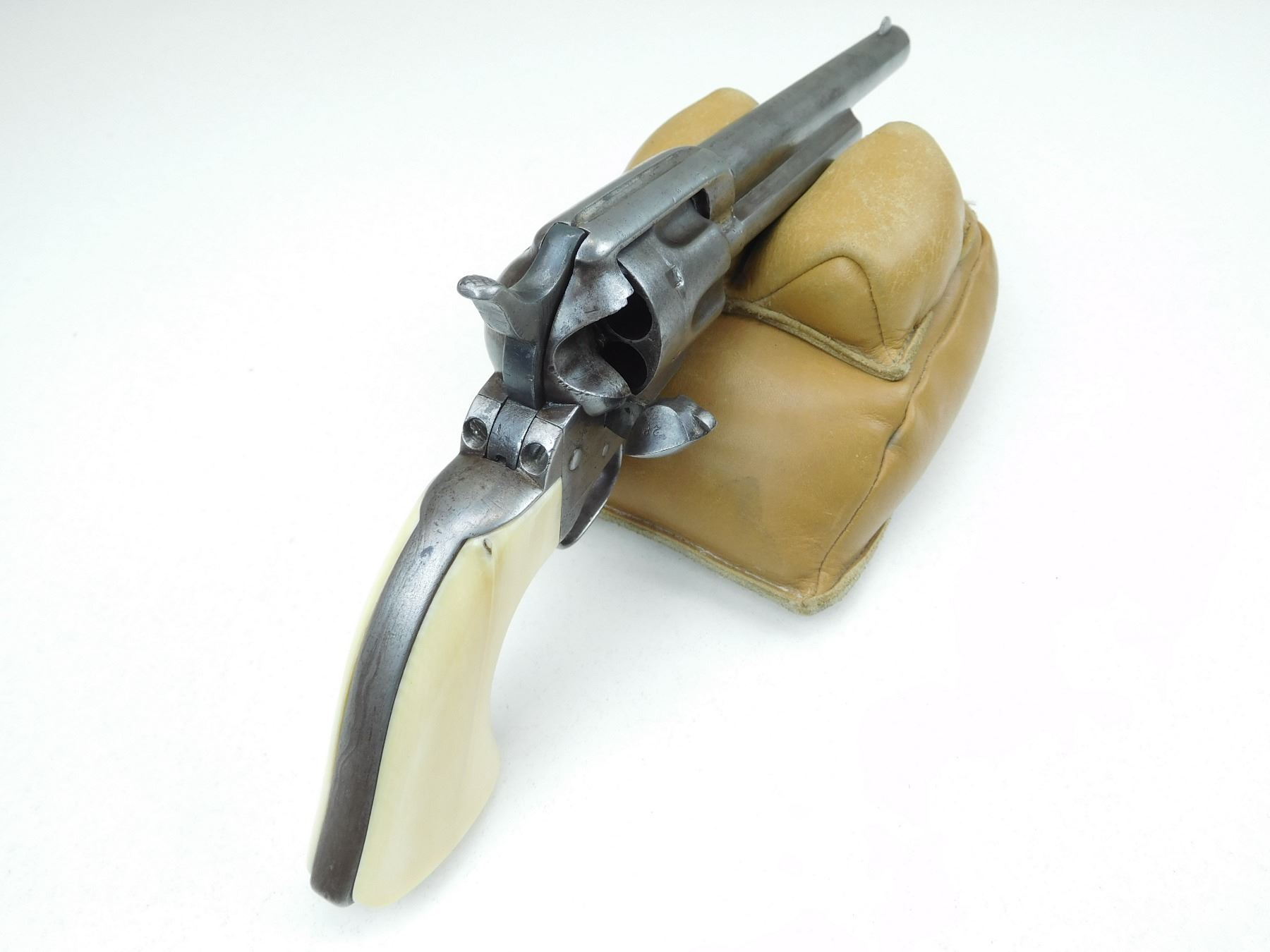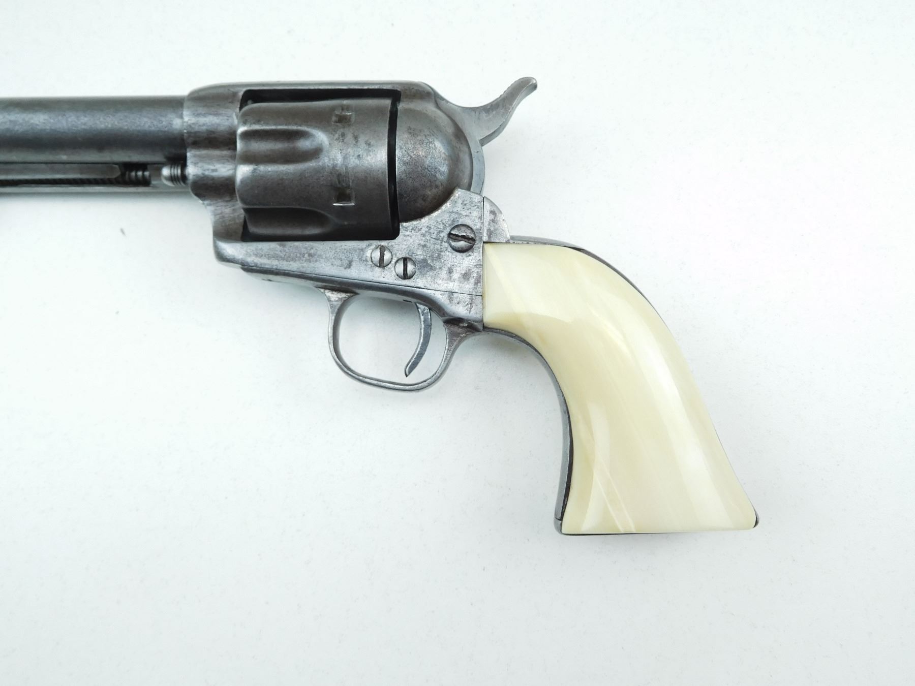 1873 COLT MADE IN 1ST YEAR OF PRODUCTION, SERIAL # 36 ON THE TRIGGER GUARD AND RECEIVER, US BARREL ADDRESS, BLADE FRONT AND NOTCHED RECEIVER REAR SIGHT, GREY PATINA OVERALL, BONE GRIPS, INDEXES SPORADICALLY, BORE IS BRIGHT WITH VERY MINOR PITTING , SERIAL # 36 , ACTION: REVOLVER , BARREL LENGTH: 191MM , CONDITION: ANTIQUE 7/10 , STOCK # , CLASS: CANADIAN ANTIQUE CLASS
