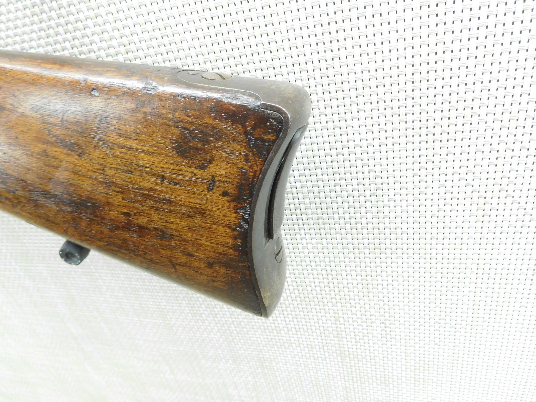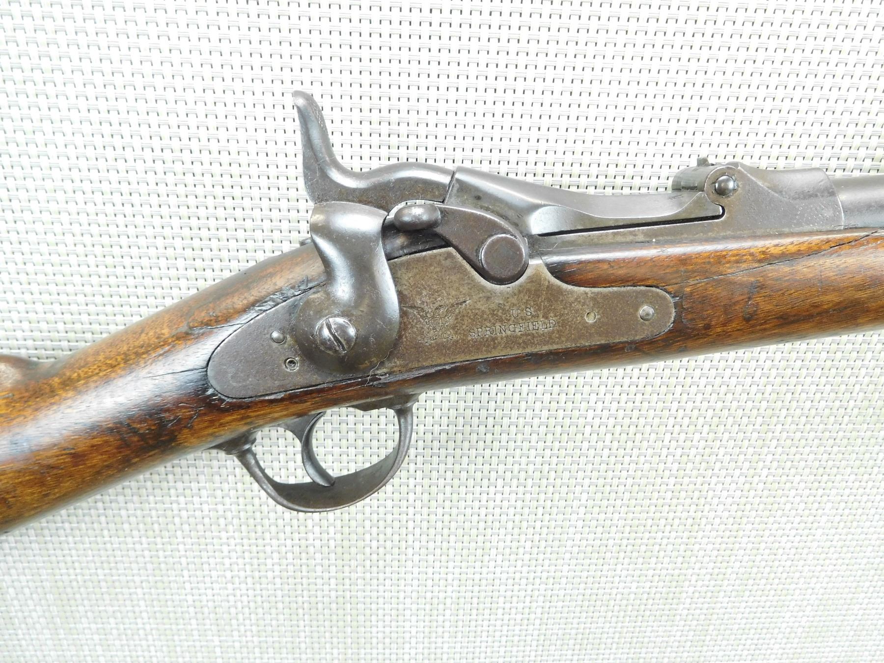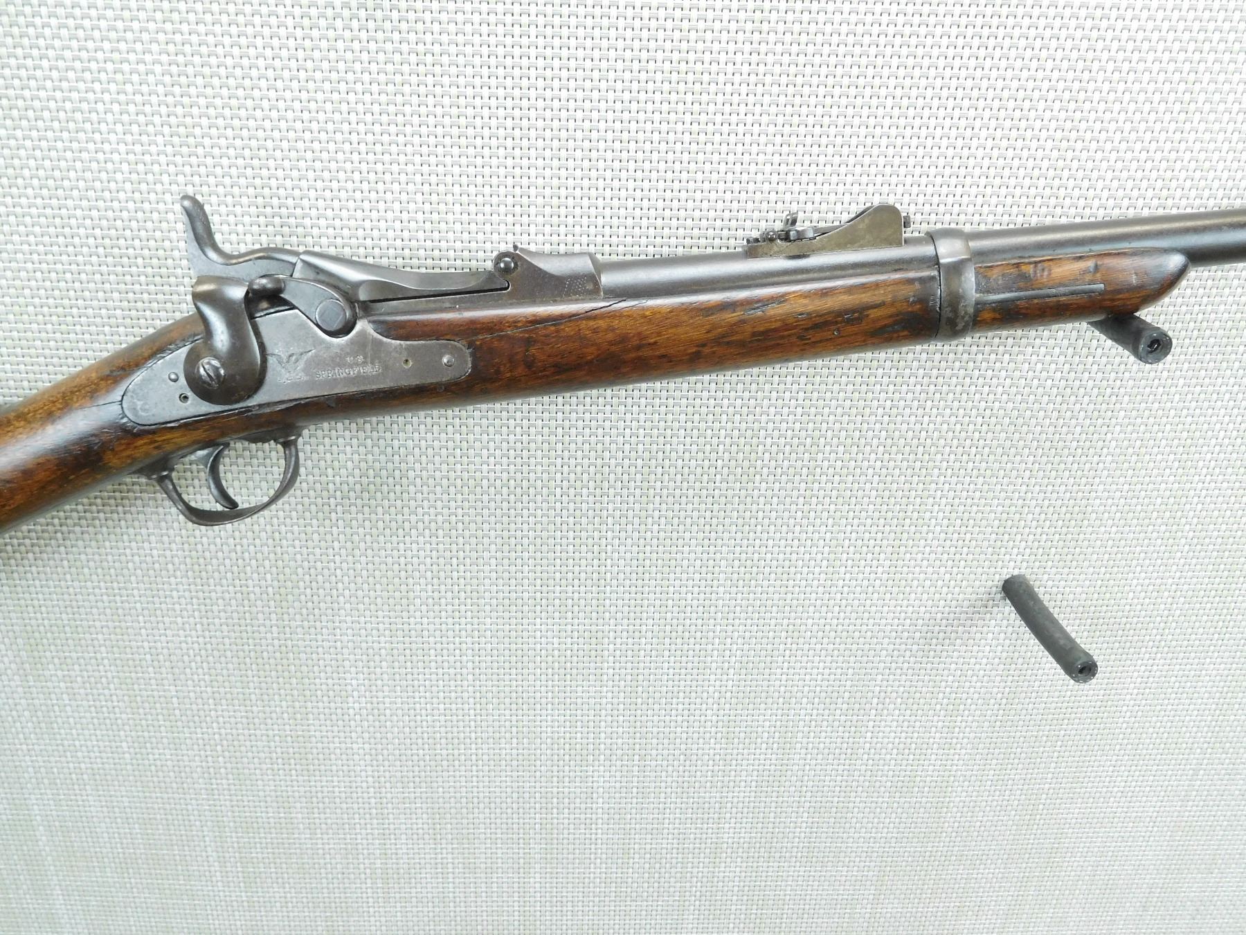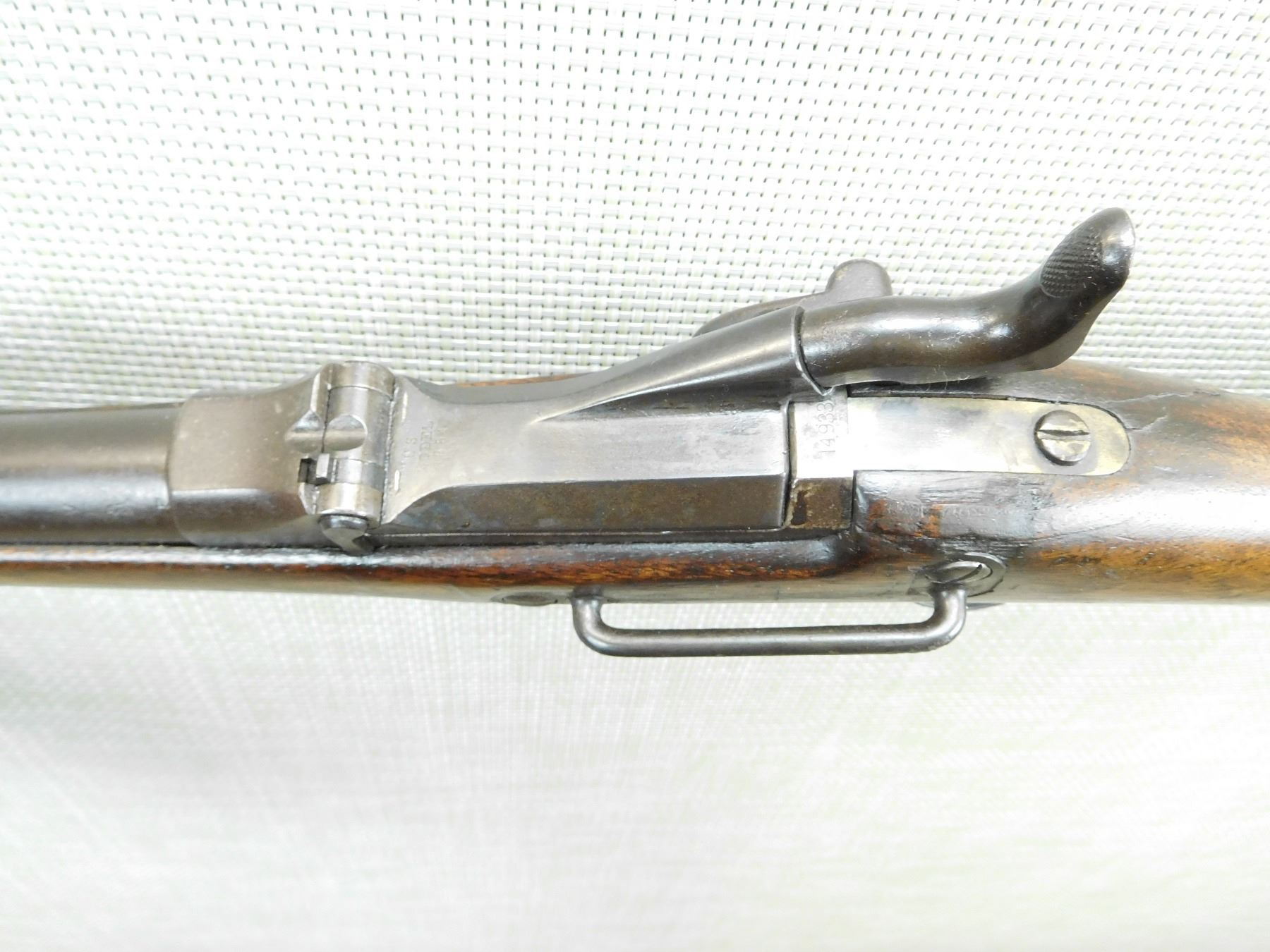 GOOD BORE, BLADE FRONT AND ADJUSTABLE REAR SIGHTS, SADDLE BAR, ATTACHMENT, LOCK IS A US SPRINGFIELD UNDATED WITH AMERICAN EAGLE MOTIF, BUTT PLATE IS MARKED US, STOCK IS CRACKED AT THE WRIST, SHOWS EXTENSIVE HANDLING MARKS, ACTION IS TIGHT, SOME MINOR SURFACE PITTING, TRAP DOOR IN BUTT OPENS IT IS MISSING THE RAM ROD , SERIAL # 149332 , ACTION: SINGLE SHOT RIFLE , BARREL LENGTH: 22" , CONDITION: ANTIQUE 5/10 , STOCK # , CLASS: CANADIAN ANTIQUE CLASS