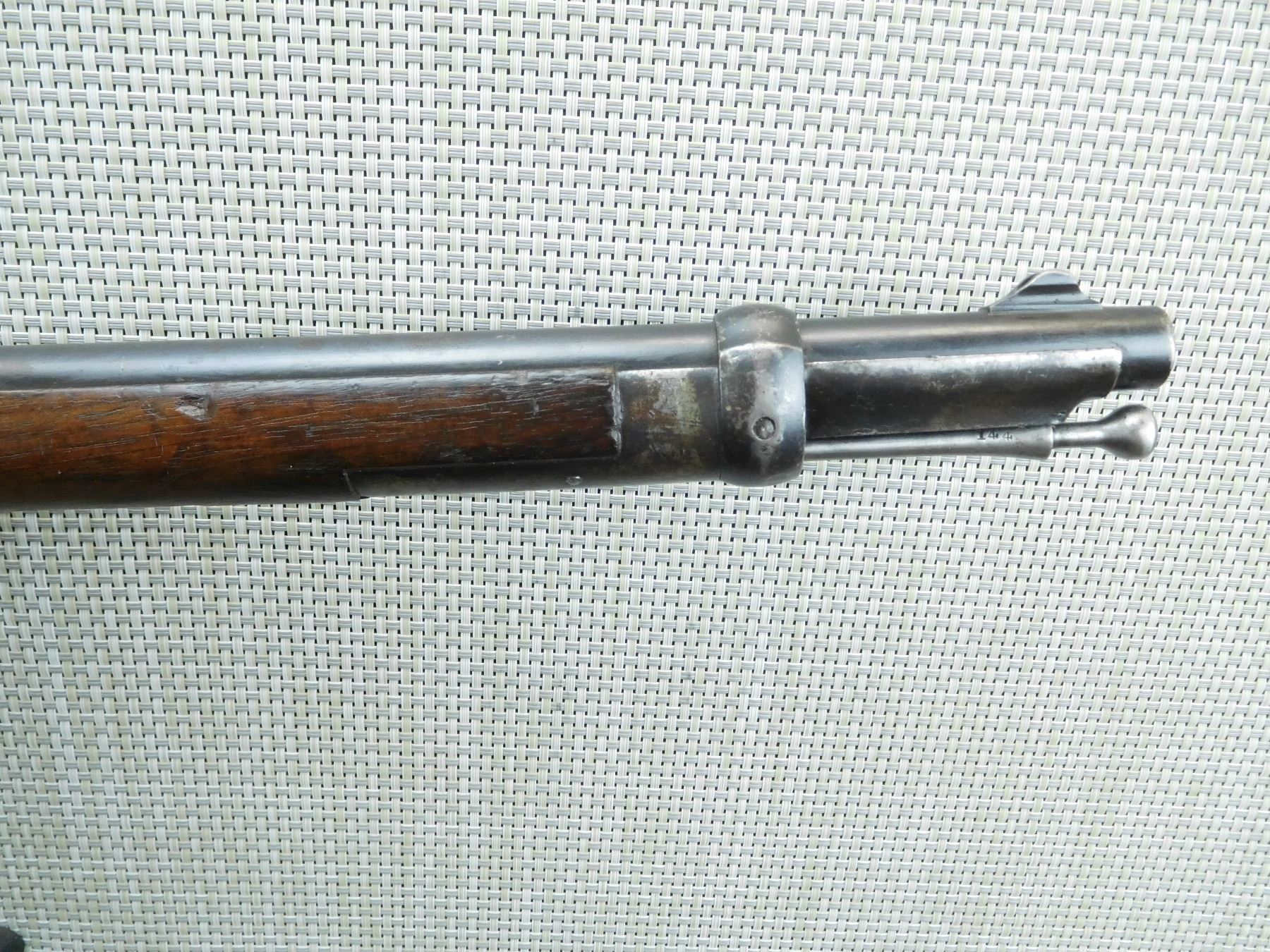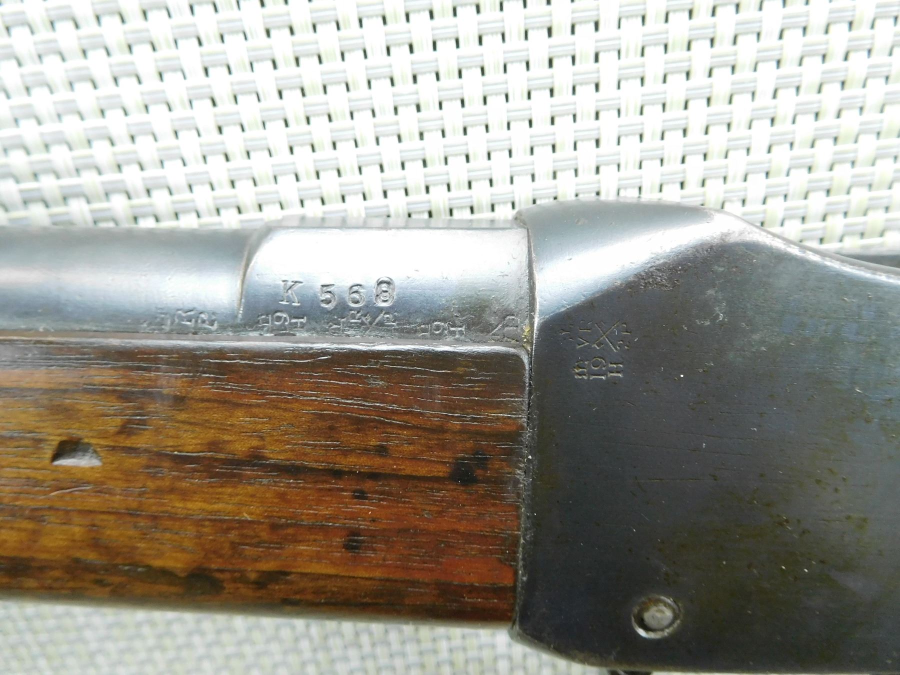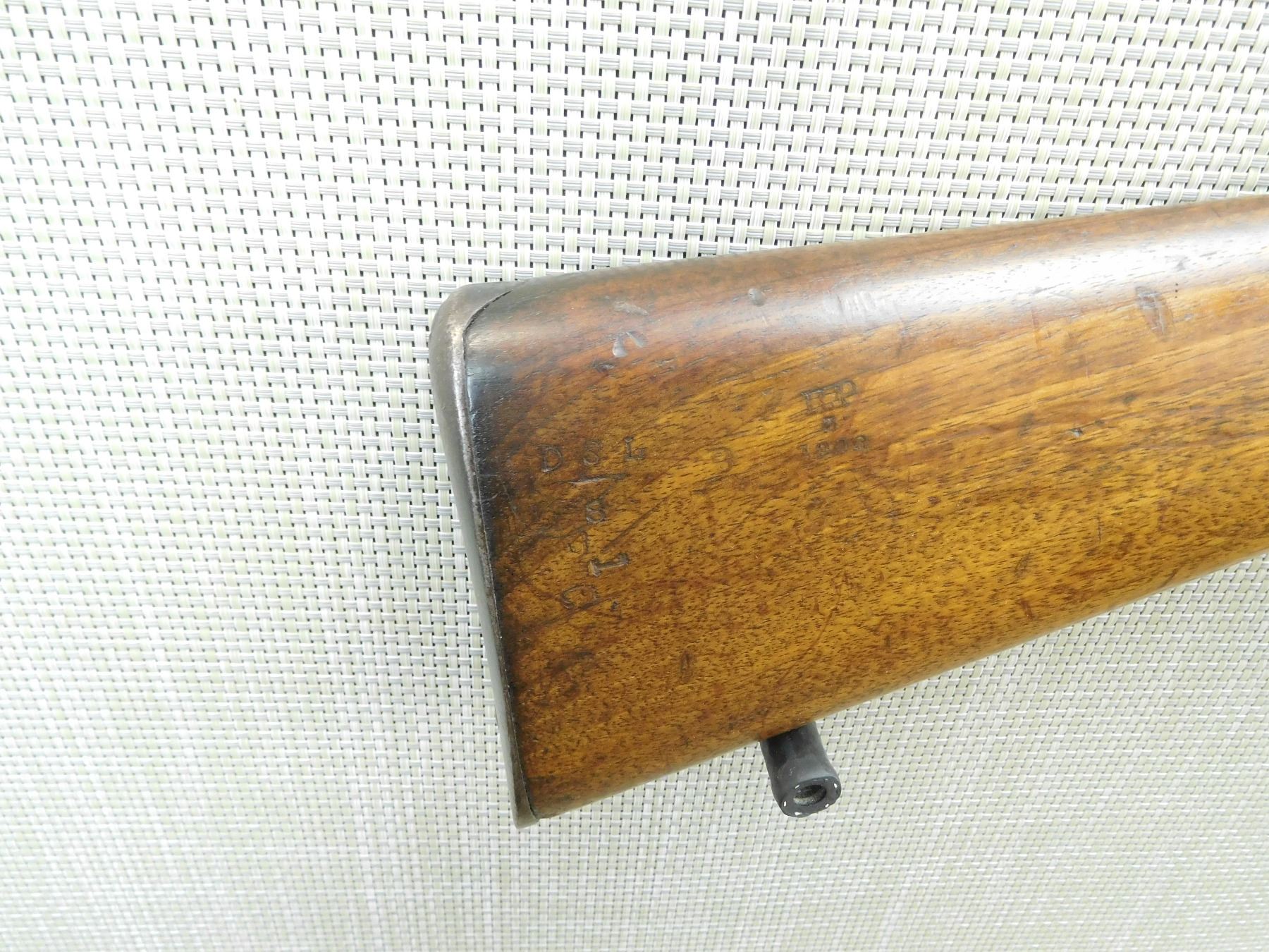 A RARE GUN, NUMEROUS REGIMENTAL MARKINGS INCLUDING DSL ON BUTT STOCK, MARKED ICI ON THE ACTION, RETAINS ORGINAL RAM ROD, BARLEY CORN FRONT AND ADJUSTABLE REAR SIGHT, KNURLED THUMB REST, SHORT LEVER, BORE IS DARK, BLADE FRONT AND FULLY ADJUSTABLE REAR SIGHT, STOCK FOREND IS CRACKED, SHOWS SOME HANDLING MARKS, HOLE IN FOREND, ANTIQUE LEATHER SCABBARD IS LOT 538 AND FITS THIS RIFLE , SERIAL # ZLC394 , ACTION: MARTINI HENRY ACTION , BARREL LENGTH: 21" , CONDITION: ANTIQUE 6/10 , STOCK # , CLASS: CANADIAN ANTIQUE CLASS