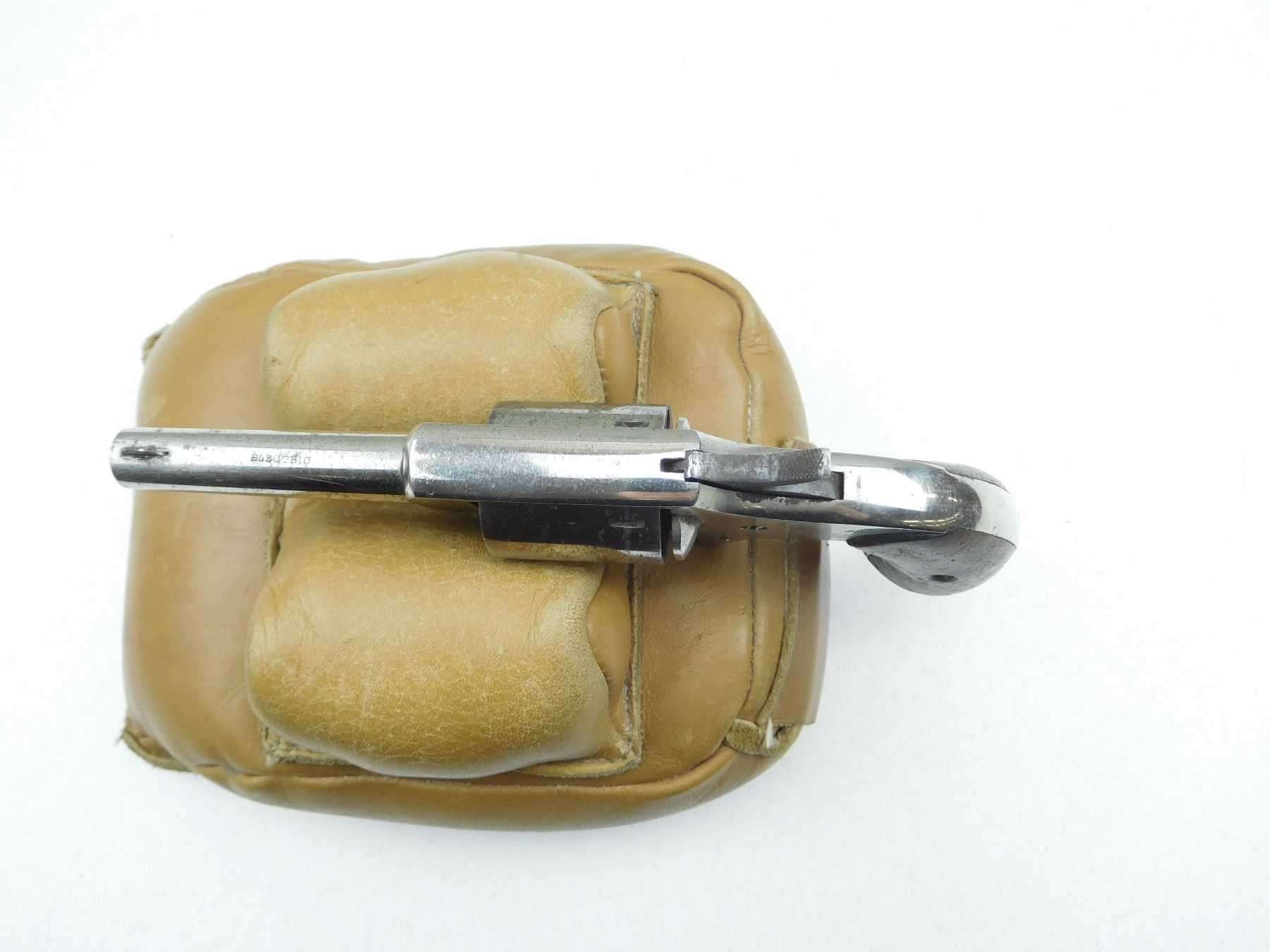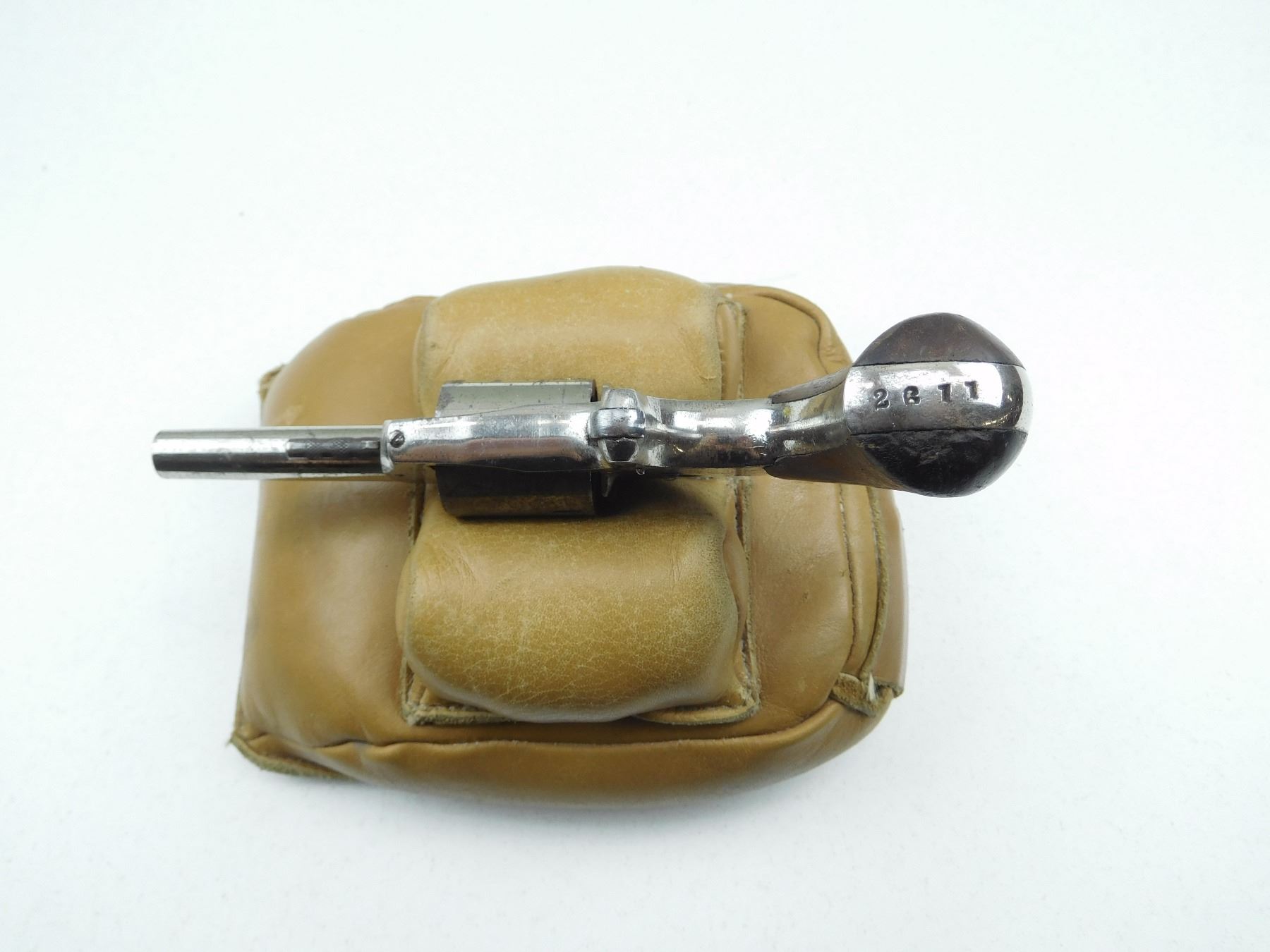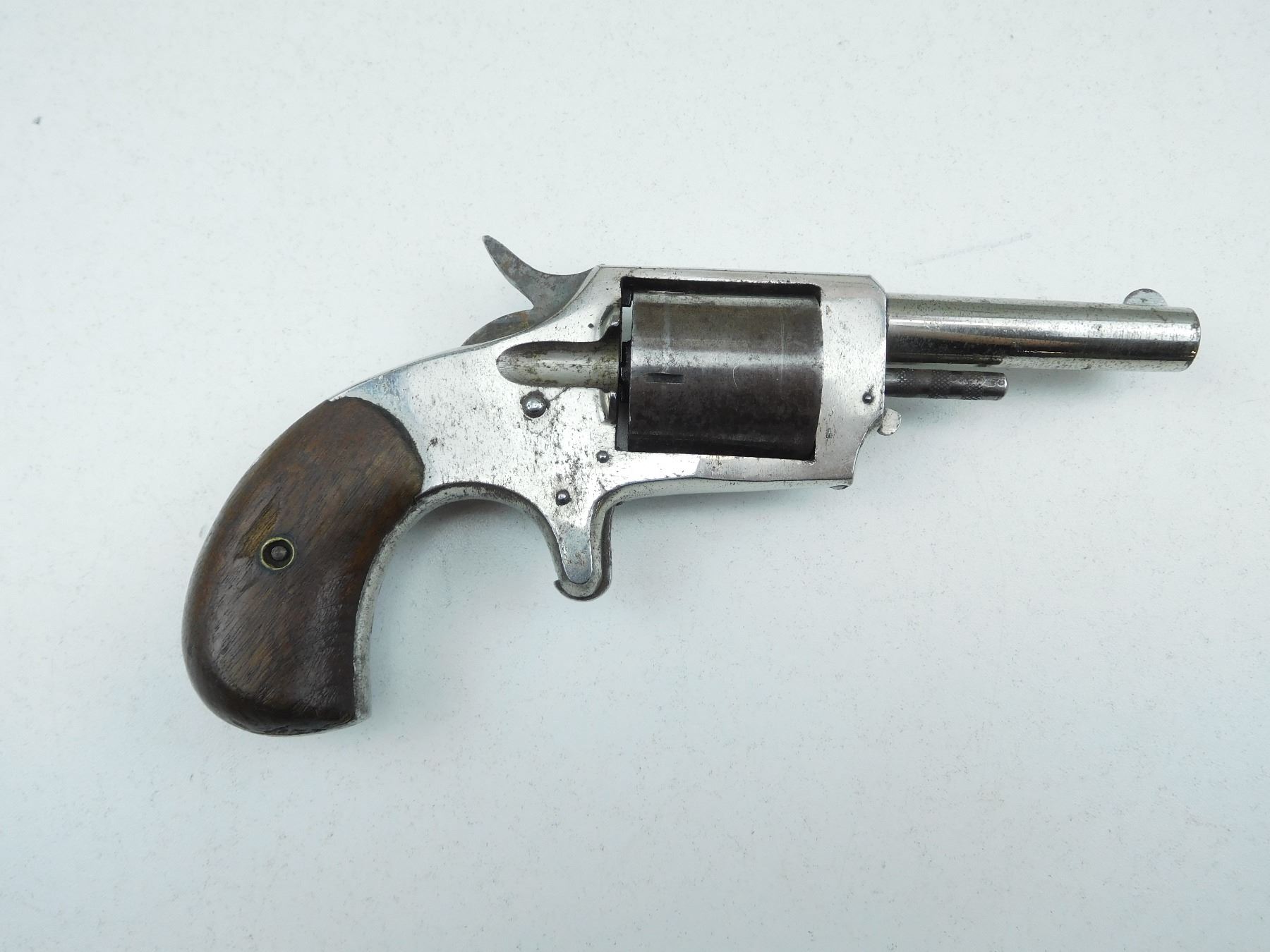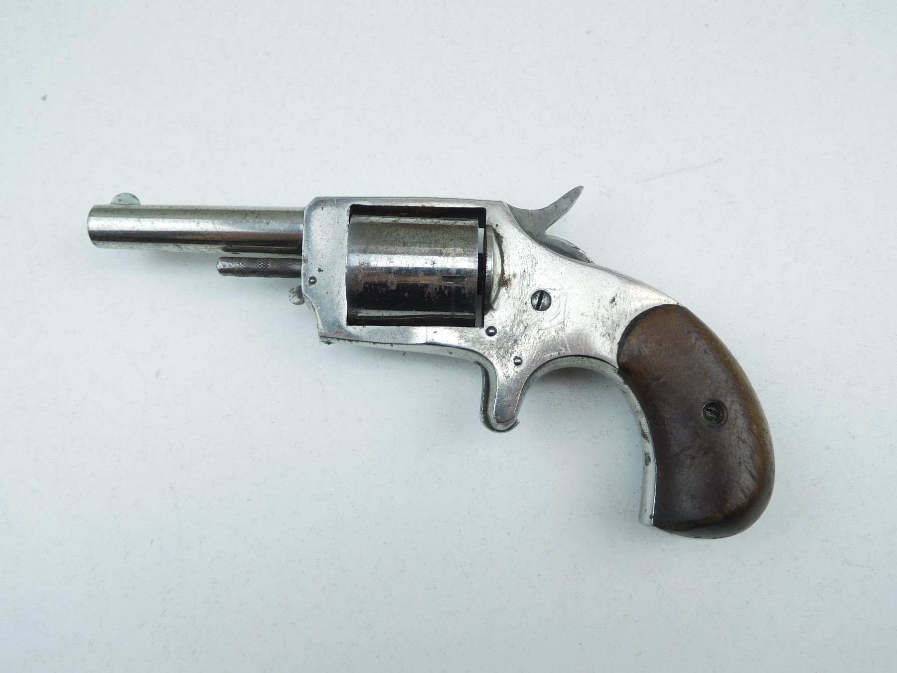 BLADE FRONT AND ABSENT REAR SIGHT, ORIGINAL WOOD GRIPS, ACTION DOES NOT INDEX, DARK BORE, 5 SHOT CAPACITY, SHOWS SOME HANDLING MARKS , SERIAL # 2611 , ACTION: REVOLVER , BARREL LENGTH: 70MM , CONDITION: ANTIQUE 5/10 , STOCK # , CLASS: CANADIAN ANTIQUE CLASS