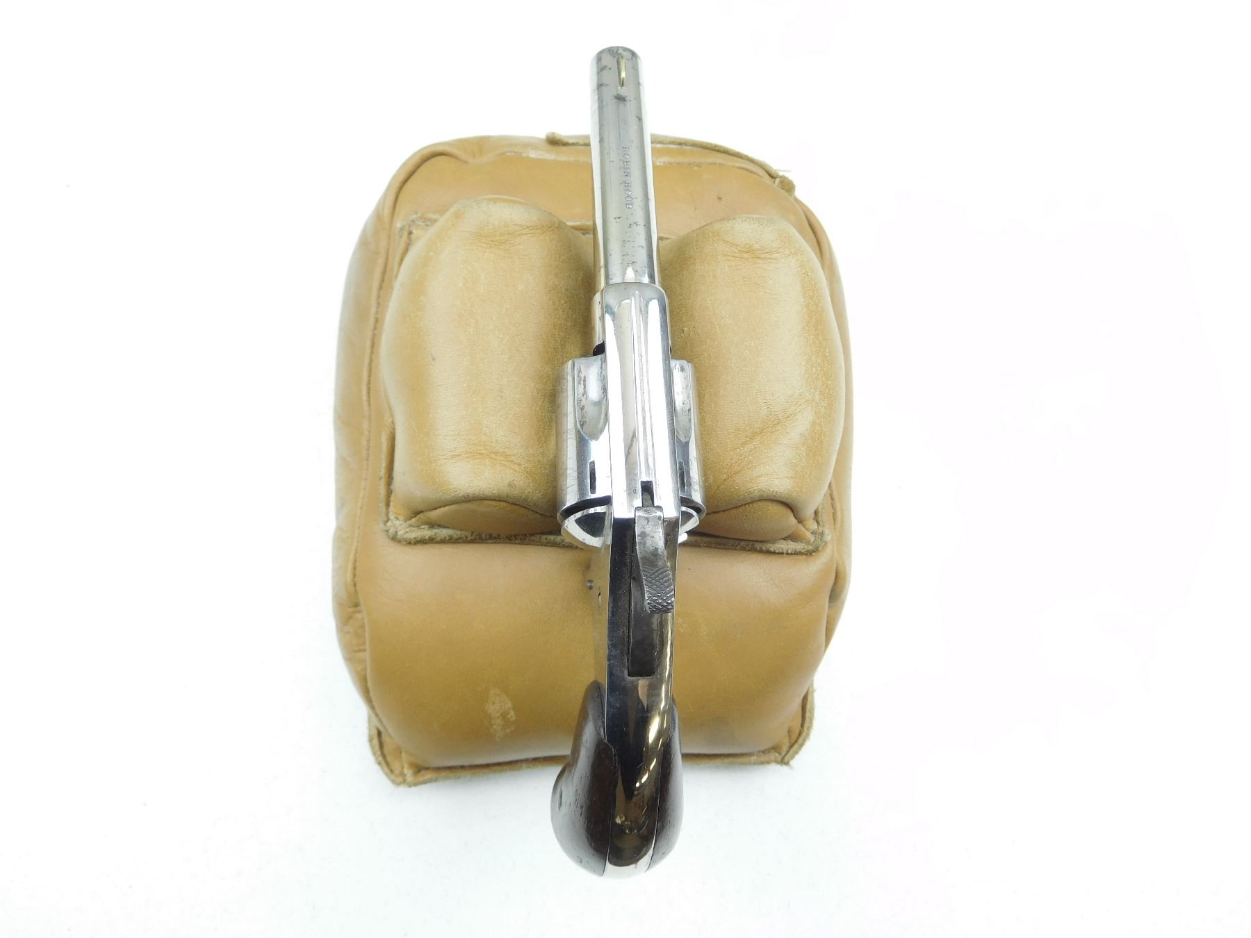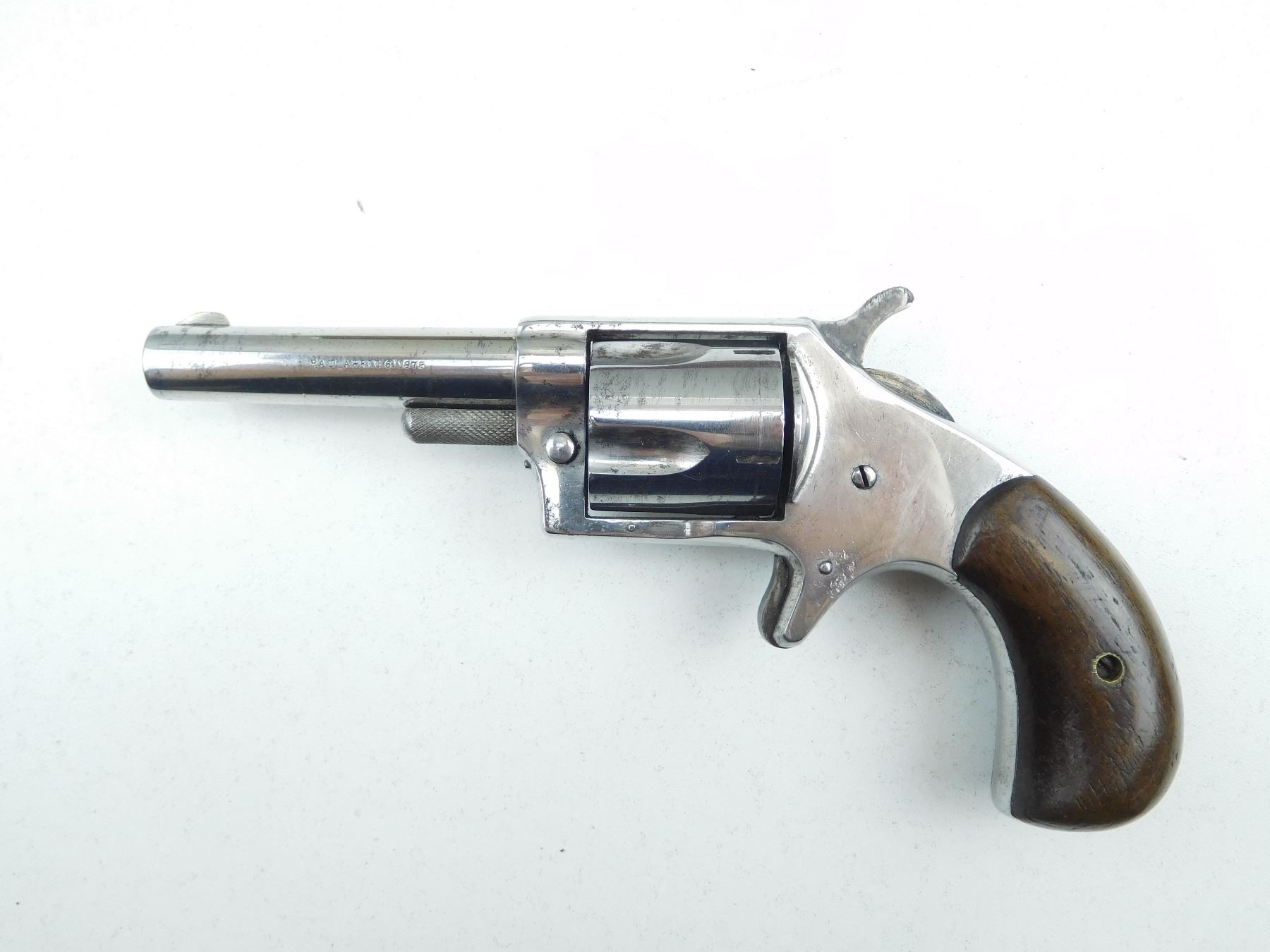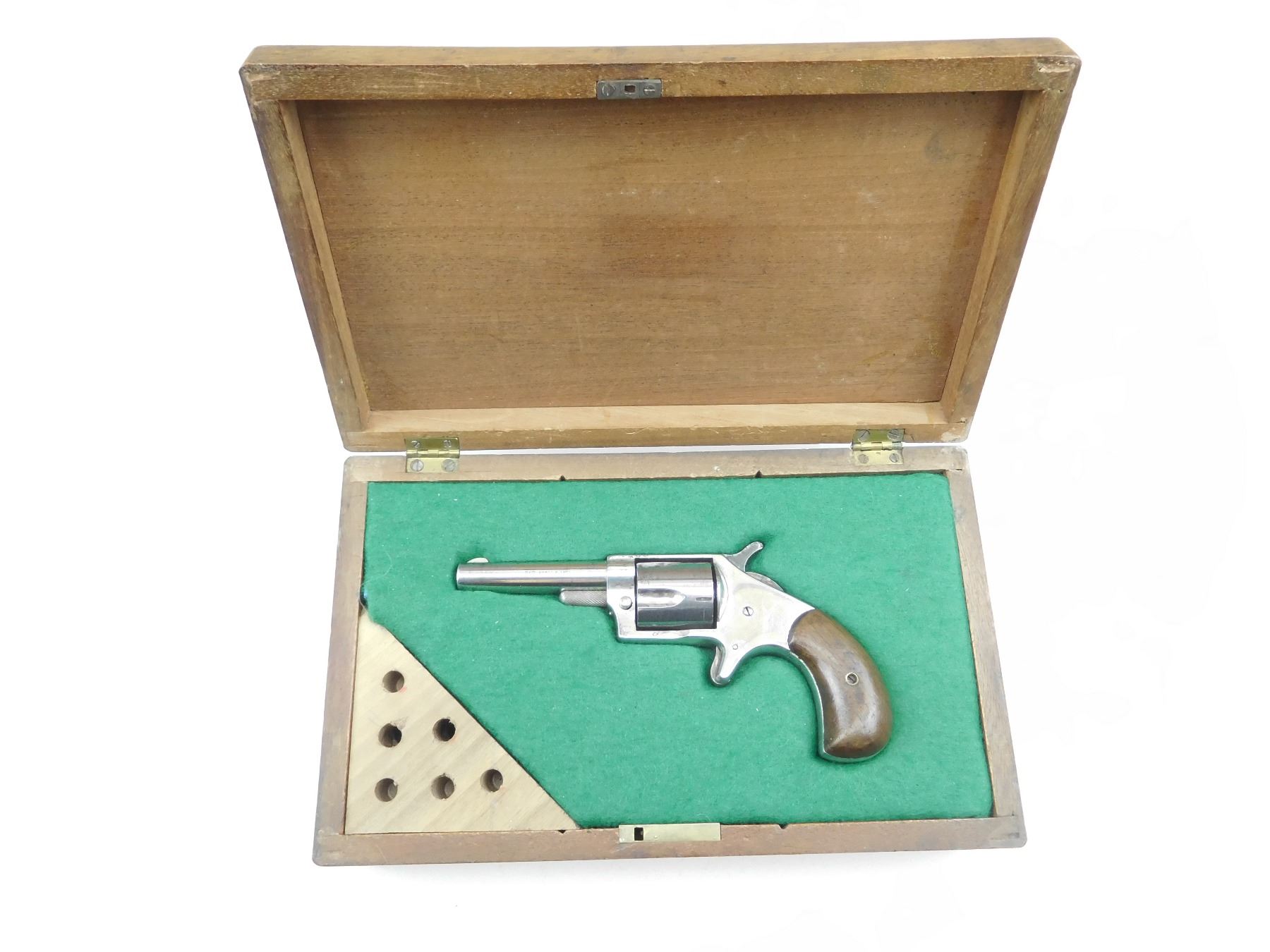 COMES IN A FITTED WOODEN CASE, BUT DOES NOT APPEAR TO BE ORIGINAL, 5 SHOT CAPACITY, BLADE FRONT AND GROOVED RECEIVER REAR SIGHT, NICKEL FINISH, WALNUT BIRDS HEAD GRIP, SPUR TRIGGER, ACTION IS TIGHT , SERIAL # 6993 , ACTION: REVOLVER , BARREL LENGTH: 73MM , CONDITION: ANTIQUE 7/10 , STOCK # , CLASS: CANADIAN ANTIQUE CLASS