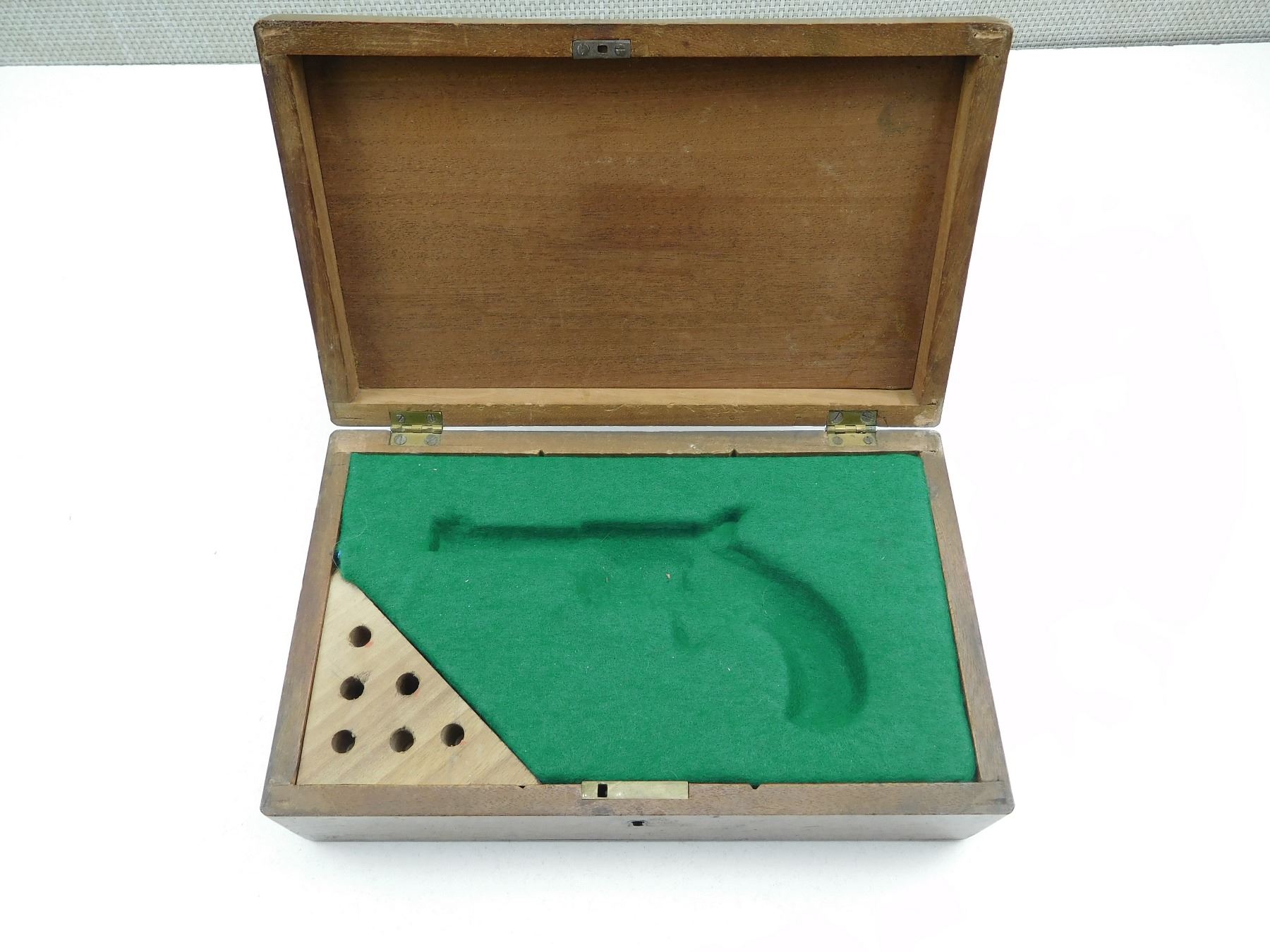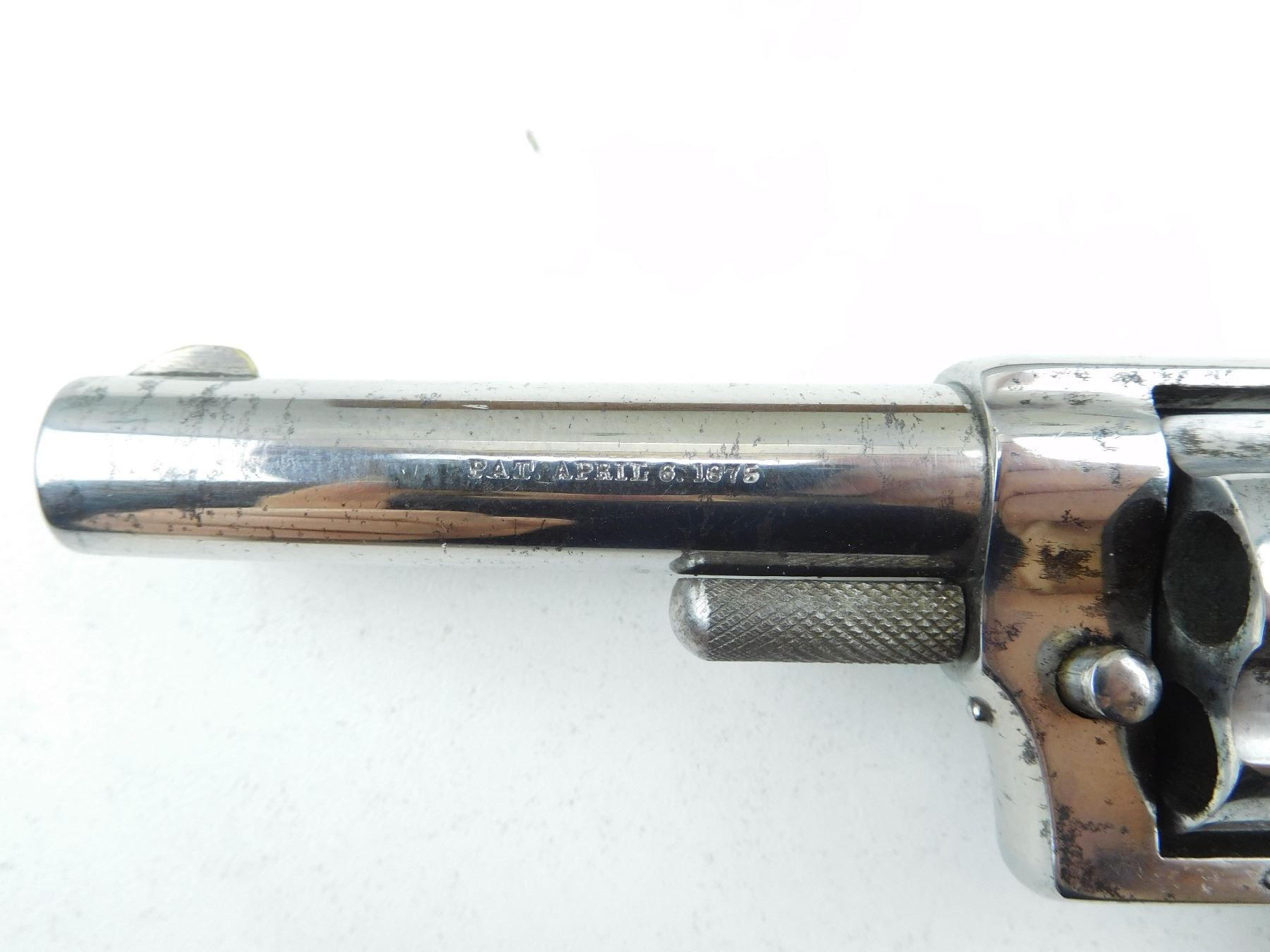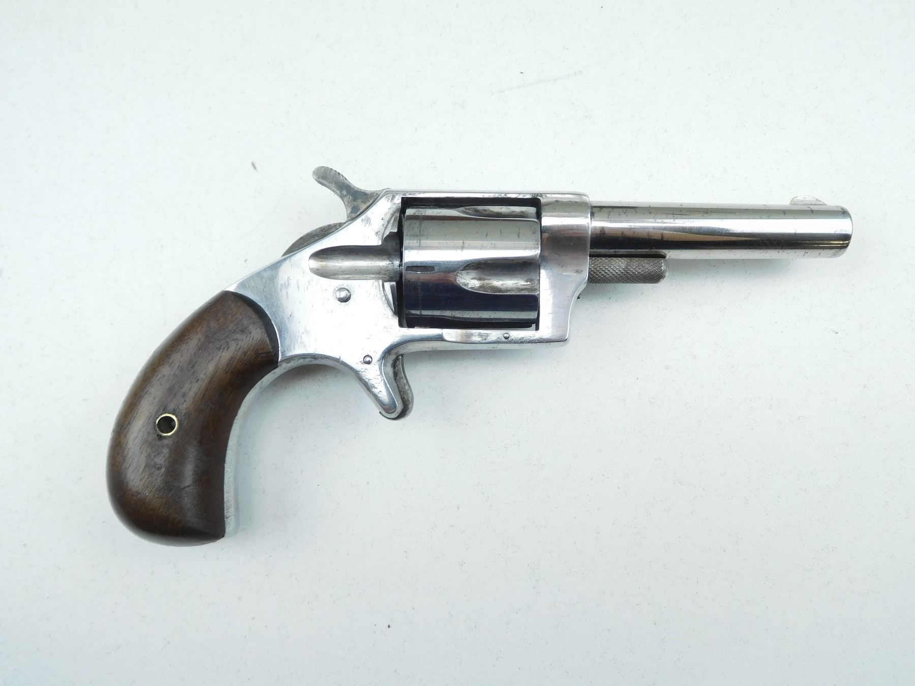 COMES IN A FITTED WOODEN CASE, BUT DOES NOT APPEAR TO BE ORIGINAL, 5 SHOT CAPACITY, BLADE FRONT AND GROOVED RECEIVER REAR SIGHT, NICKEL FINISH, WALNUT BIRDS HEAD GRIP, SPUR TRIGGER, ACTION IS TIGHT , SERIAL # 6993 , ACTION: REVOLVER , BARREL LENGTH: 73MM , CONDITION: ANTIQUE 7/10 , STOCK # , CLASS: CANADIAN ANTIQUE CLASS
