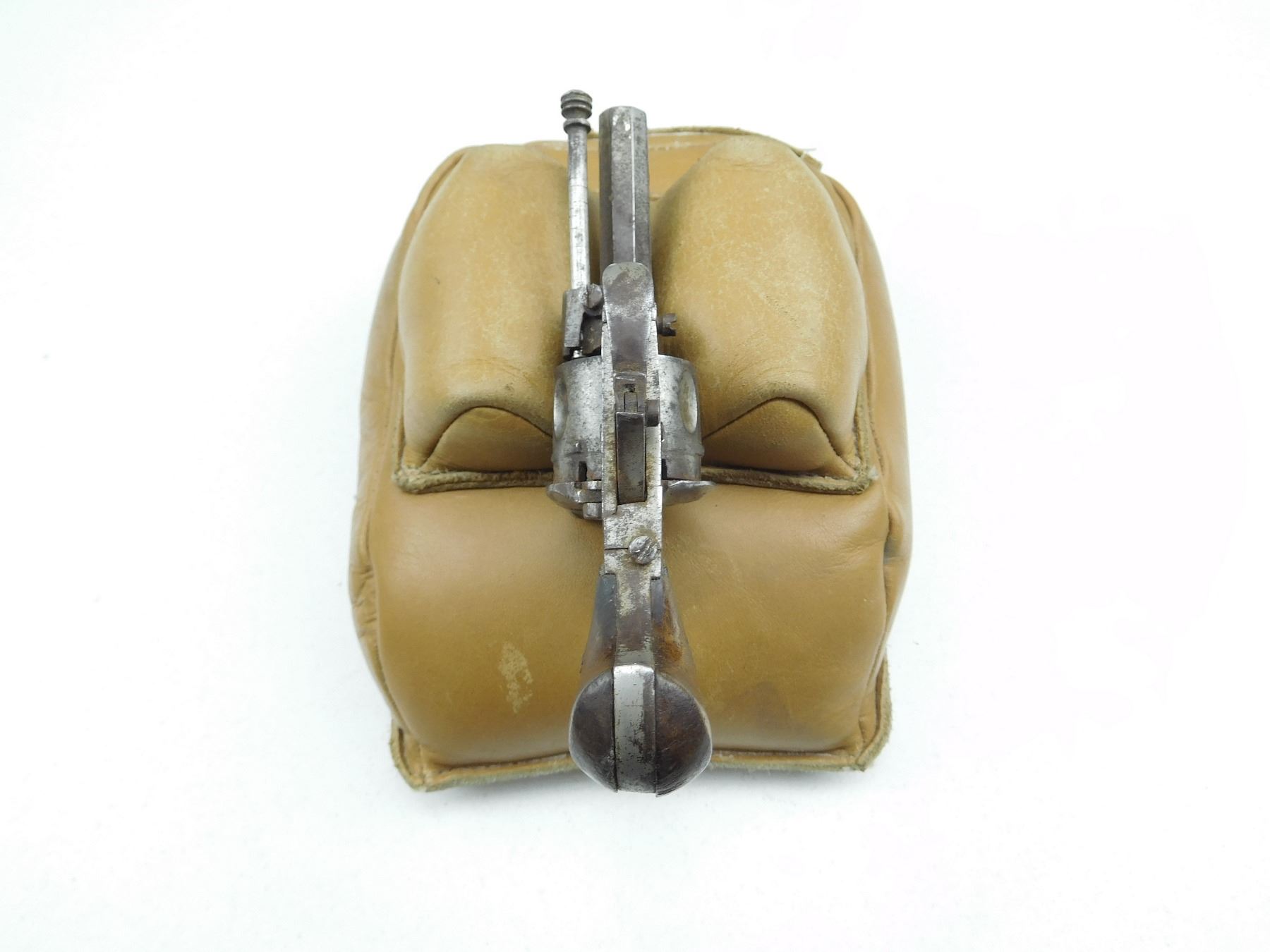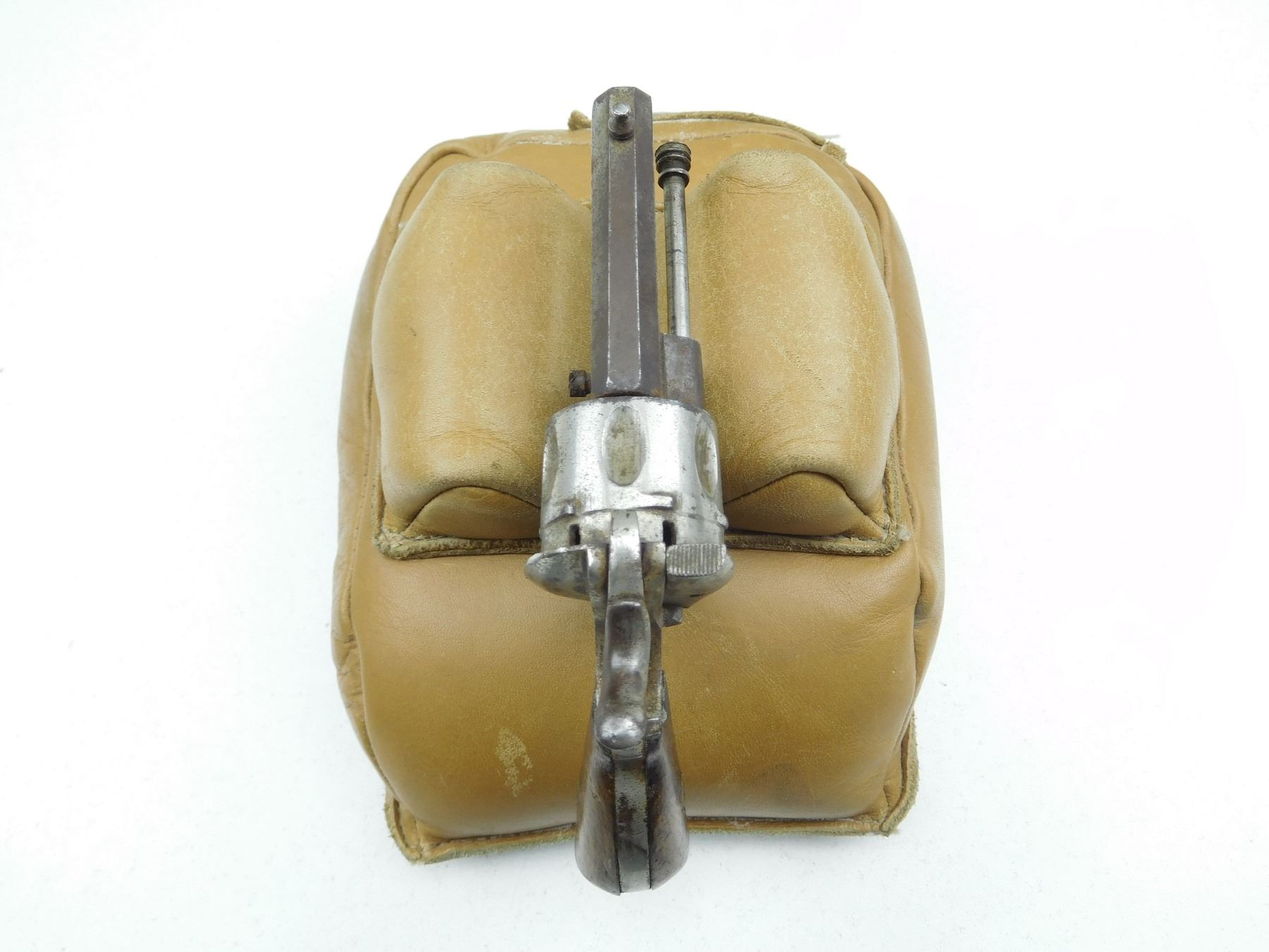 6 SHOT CAPACITY, BEAD FRONT SIGHT AND NO REAR SIGHT, FOLDING TRIGGER, OCTAGONAL BARREL, OPEN TOP RECEIVER, RETAINS SOME OF THE ORIGINAL NICKEL FINISH, DOES NOT STAY IN THE COCKED POSITION, SHOWS EXTENSIVE HANDLING MARKS , SERIAL # 8149 , ACTION: REVOLVER , BARREL LENGTH: 60MM , CONDITION: 3/10 , STOCK # , CLASS: CANADIAN ANTIQUE CLASS
