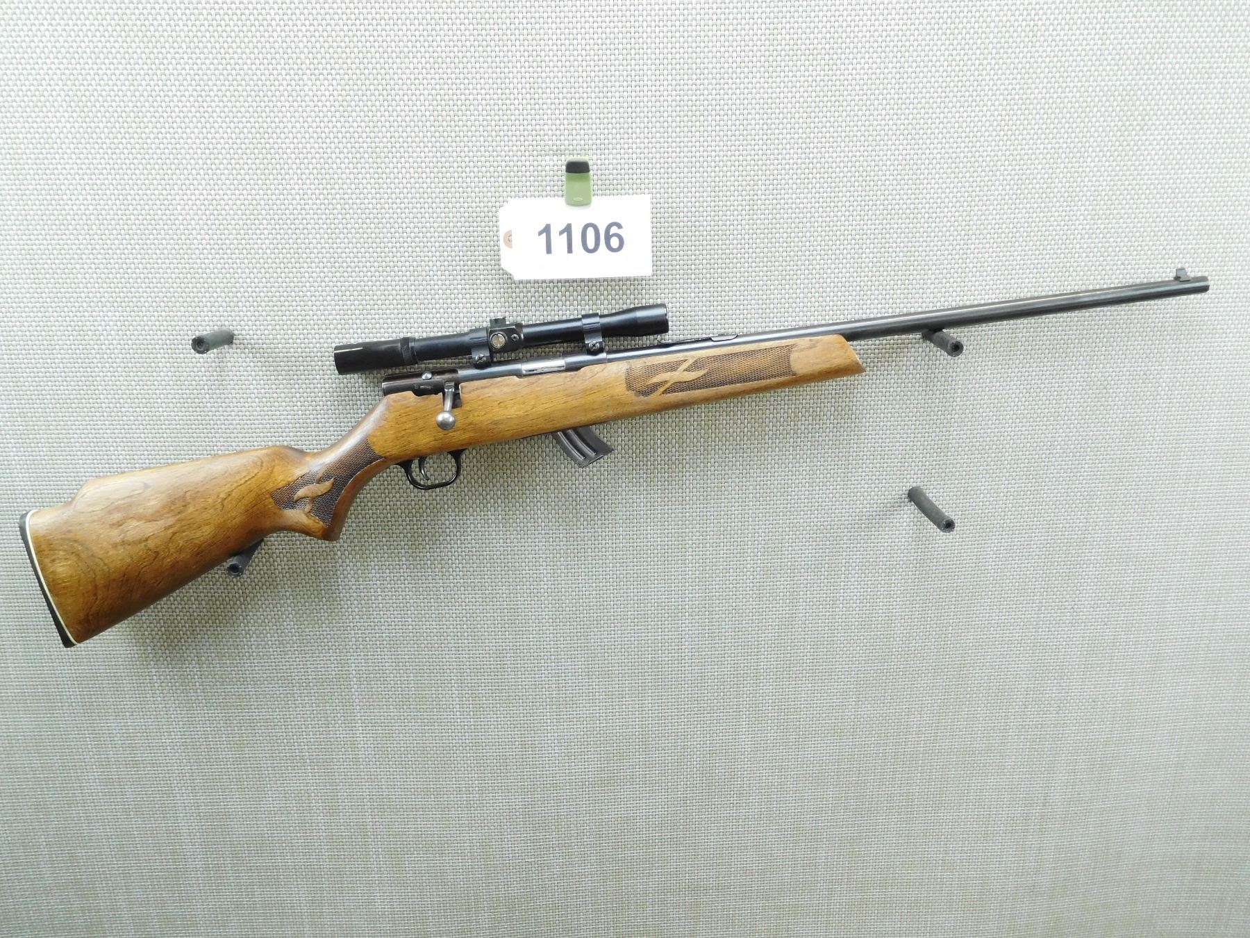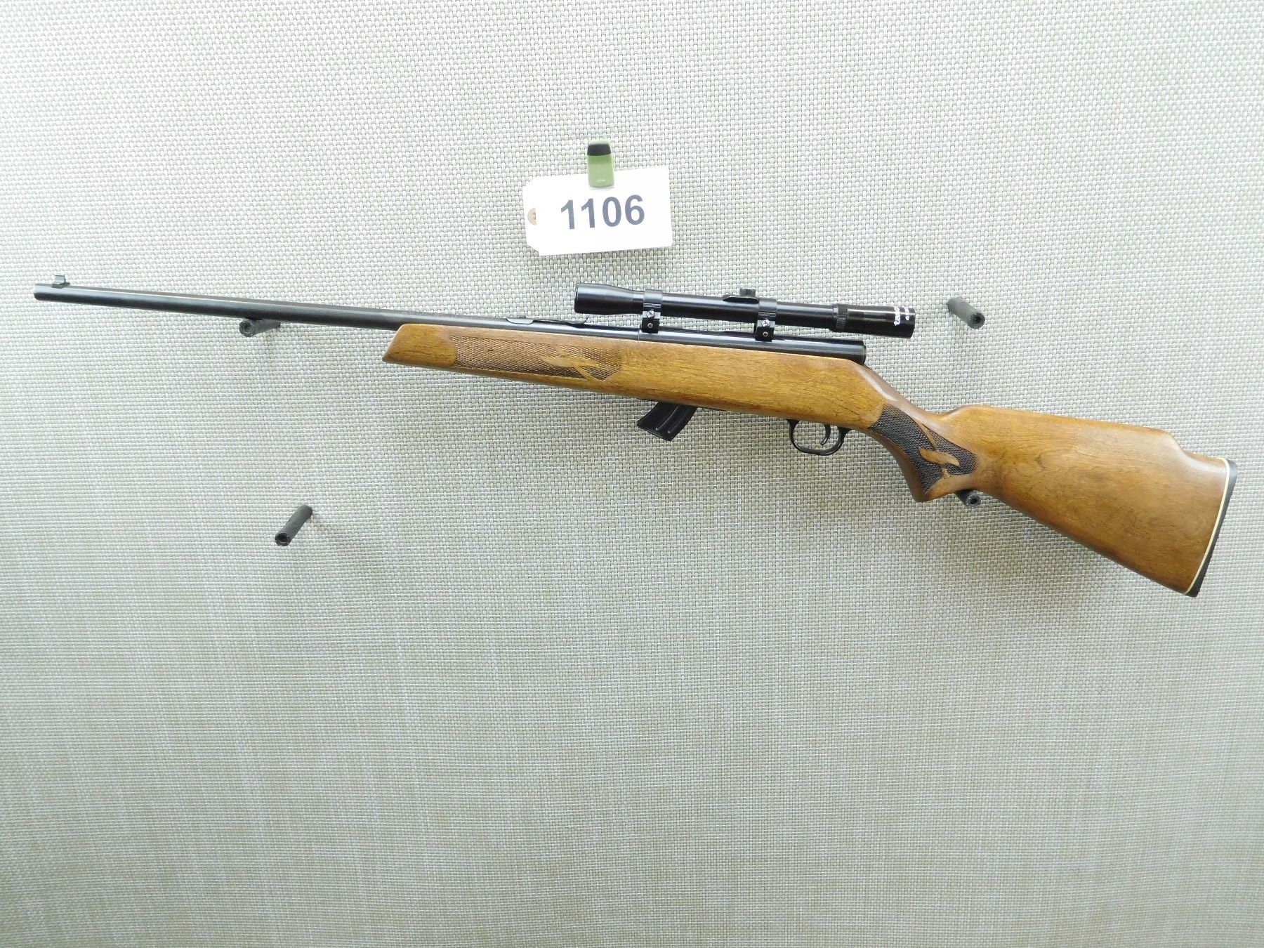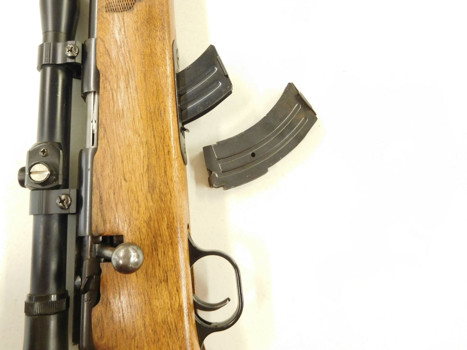COMES WITH 2 MAGAZINES, EXCELLENT BORE, PRESSED CHECKERED FOREND AND PISTOL GRIP, TASCO 4 X 20 SCOPE MOUNTED ON RECEIVER, DOVETAIL FRONT AND ADJUSTABLE REAR SIGHT WHICH IS MISSING THE ELEVATOR , SERIAL # 47804 , ACTION: BOLT ACTION RIFLE , BARREL LENGTH: 21" , CONDITION: 8/10 , STOCK # 7462 , CLASS: CANADIAN NON RESTRICTED CLASS