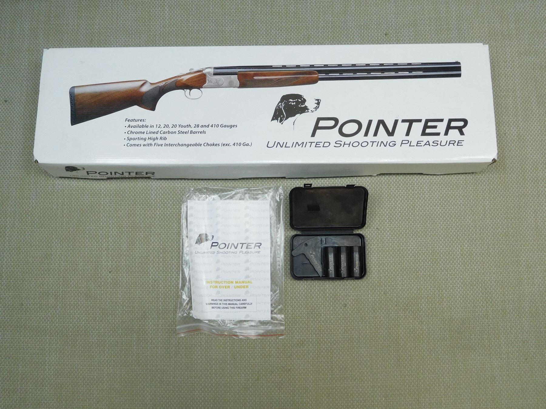 COMES WITH BOX AND , 5 REMOVABLE CHOKES, 2 IN FIREARM, 3 IN CASE IN BOX, EXTRACTOR, TANG SAFETY, FIBEROPTIC FRON ON RAISED VENTED RIB, FULL PISTOL GRIP, SINGLE TRIGGER, RUBBER BUTT PAD, MANUFACTURED BY KHAN, CAMO STOCK, BORE IS AS NEW , SERIAL # LG12005960 , ACTION: MULTI BARREL OVER UNDER SHOTGUN , BARREL LENGTH: 28" , CONDITION: AS NEW IN BOX , STOCK # 7468 , CLASS: CANADIAN NON RESTRICTED CLASS