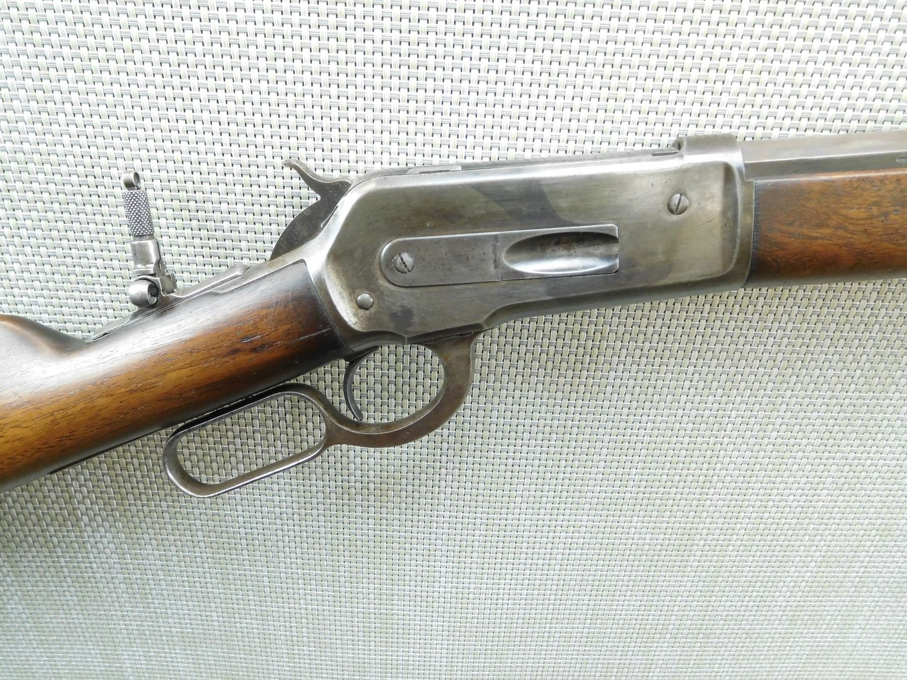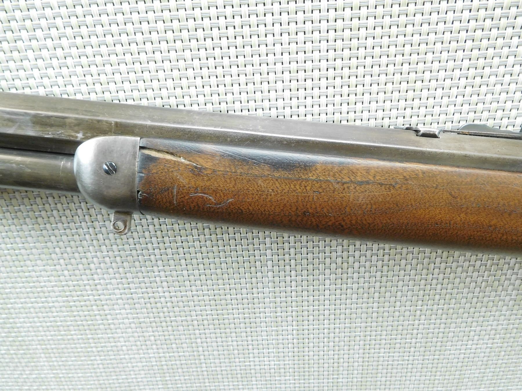 MANUFACTURED IN 1889 (USA ANTIQUE) OCTAGONAL BARREL, BORE IS VERY GOOD, TANG SIGHT, REPLACED BACK SIGHT, DOVETAIL FRONT SIGHT, LONG CRACK AND A CHIP IN FOREND, SLING SWIVEL LOOP HAS BEEN ADDED TO FOREND, THE STOCK HAS HAD HOLES FILLED IN THE BUTT STOCK, GREY FINISH, SCRATCHES ON THE BARREL NEAR THE FOREND, ACTION IS TIGHT , SERIAL # 43664 , ACTION: LEVER ACTION RIFLE , BARREL LENGTH: 26" , CONDITION: 6/10 , STOCK # 7472 , CLASS: CANADIAN NON RESTRICTED CLASS