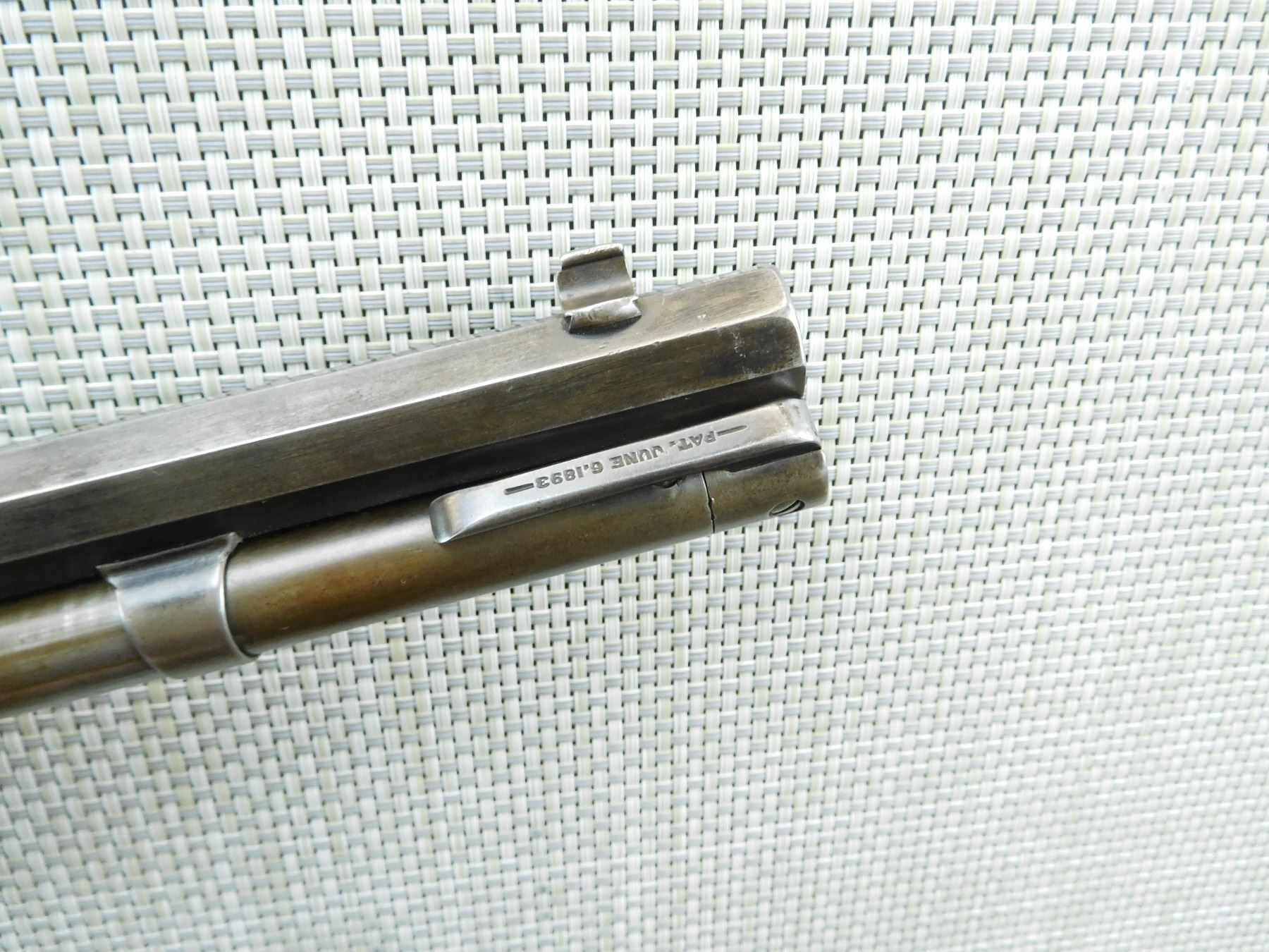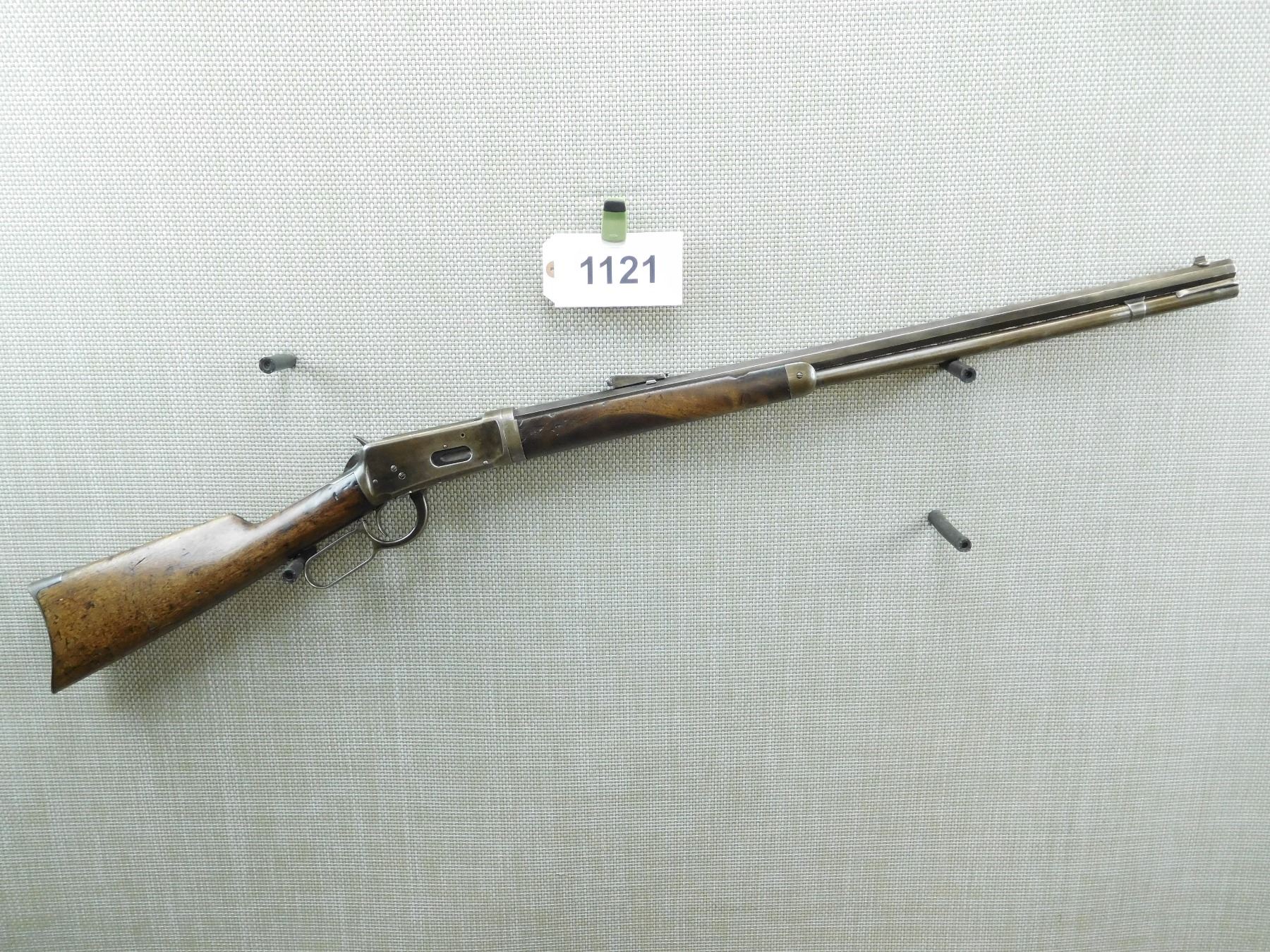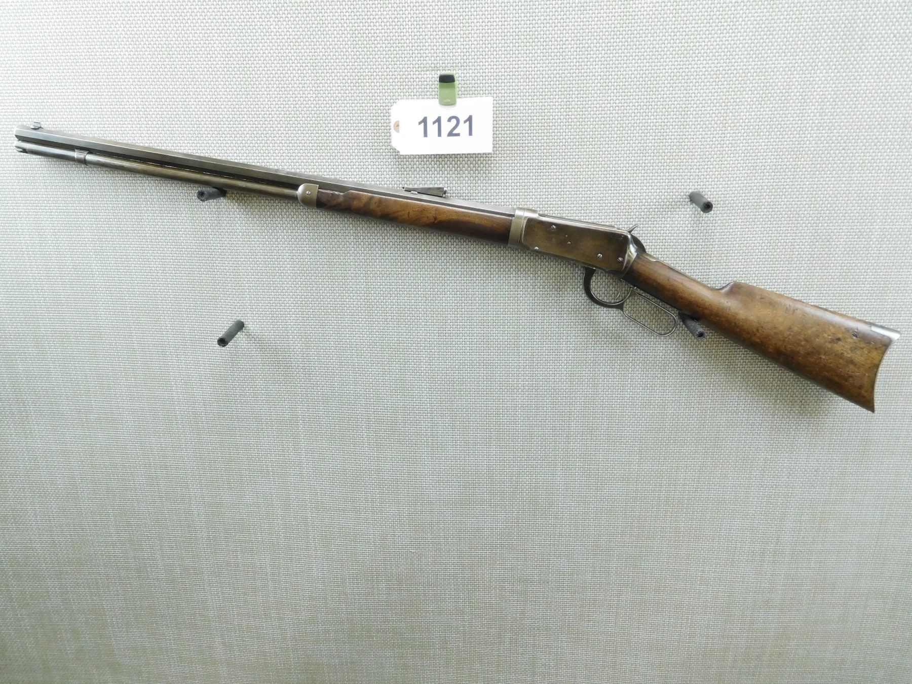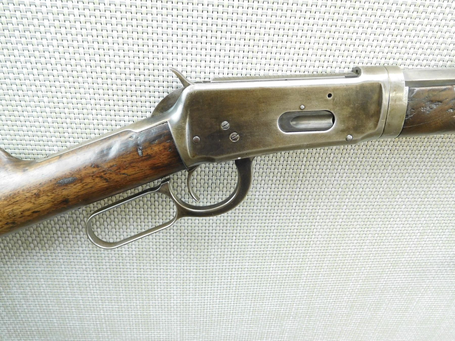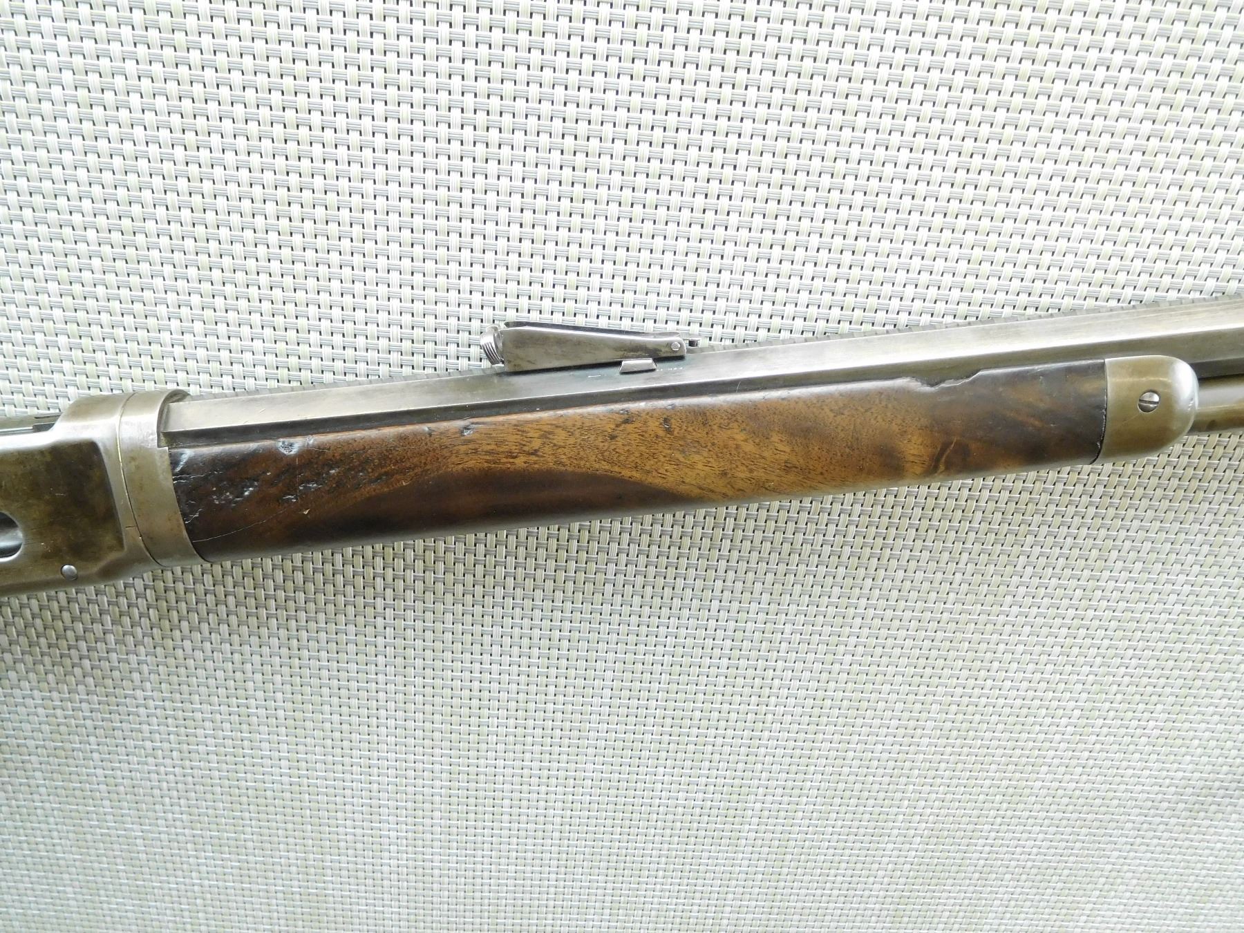 MANUFACTURED IN 1895 (USA ANTIQUE) TAKEDOWN MODEL, OCTAGONAL BARRREL, DARK BORE , ORIGINAL WOOD SHOWS EXTENSIVE HANDLING MARKS WITH MULTIPLE CHIPS IN THE FOREND, EARLY RAMP ADJUSTABLE REAR SIGHT, DOVETAIL FRONT, CRESCENT BUTT PLATE, VERY LITTLE FINISH REMAINS, RECEIVER IS LIGHTLY PITTED NEAR THE HAMMER , SERIAL # 50192 , ACTION: LEVER ACTION RIFLE , BARREL LENGTH: 26" , CONDITION: 5/10 , STOCK # 7477 , CLASS: CANADIAN NON RESTRICTED CLASS