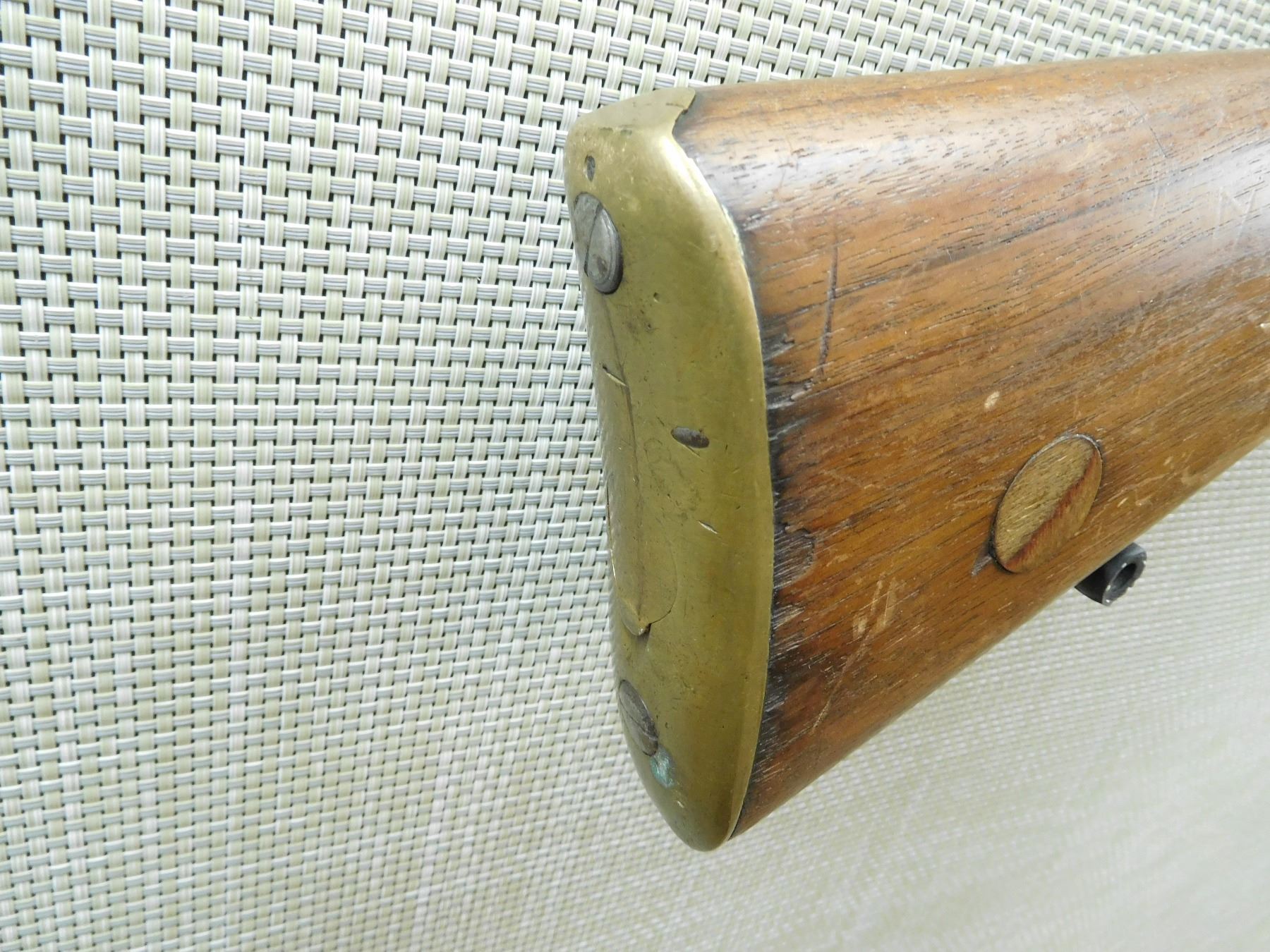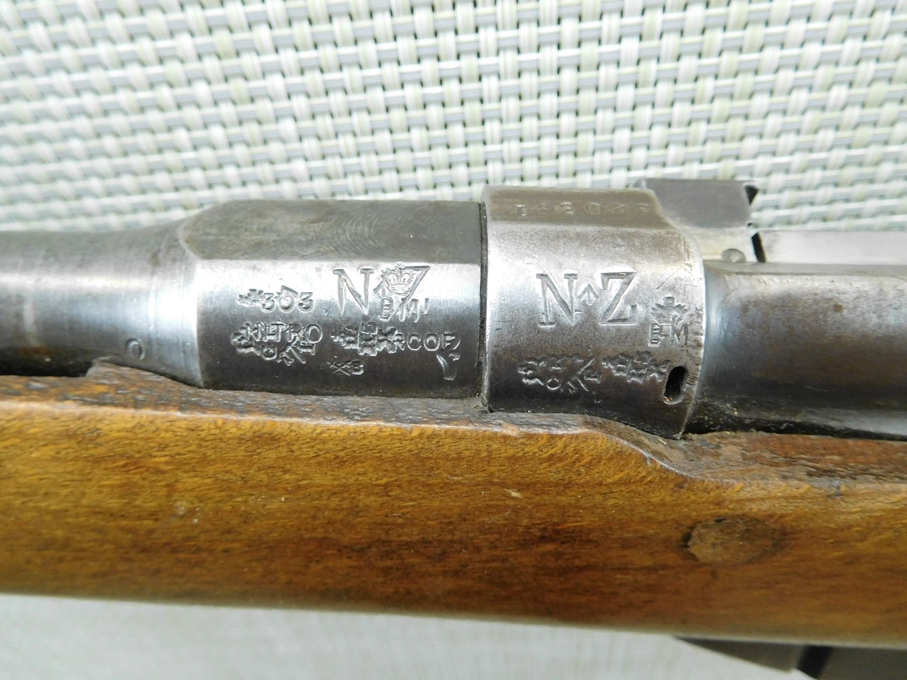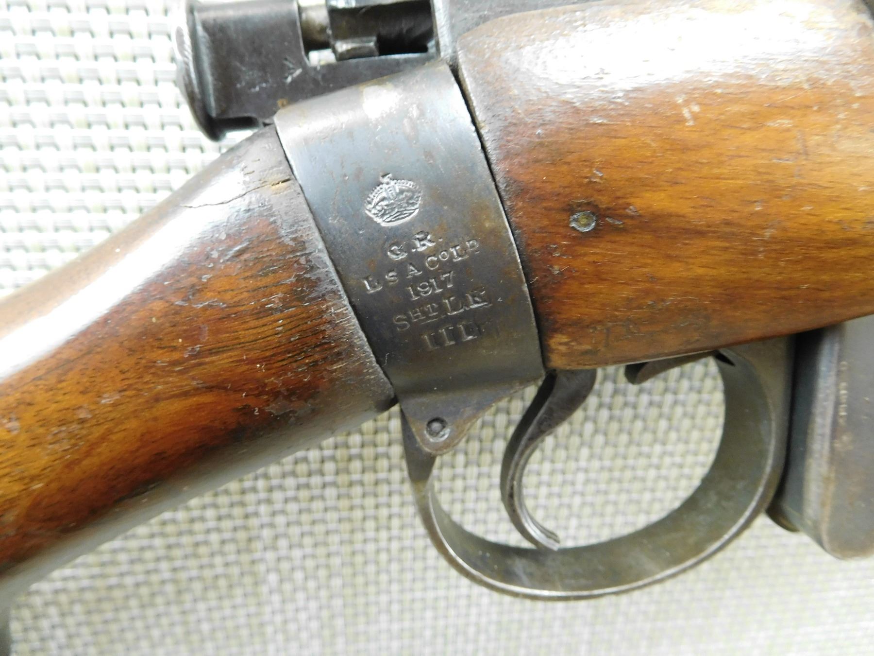 COMES WITH A MAGAZINE, MADE BY LSA COMPANY IN 1917, NEW ZEALAND MARKINGS ON THE RECEIVER, MISMATCHED BOLT TO RECEIVER, REPLACED FRONT SIGHT AND ORIGINAL MILITARY REAR SIGHT, MISSING THE SLING SWIVELS, BRASS DISC HAS BEEN REPLACED WITH WOOD INSERT ON BUTT STOCK, BORE IS GOOD , SERIAL # 057488 , ACTION: BOLT ACTION RIFLE , BARREL LENGTH: 25" , CONDITION: 5/10 , STOCK # 7485 , CLASS: CANADIAN NON RESTRICTED CLASS