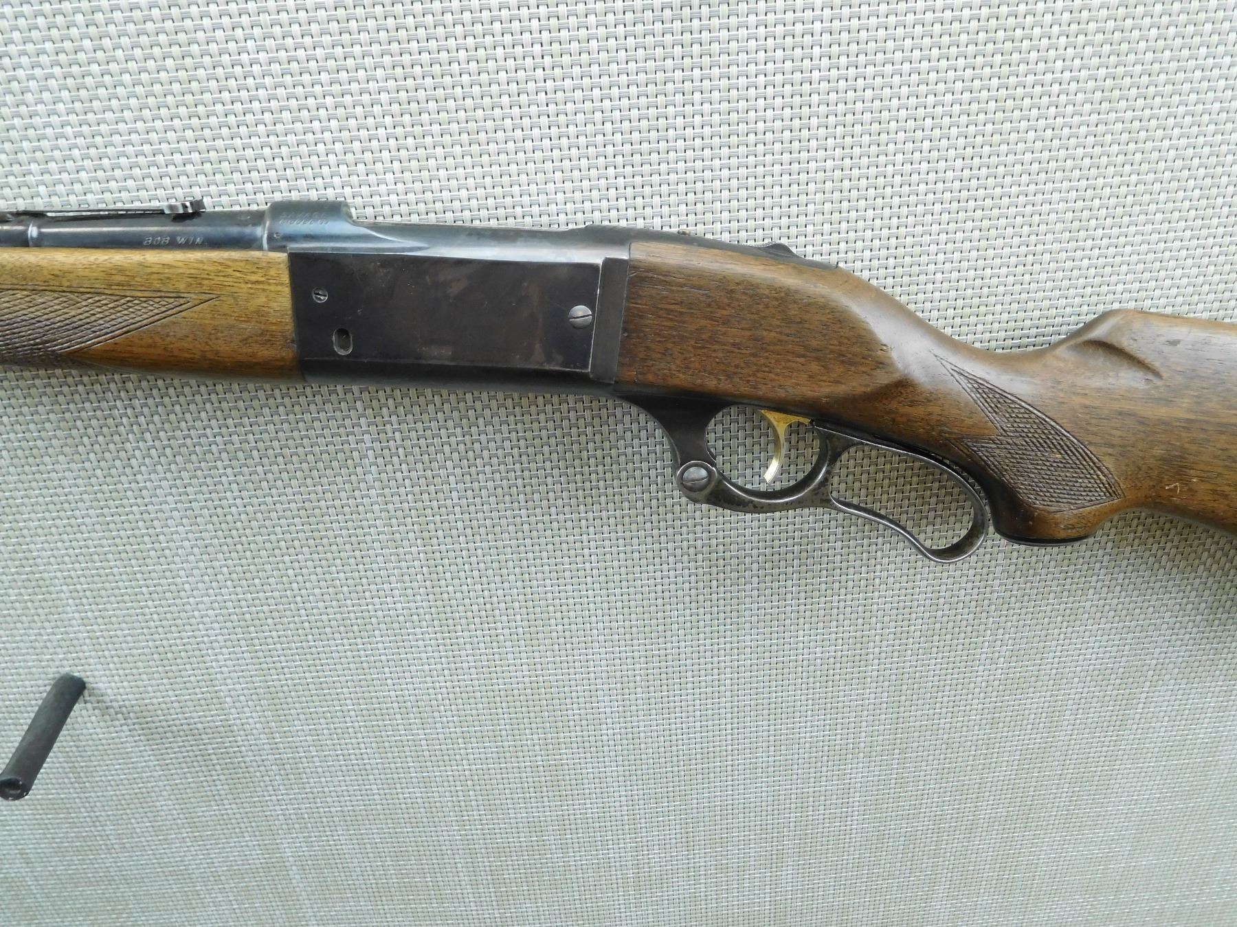 RAMP FRONT AND FLIP ADJUSTABLE REAR SIGHT, BORE IS GOOD, CHECKERED FOREND AND CAPPED PISTOL GRIP BUTT STOCK, MISSING THE SLING SWIVELS , STEEL BUTT PLATE, SHOWS SOME HANDLING MARKS TO FINISH , SERIAL # 1007355 , ACTION: LEVER ACTION RIFLE , BARREL LENGTH: 21" , CONDITION: 6/10 , STOCK # 7487 , CLASS: CANADIAN NON RESTRICTED CLASS