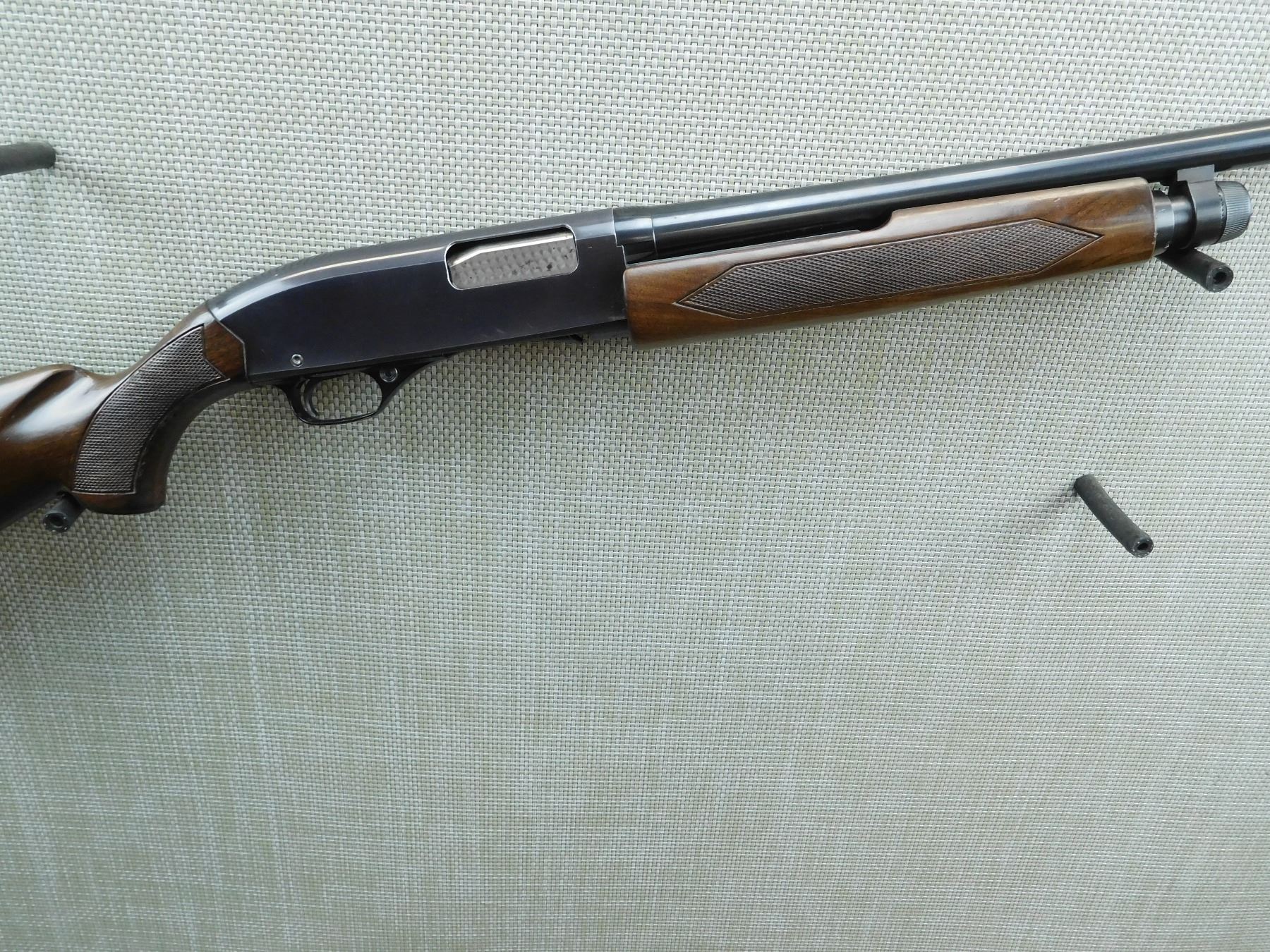 FIXED FULL CHOKE, BORE IS GOOD, CHECKERED FOREND AND CAPPED PISTOL GRIP FRONT STOCK, VENTED RUBBER RECOIL PAD, SHOWS SOME HANDLING MARKS , SERIAL # L732010 , ACTION: PUMP ACTION SHOTGUN , BARREL LENGTH: 28" , CONDITION: 7/10 , STOCK # 7488 , CLASS: CANADIAN NON RESTRICTED CLASS