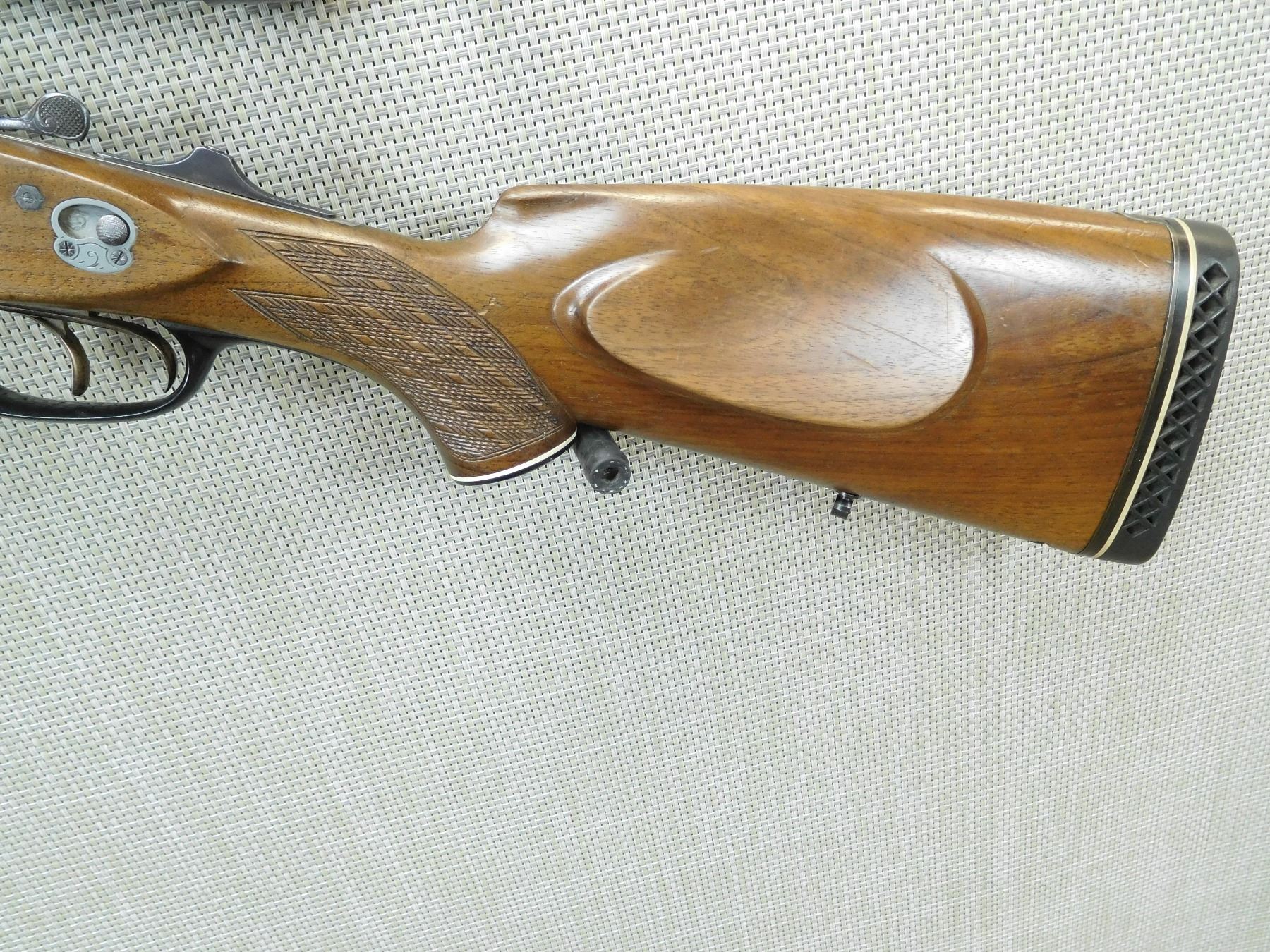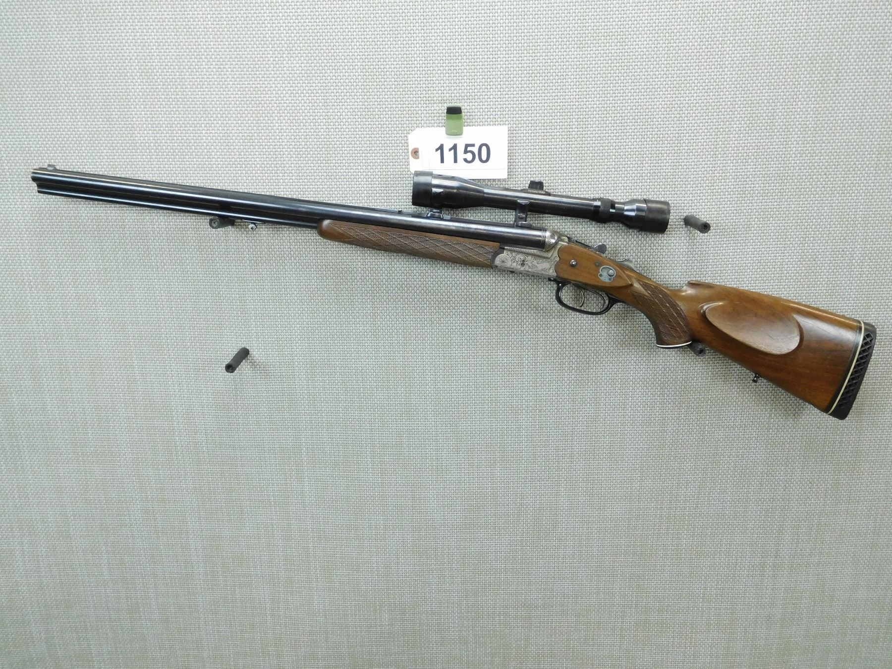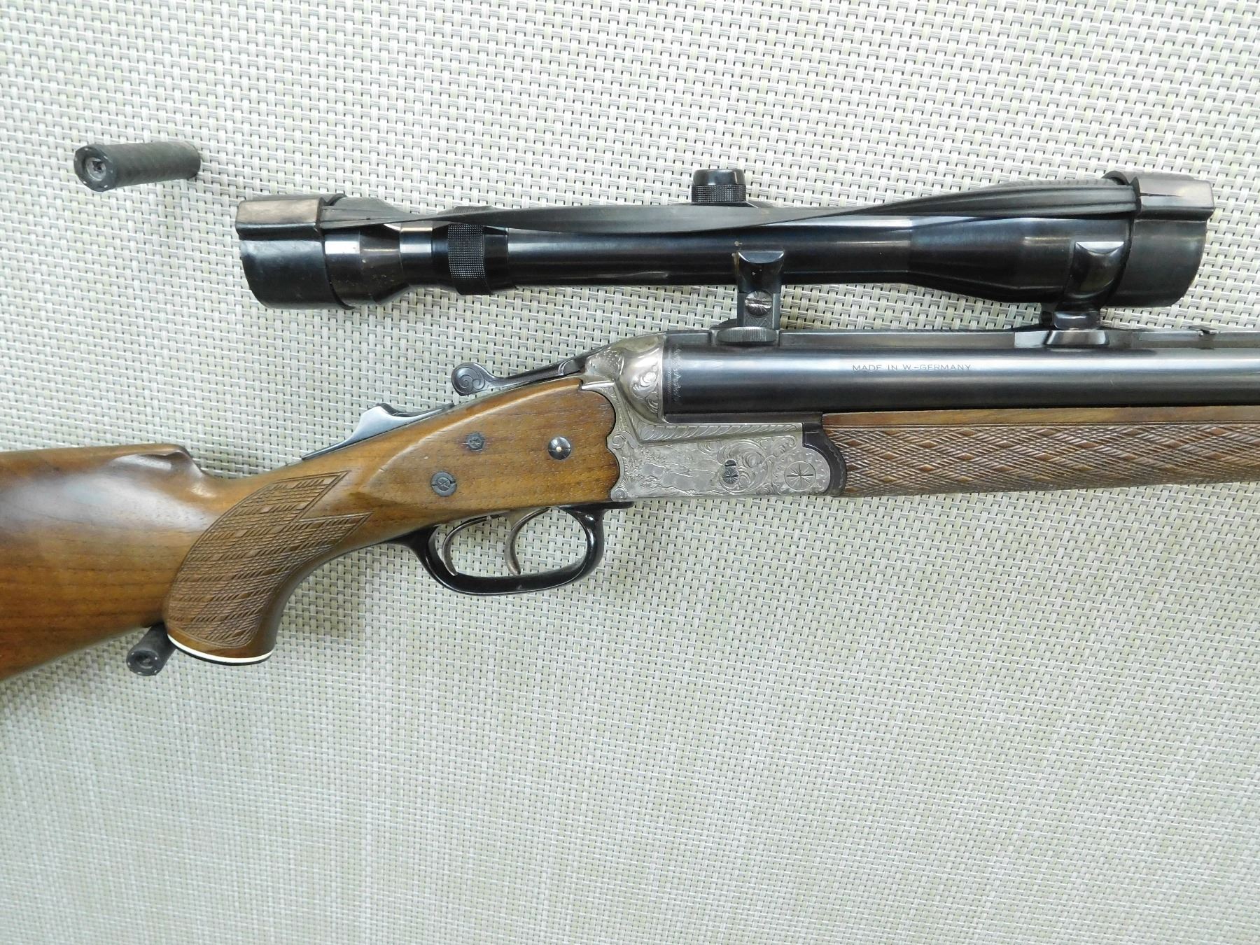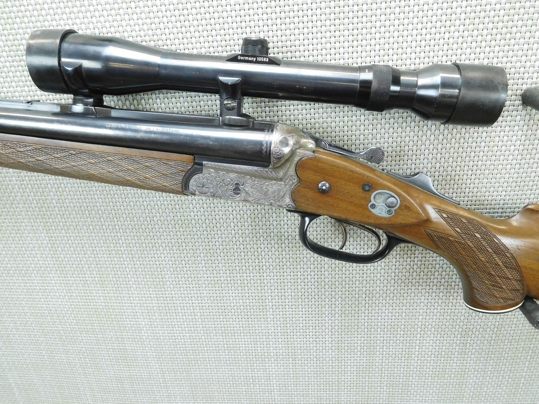 COMES WITH LEATHER LEG OF MUTTON CASE LEATHER SLING AND SCOPE CASE, THERE IS A CRACK IN STOCK, SLING SWIVEL LOOPS, CLAW MOUNT HEYM SCOPE WITH BIKINI LENS COVERS, CLAW MOUNT SCREW IS MARRED, RETAINS ORIGINAL SIGHTS, RICHLY ENGRAVED GAME SCENE RECEIVER, COCKING INDICATORS, CARTRIDGE STORAGE IN BUTT STOCK, CHECKERED FOREND AND CAPPED PISTOL GRIP BUTT STOCK WITH VENTED RUBBER RECOIL PAD, ACTION IS TIGHT, GREENER TYPE SAFETY, BORES ARE EXCELLENT , SERIAL # 976 , ACTION: DRILLING HINGED BARREL , BARREL LENGTH: 25" , CONDITION: 6/10 , STOCK # 7506 , CLASS: CANADIAN NON RESTRICTED CLASS