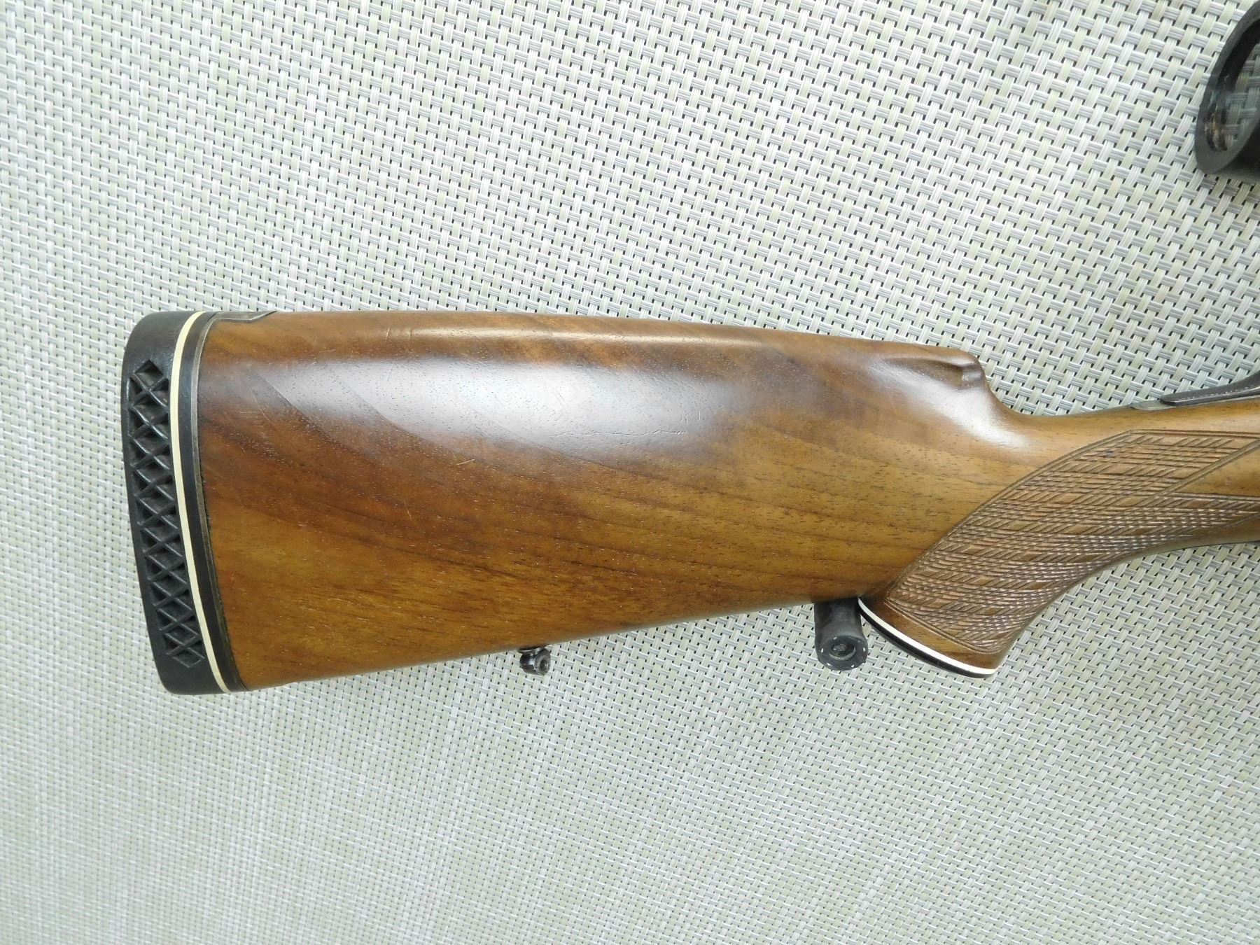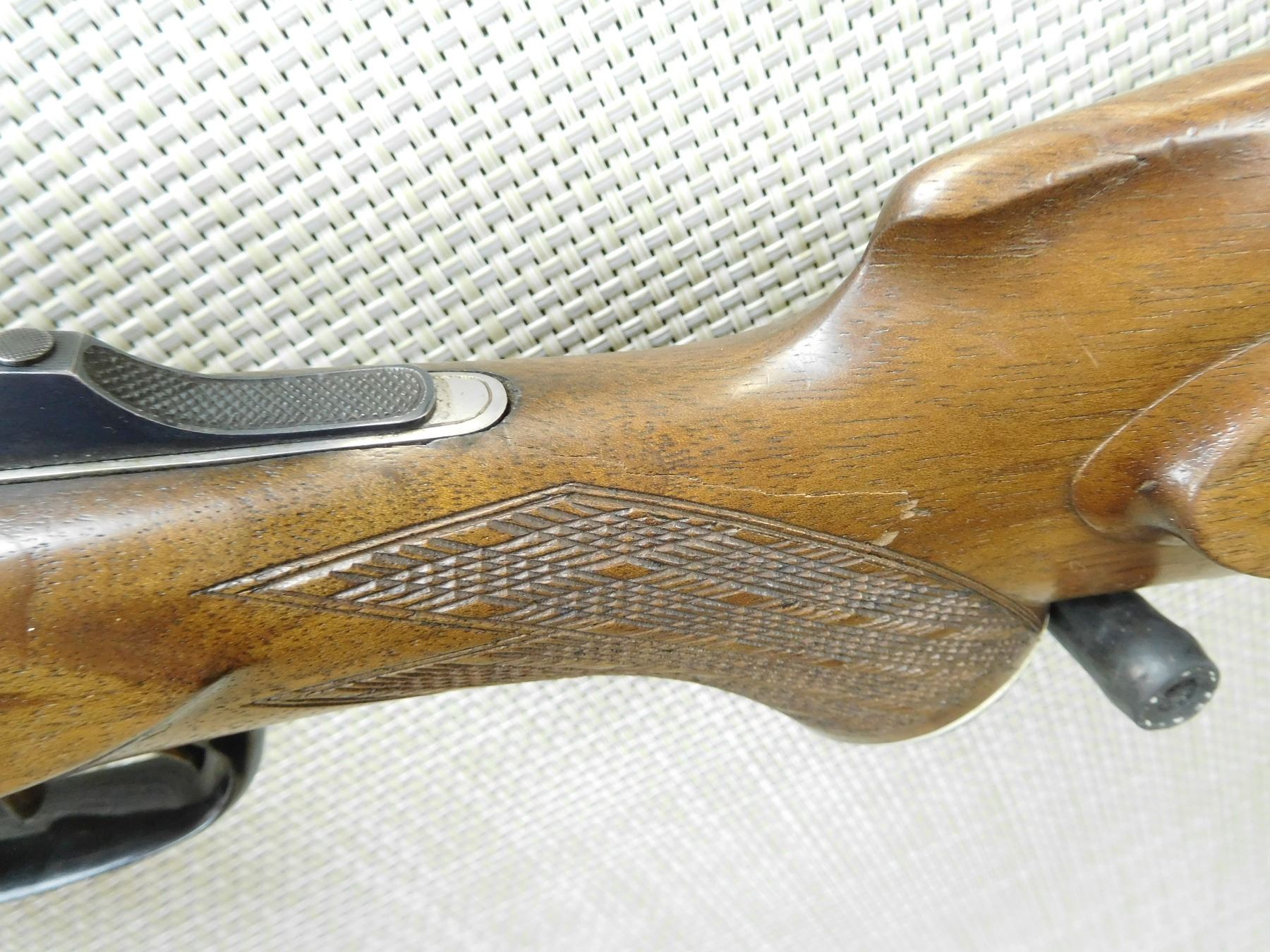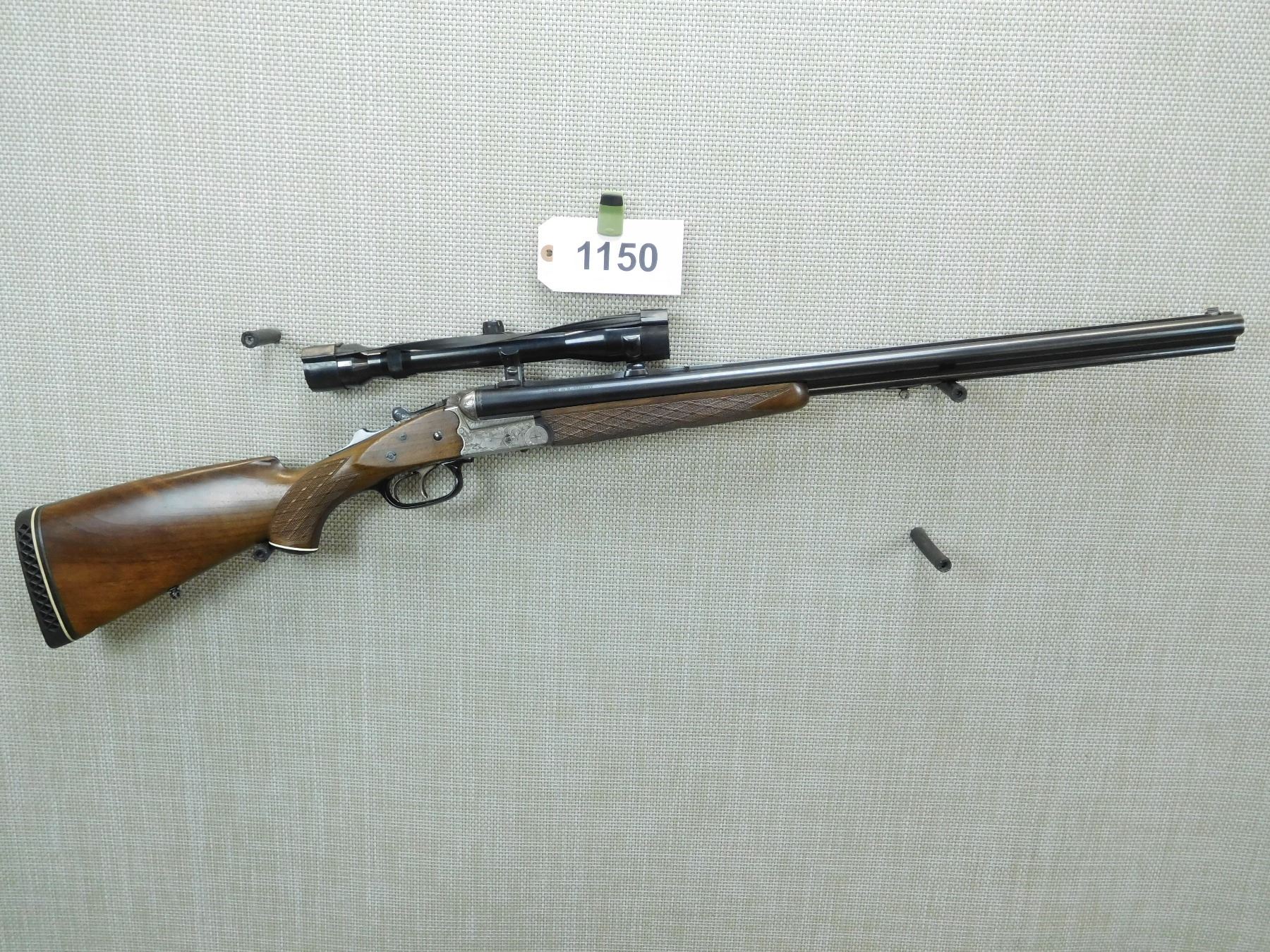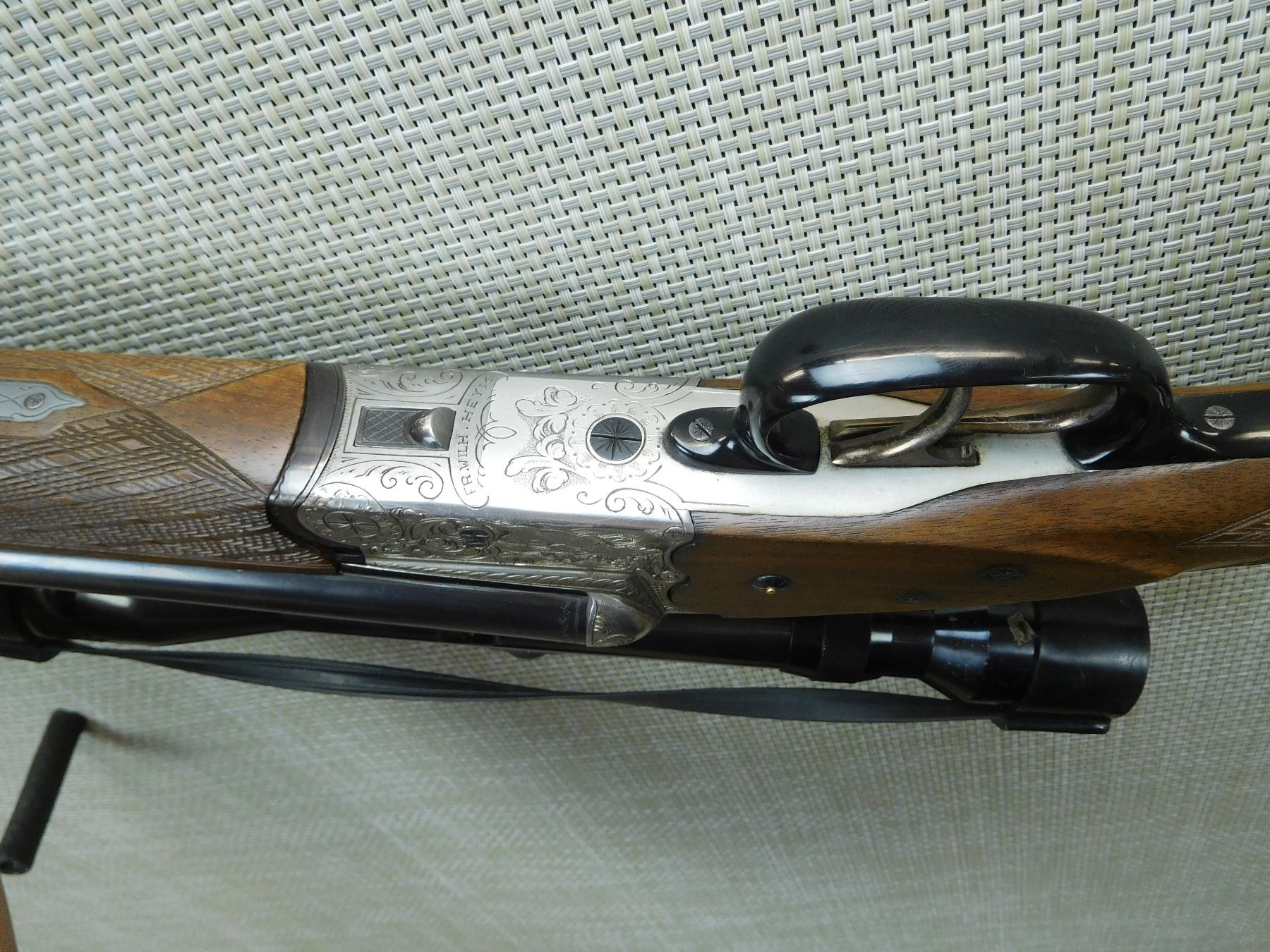 COMES WITH LEATHER LEG OF MUTTON CASE LEATHER SLING AND SCOPE CASE, THERE IS A CRACK IN STOCK, SLING SWIVEL LOOPS, CLAW MOUNT HEYM SCOPE WITH BIKINI LENS COVERS, CLAW MOUNT SCREW IS MARRED, RETAINS ORIGINAL SIGHTS, RICHLY ENGRAVED GAME SCENE RECEIVER, COCKING INDICATORS, CARTRIDGE STORAGE IN BUTT STOCK, CHECKERED FOREND AND CAPPED PISTOL GRIP BUTT STOCK WITH VENTED RUBBER RECOIL PAD, ACTION IS TIGHT, GREENER TYPE SAFETY, BORES ARE EXCELLENT , SERIAL # 976 , ACTION: DRILLING HINGED BARREL , BARREL LENGTH: 25" , CONDITION: 6/10 , STOCK # 7506 , CLASS: CANADIAN NON RESTRICTED CLASS