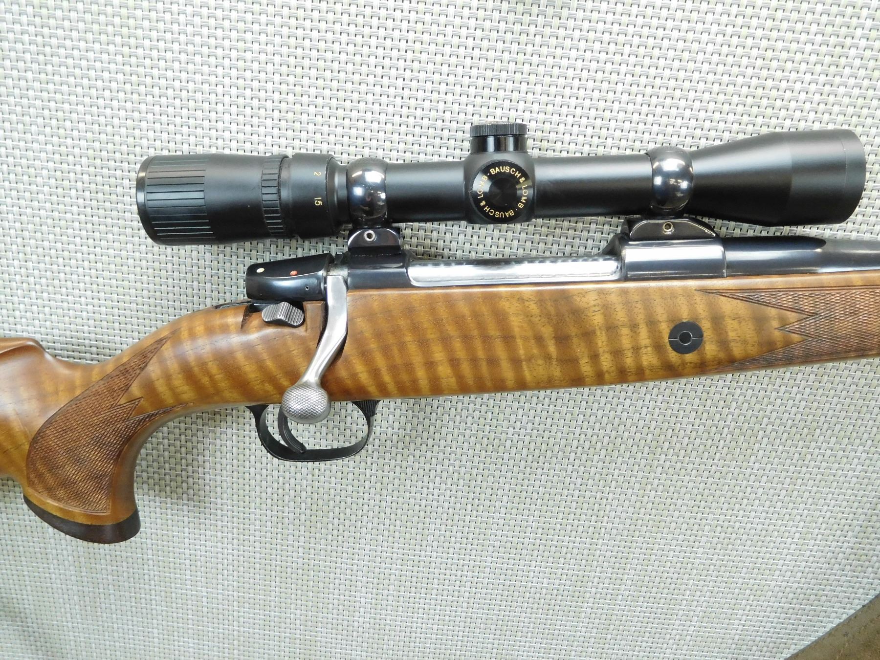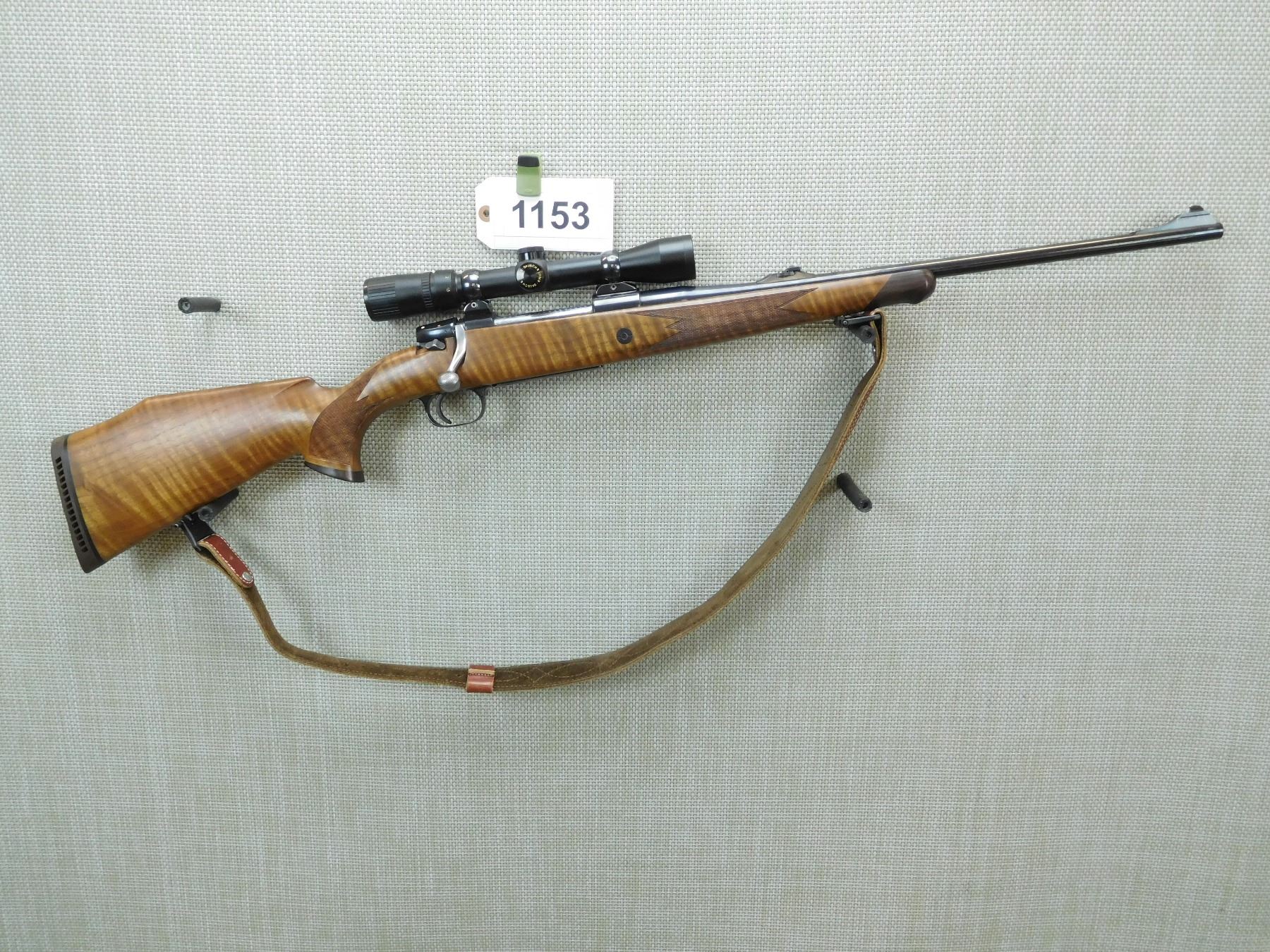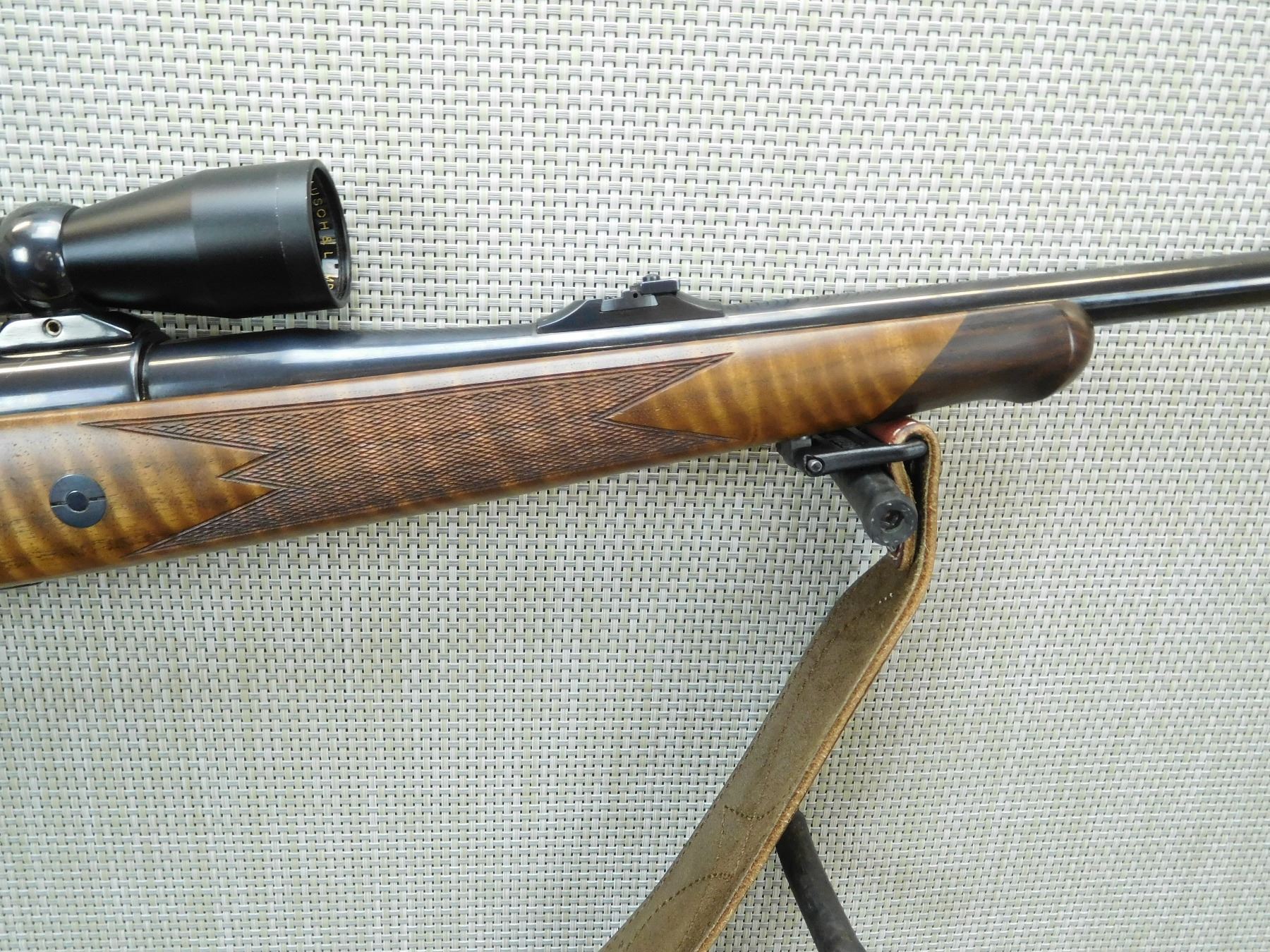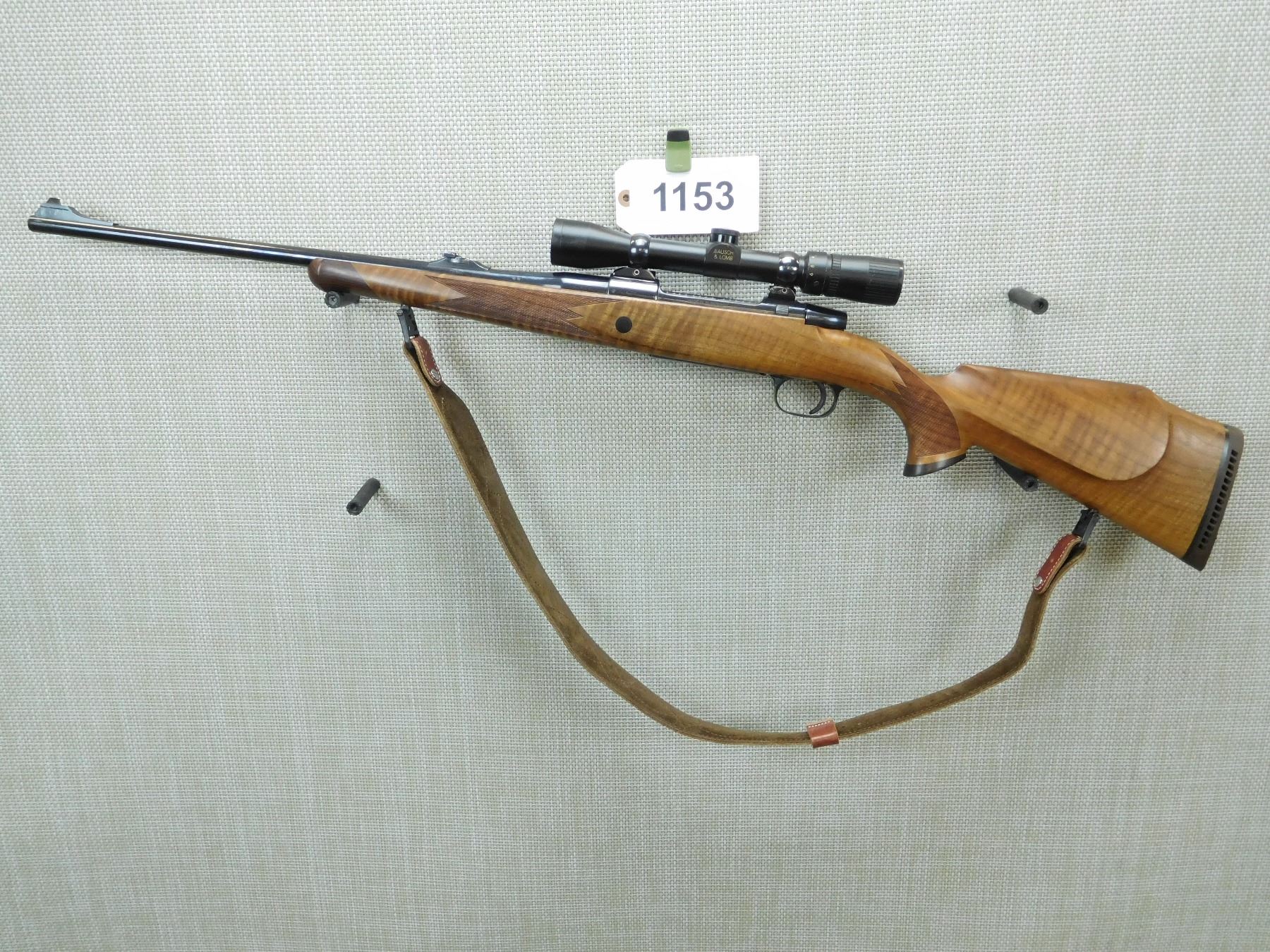 COMES WITH A BAUSH AND LOMBE SCOPE, HINGED FLOOR PLATE, RAMP FRONT AND FLIP ADJUSTABLE REAR SIGHT, CHECKERED FOREND AND CHECKERED CAPPED PISTOL GRIP BUTT STOCK, VENTED RUBBER RECOIL PAD, CHECKERED BOLT KNOB, LEATHER SLING WITH DETACHABLE SLING SWIVELS, SHOWS SOME HANDLING MARKS, EXCELLENT BORE , SERIAL # 21475 , ACTION: BOLT ACTION RIFLE , BARREL LENGTH: 21" , CONDITION: 8/10 , STOCK # 7509 , CLASS: CANADIAN NON RESTRICTED CLASS