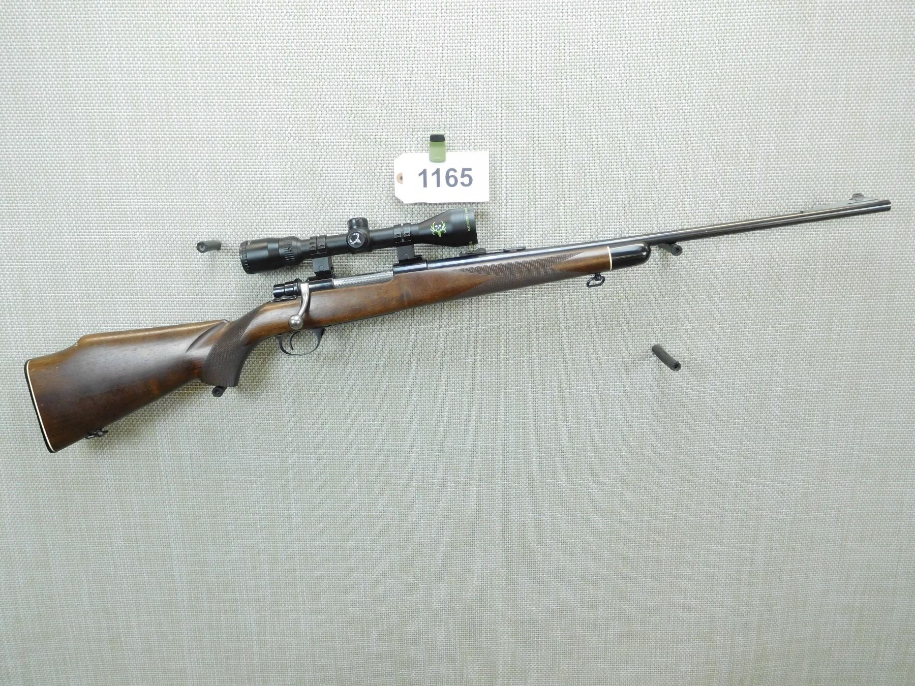 HAS A HINGED FLOOR PLATE, BONE COLLECTOR 3 - 9 SCOPE, GOOD BORE, RAISED FRONT AND ADJUSTABLE REAR SIGHT, CHECKERED FOREND AND CHECKERED PISTOL GRIP STOCK WHICH IS MISSING THE PISTOL GRIP CAP, RAISED CHEEK PIECE ON BUTT STOCK WITH PLASTIC BUTT PLATE, SHOWS SOME HANDLING MARKS , SERIAL # 173805 , ACTION: BOLT ACTION REPEATER RIFLE , BARREL LENGTH: 24" , CONDITION: 8/10 , STOCK # 7521 , CLASS: CANADIAN NON RESTRICTED CLASS