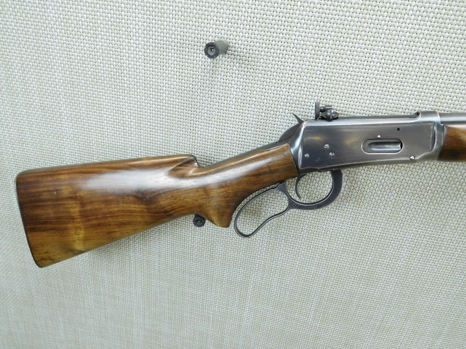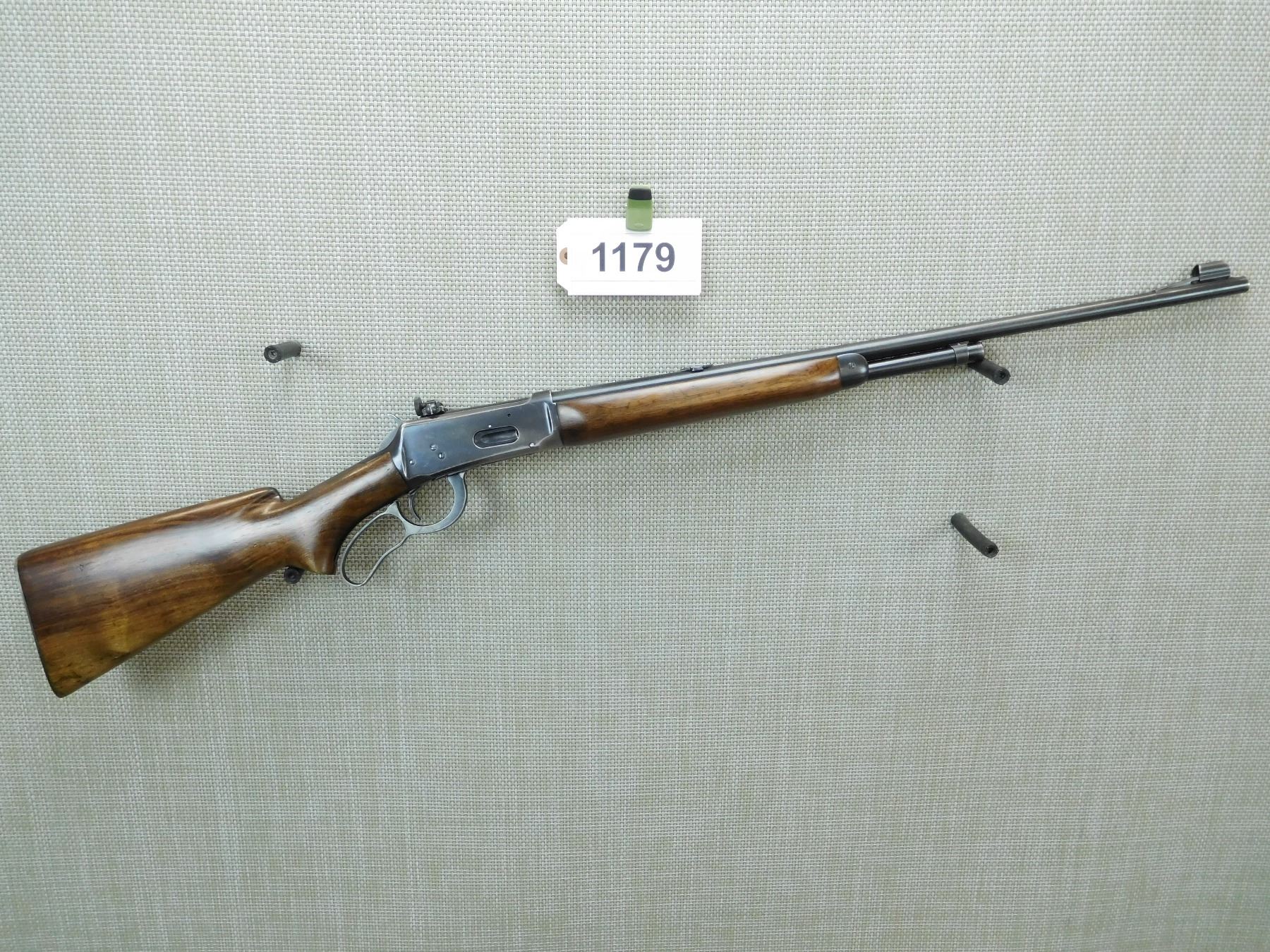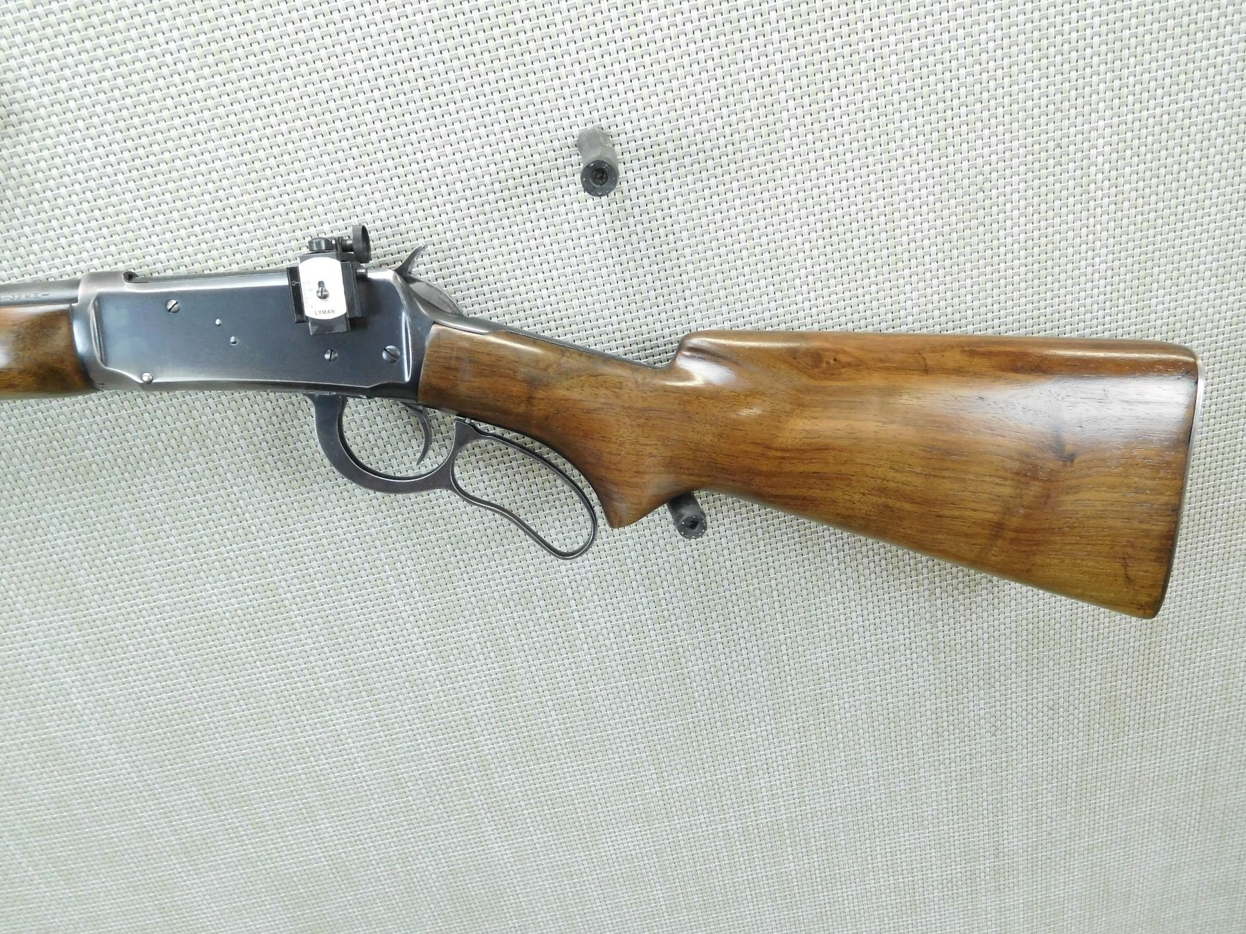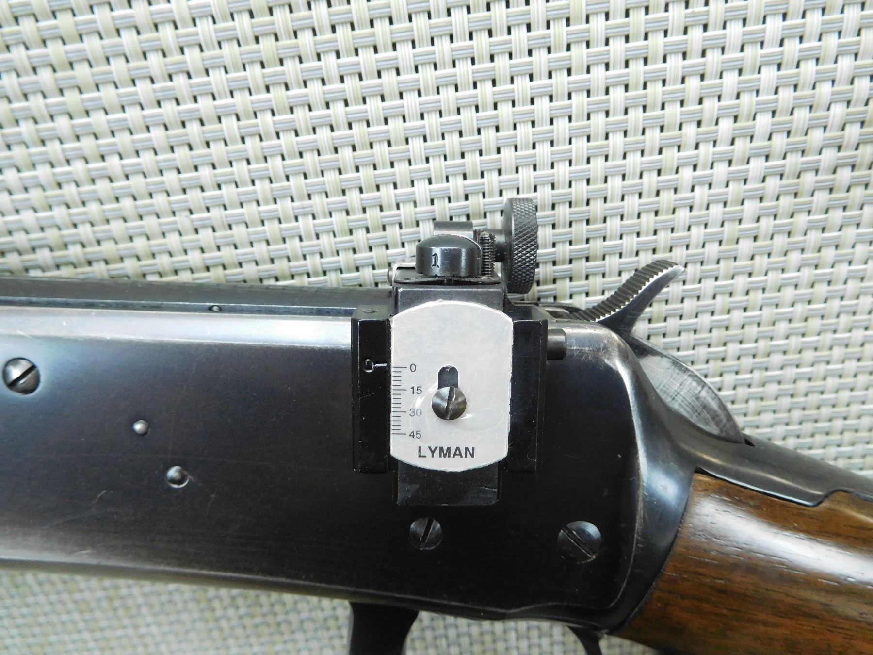 COMES WITH ORIGINAL REAR SIGHT (NOT ATTACHED) GOOD BORE, HOODED FRONT SIGHT AND LYMAN REAR PEEP SIGHT, STEEL BUTT PLATE, SHOWS SOME HANDLING MARKS , SERIAL # 1405874 , ACTION: LEVER ACTION RIFLE , BARREL LENGTH: 24" , CONDITION: 7/10 , STOCK # 7535 , CLASS: CANADIAN NON RESTRICTED CLASS