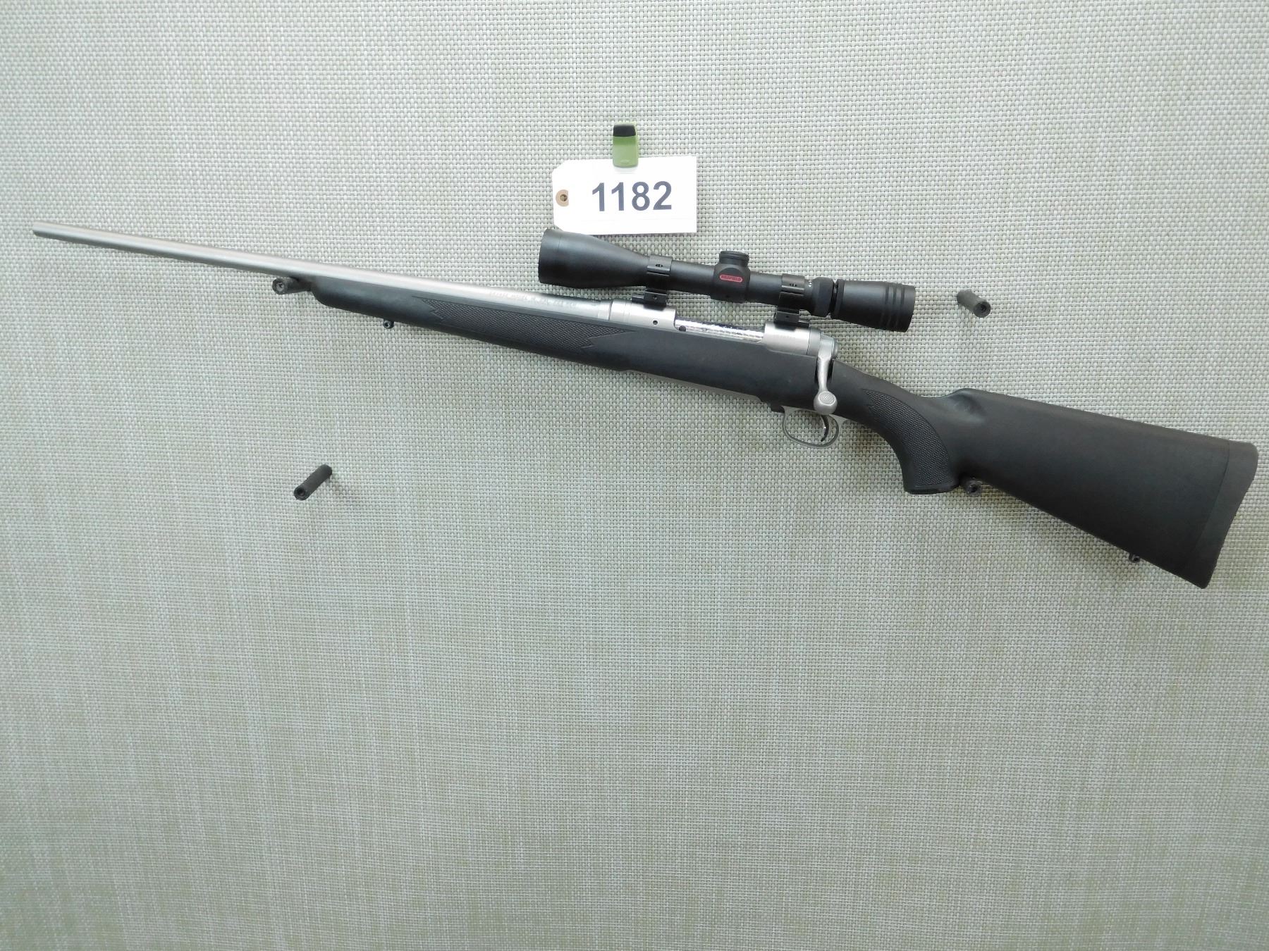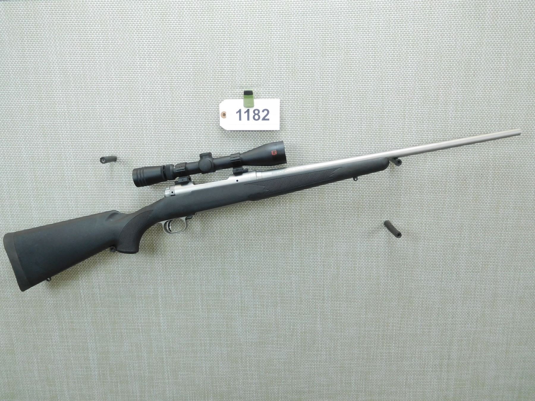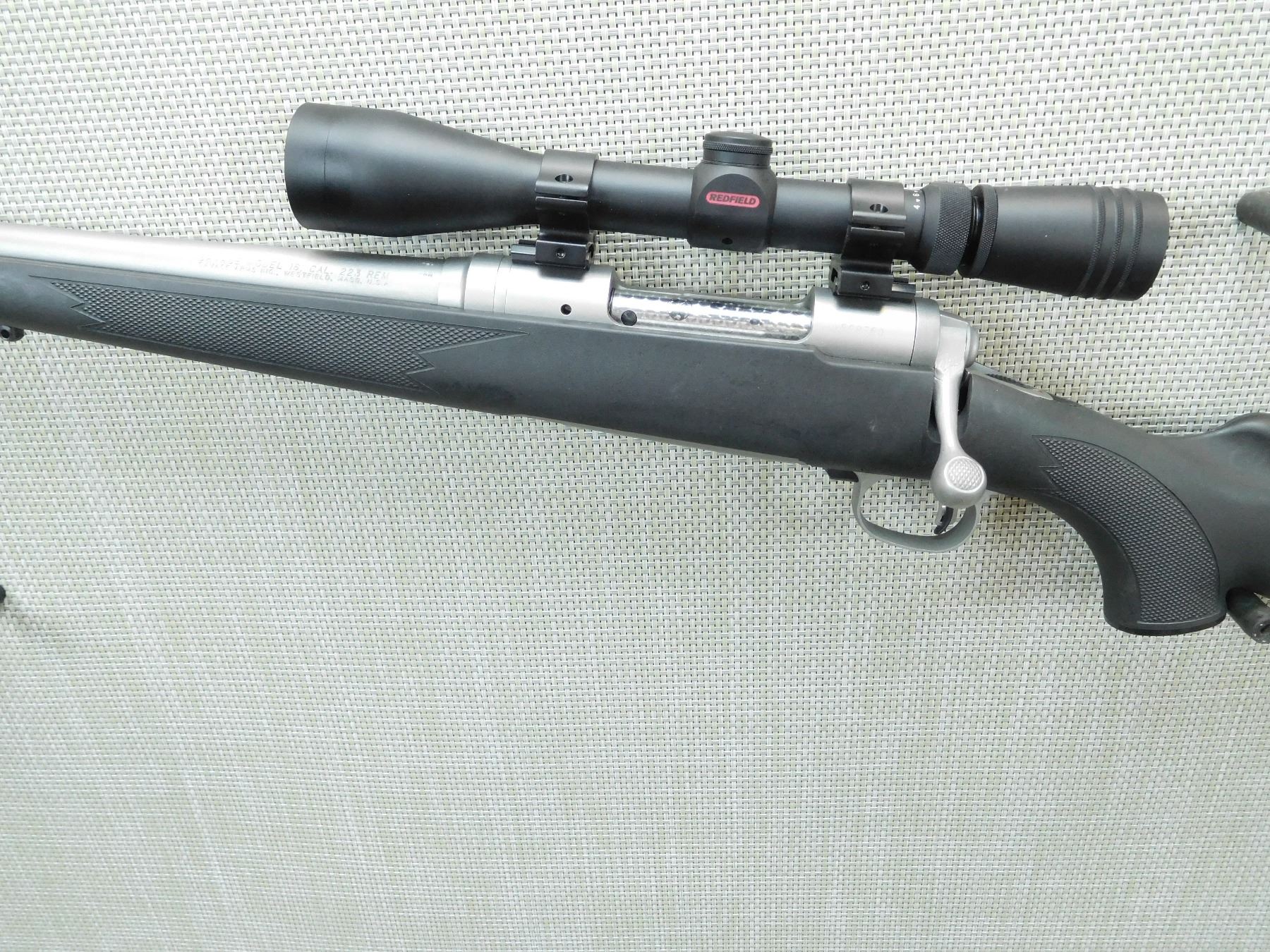 VERY GOOD BORE, SLING SWIVEL STUDS, CHECKERED SYNTHETIC STOCK WITH CAPPED PISTOL GRIP AND RUBBER RECOIL PAD, MATTE STAINLESS STEEL BARREL WITH JEWLED BOLT, REDFIELD 4 -12 SCOPE, ADJUSTABLE TRIGGER, HINGED FLOOR PLATE, EXCELLENT BORE , SERIAL # H598760 , ACTION: BOLT ACTION RIFLE , BARREL LENGTH: 22" , CONDITION: 9/10 , STOCK # 7538 , CLASS: CANADIAN NON RESTRICTED CLASS