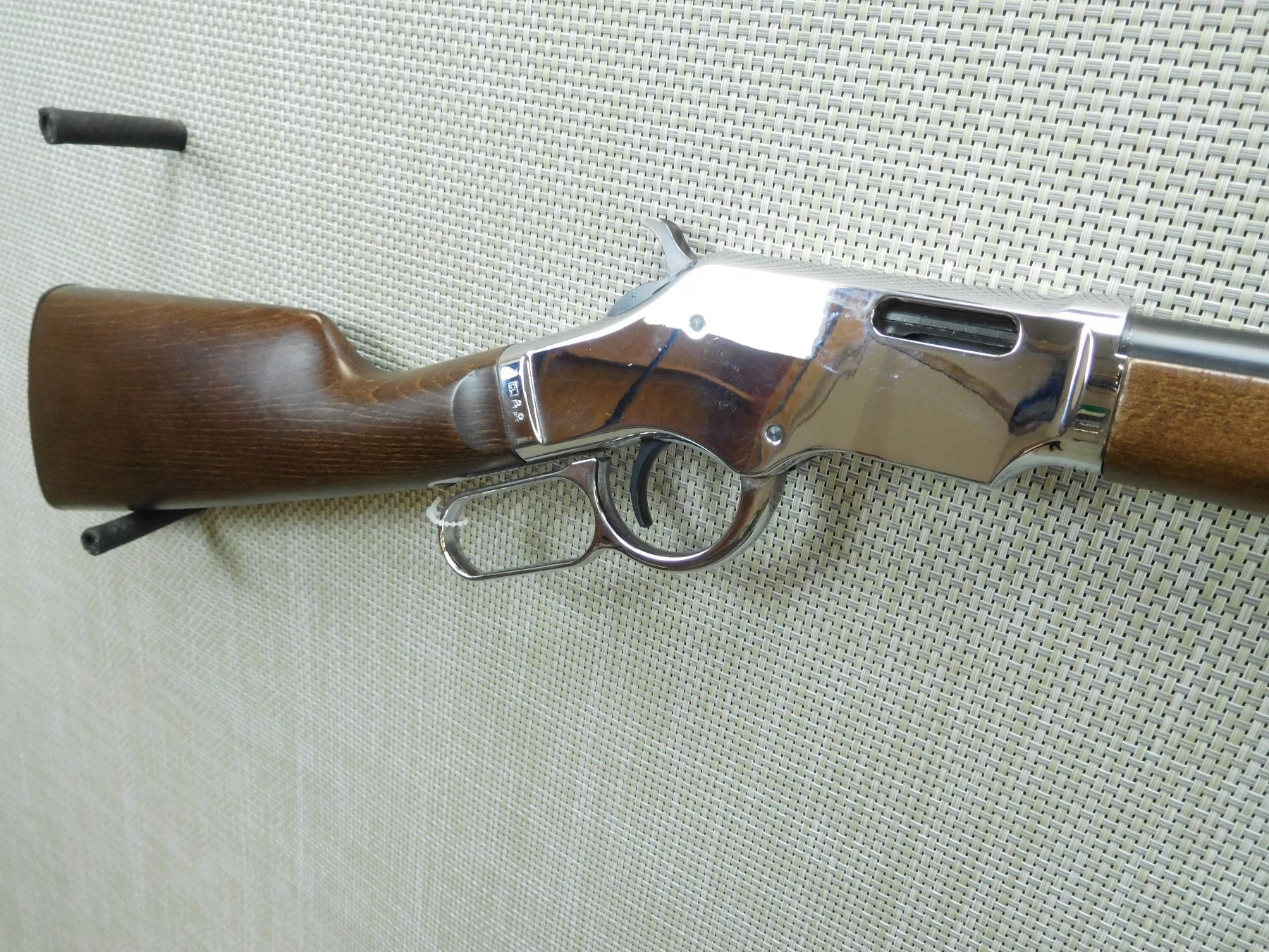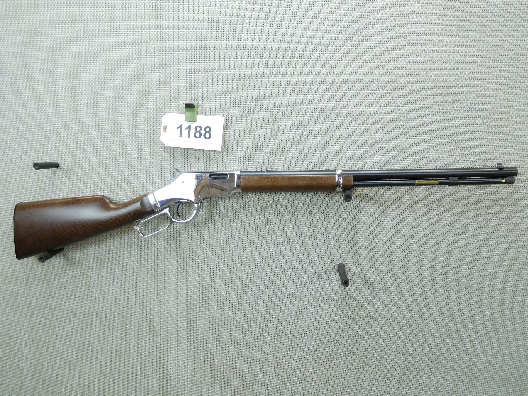 MANUFACTURED BY A UBERTI ITALY, DRILLED AND TAPPED FOR SCOPE MOUNTS, DOVETAIL FRONT AND FIXED REAR SIGHTS, BORE IS VERY GOOD, CHROMED RECEIVER, LEVER AND BARREL BANDS, CASE HARDENED HAMMER, PLASTIC BUTT PLATE , SERIAL # 19065 , ACTION: LEVER ACTION RIFLE , BARREL LENGTH: 18 1/2" , CONDITION: 9/10 , STOCK # 7544 , CLASS: CANADIAN NON RESTRICTED CLASS