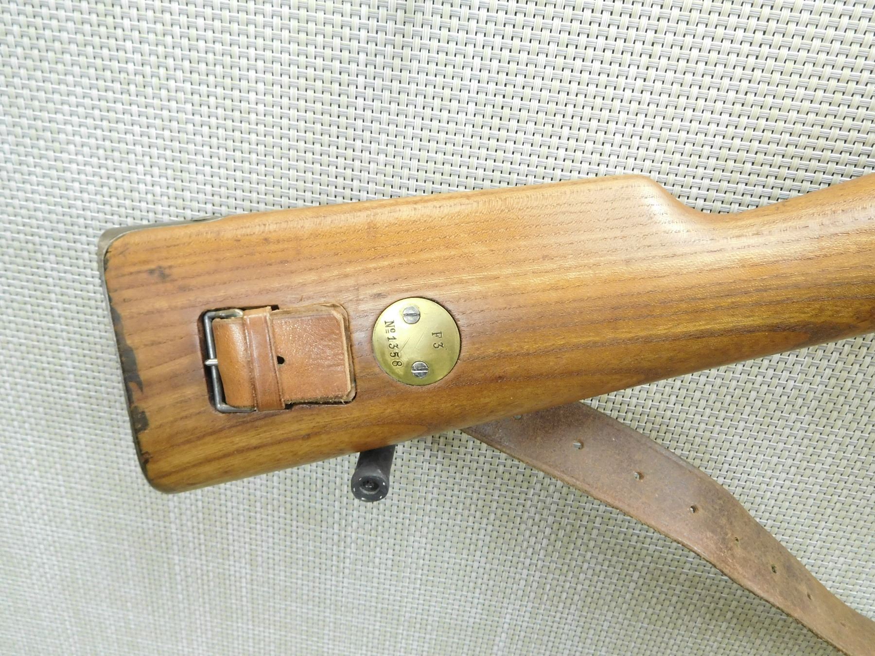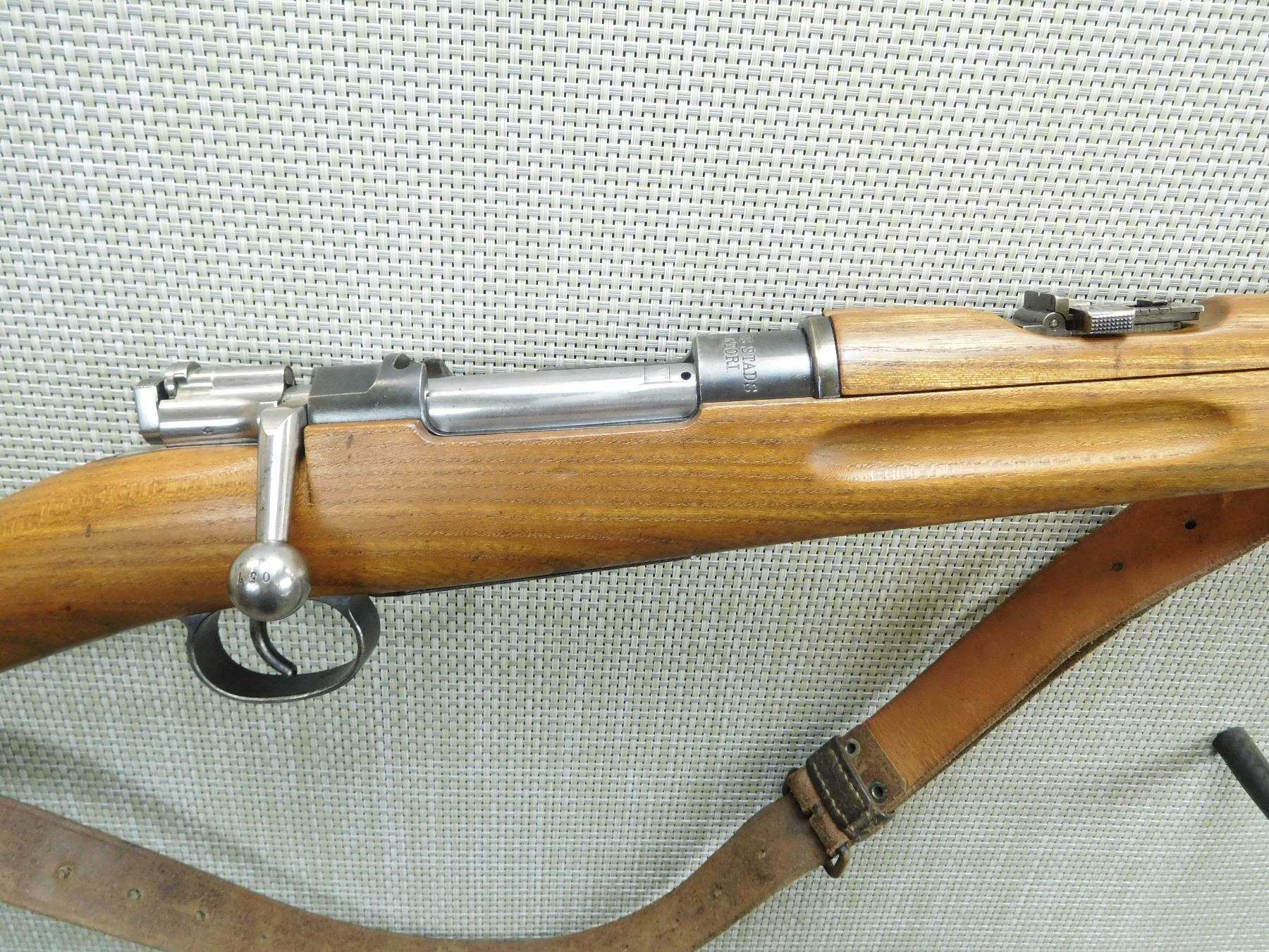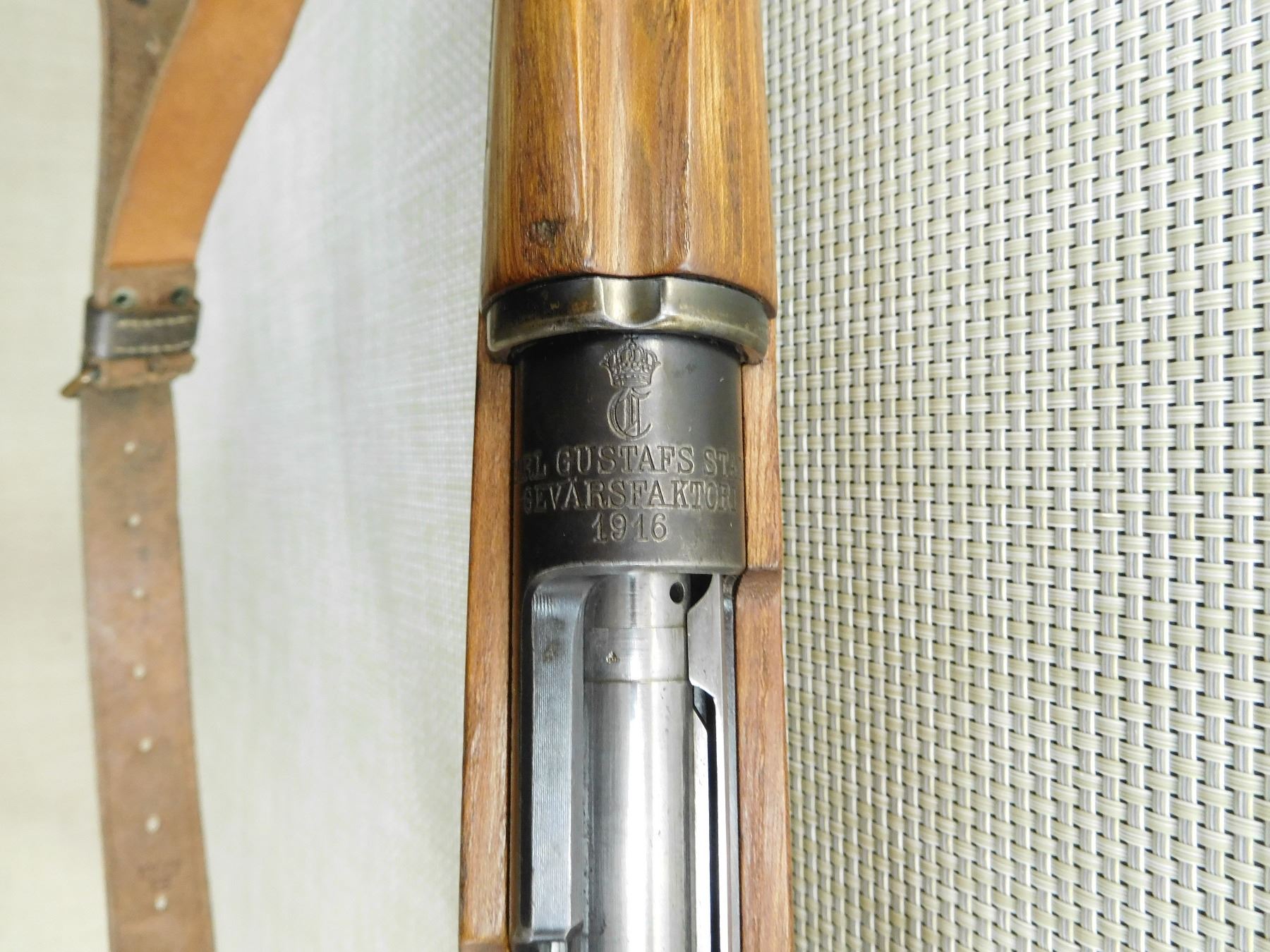 SWEDISH MADE BY CARL GUSTAFF, MANUFACTURED 1916, ROYAL GUARD CARBINE, PREMIUM WOOD, ALL NUMBERS ARE MATCHING, ORIGINAL SLING, EXCELLENT BORE, BARLEY CORN FRONT AND FULL ADJUSTABLE REAR SIGHT, FEATURES A MANNLICHER STYLE STOCK, AS NEW , SERIAL # 68057 , ACTION: BOLT ACTION RIFLE , BARREL LENGTH: 18" , CONDITION: 9/10 , STOCK # 7551 , CLASS: CANADIAN NON RESTRICTED CLASS